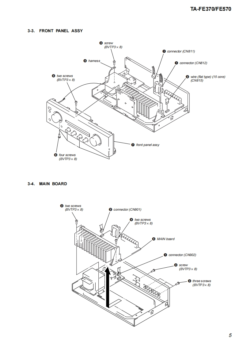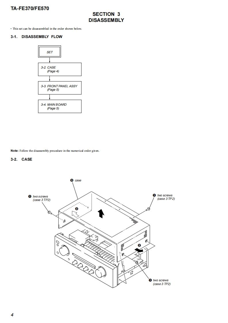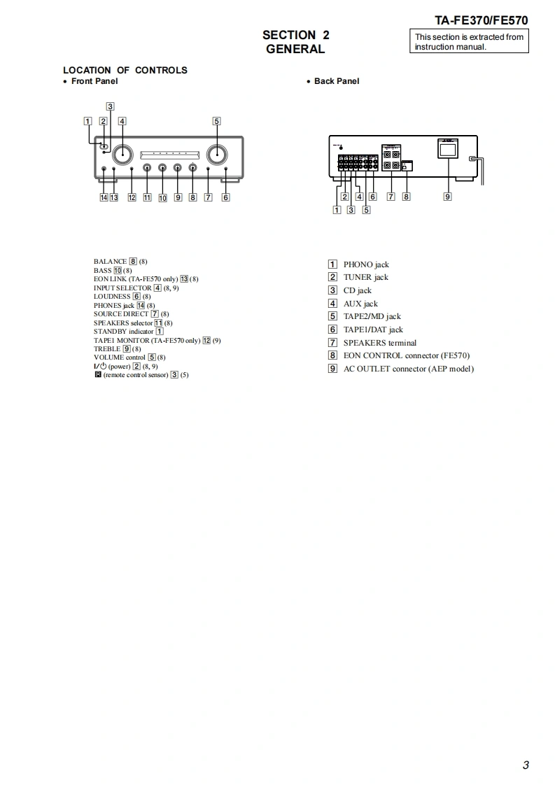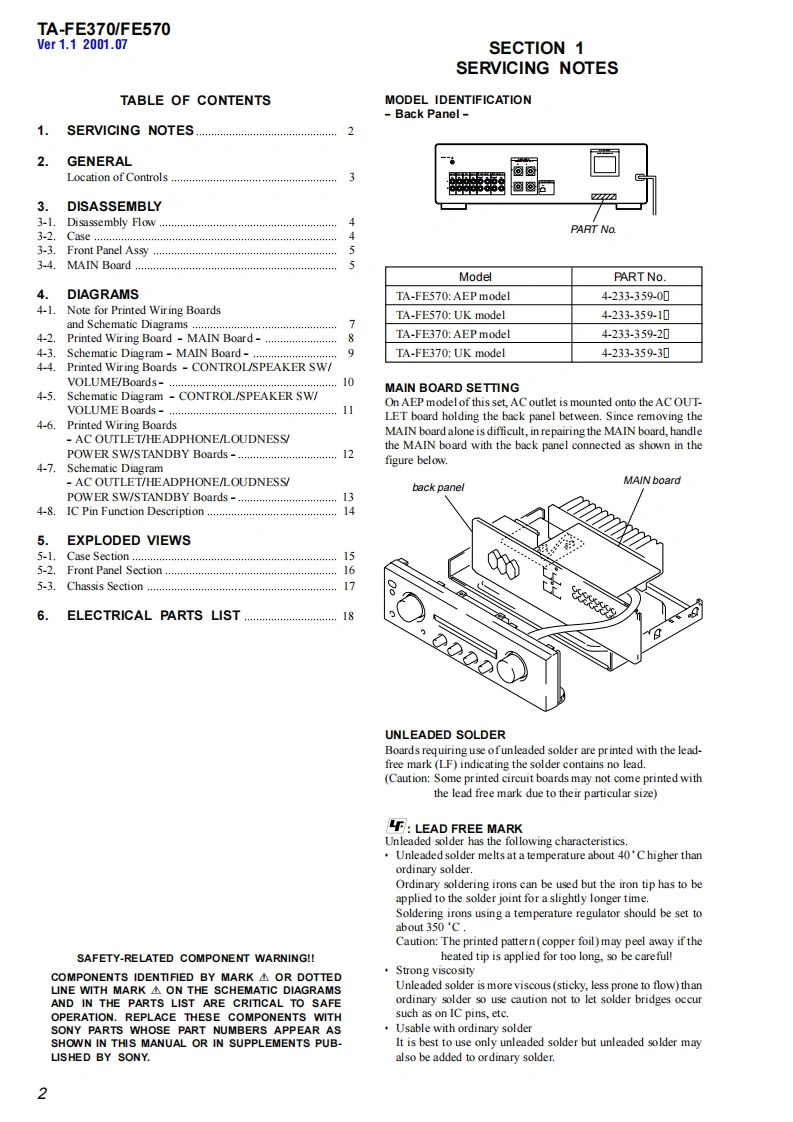 TA-FE370/FE570SERVICE MANUALAEP ModelUK ModelVer.1.22006.02Photo:TA-FE570SPECIFICATIONSAmplifier sectionGeneralDIN power outputSystemTA-FE570:110W+110WPower amplifier with all stages directly coupled(4 ohms at 1 kHz)Preamplifier:Low-noise,equalizerTA-FE37070W+70wamplifier(4 ohms at 1 kHz)Power requirements230 VAC.50/60 Hz±l.0dB190WTUNER,CD,AUX,TAPEI/DAT,TAPE2/MD:TA-FE370:160w7Hz-70 kHz dB06W(In standby mode)S/N(network A)PHONO:80dBDimensions (approx.)(w/h/d)TUNER,CD,AUX,TAPEI/DAT,TAPE2/MD:430x135x310mm106dBincl.projecting parts andcontrolsRt2trolageimpeda8,200mV,1 kilohmMass(approx.)PHONES:5 mW (at 8 ohms)TA-FE570:6.5kgTA-FE370:5.5kgSpeakers impedance 4-16 ohmsSupplied accessoriesDamping factor80(8 ohms,1 kHz)Remote commander (remote)RM-S325 (1)Sony batteries R6(size-AA)(2)INTEGRATED STEREO AMPLIFIER9-873-838-13Sony Corporation2006B05-1Home Audio Division©2006.02Published by Sony Techno Create CorporationSONY