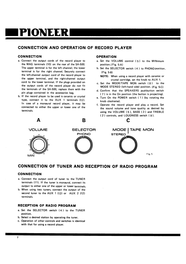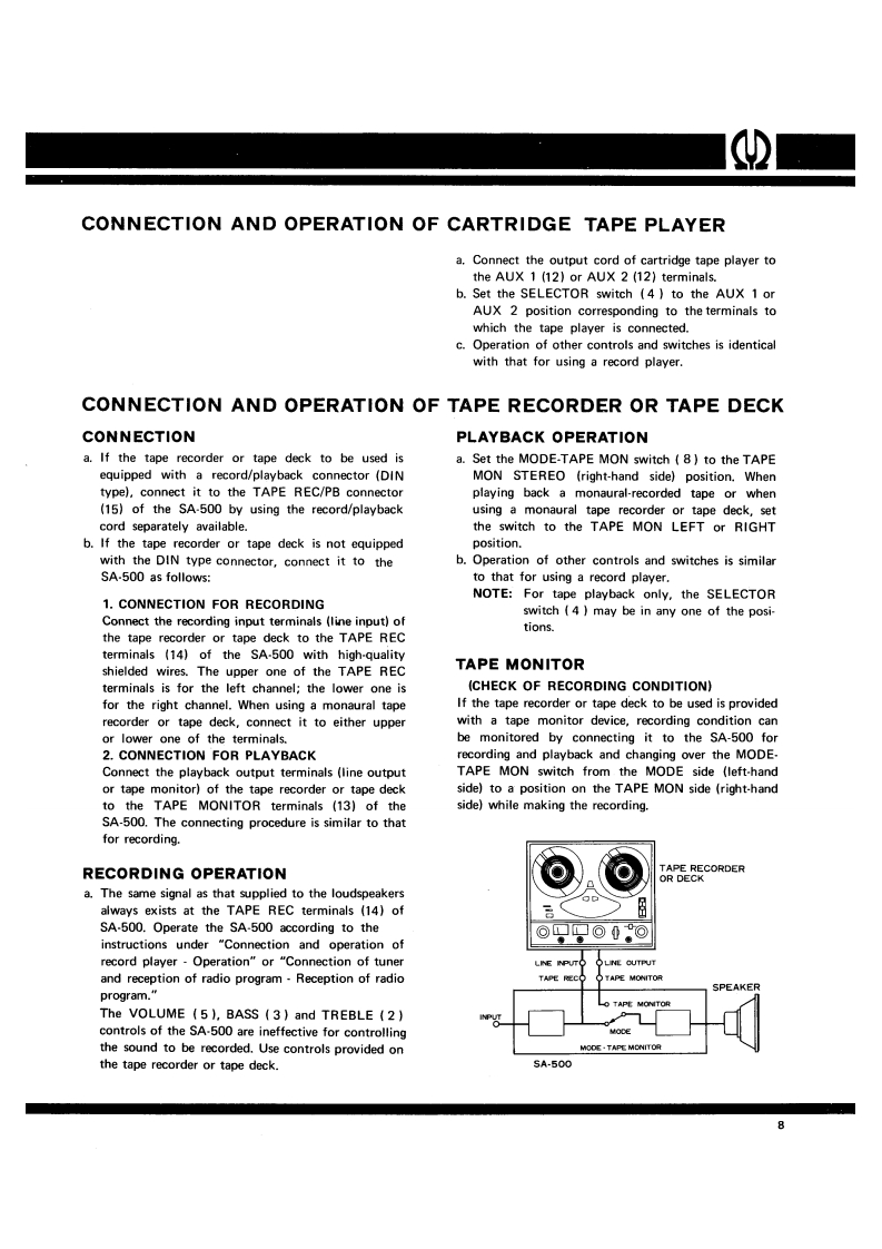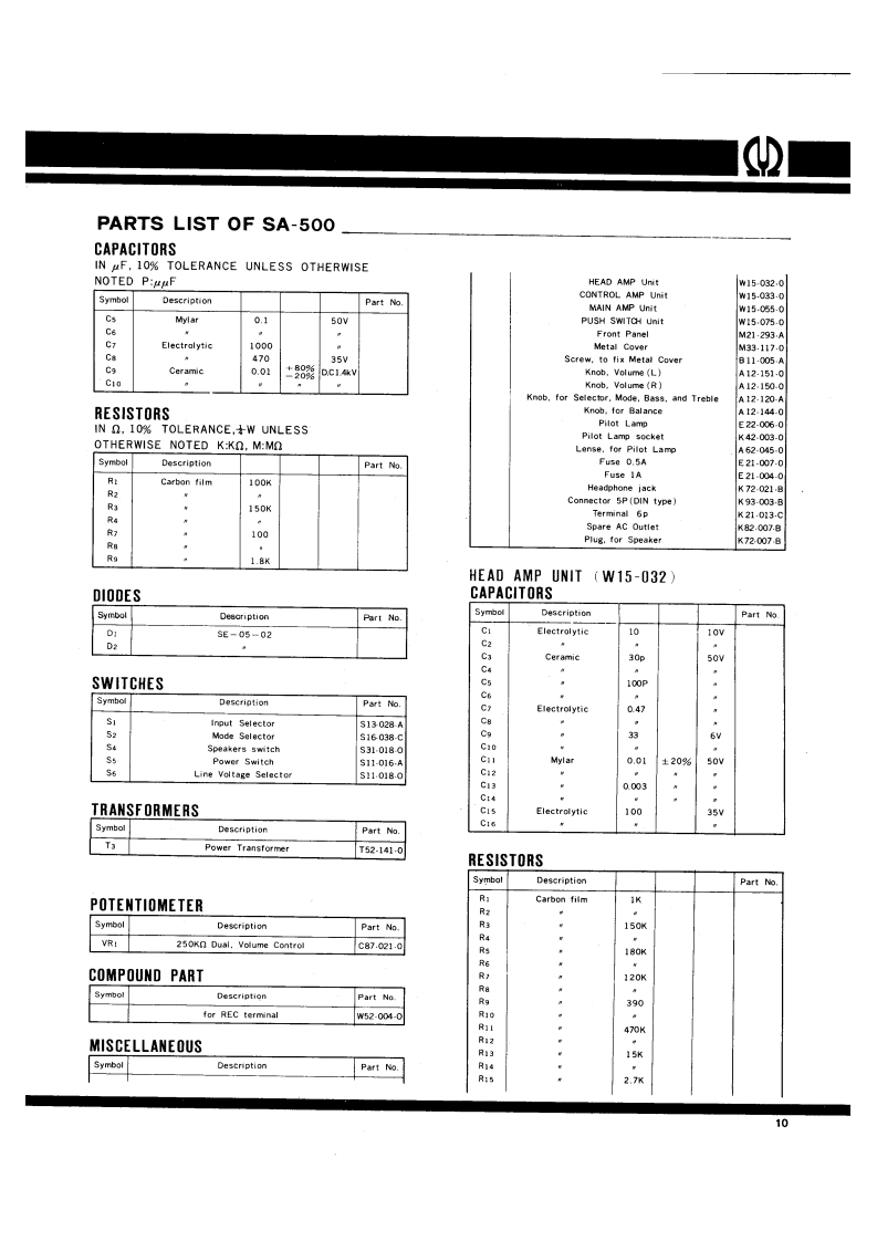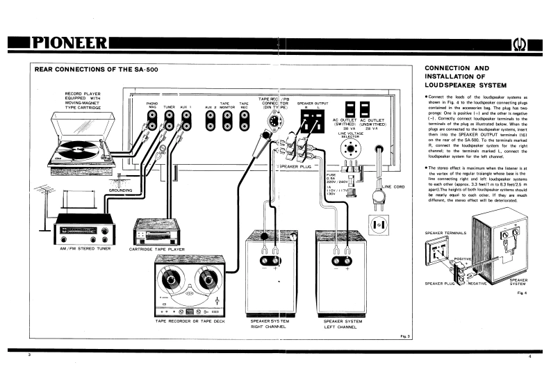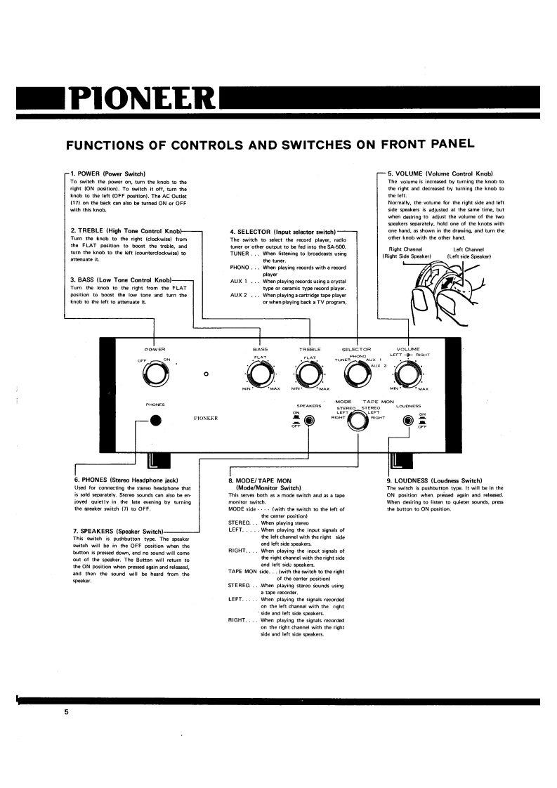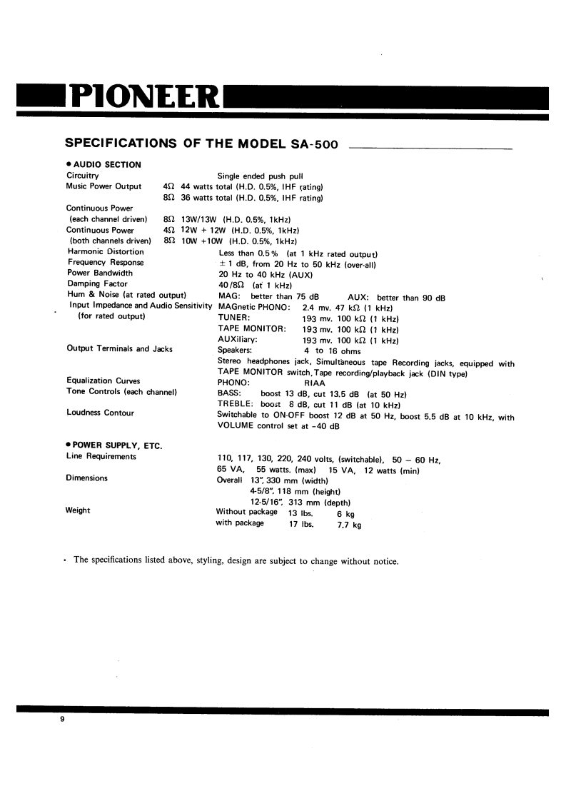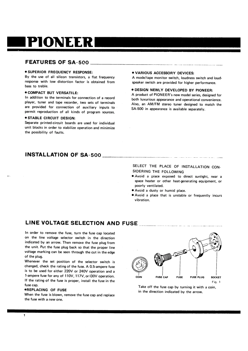 PIONEERSOLID STATE STEREO AMPLIFIERMODELSA-500CAUTIONBefore connecting the line cord to the wall socket,carefullyread and follow the instructions described below,to assurethe safety of your unit..Model SA-500 is set for 240V operation when shipped.If this unit is used in a different line-voltage area,read andfollow "LINE VOLTAGE SELECTION AND FUSE"onpage 1.Be sure that the line voltage setting on yourunit agrees with the line voltage in your area and that thefuse installed in your unit is a proper one.INSTALLATION,OPERATING AND SERVICE MANUALincluding PARTS LIST,CIRCUIT DIAGRAMS,AND MOUNTING TEMPLATE.(FV)PIONEER ELECTRONIC CORPORATION