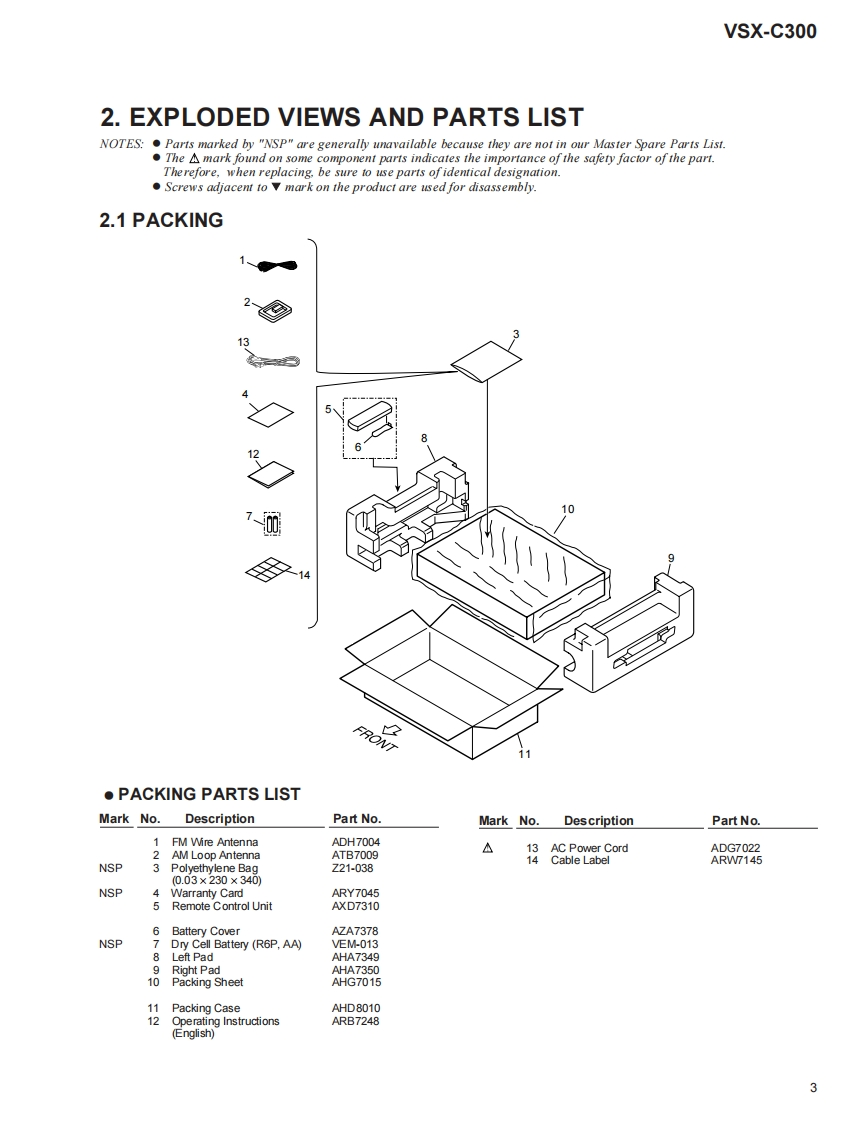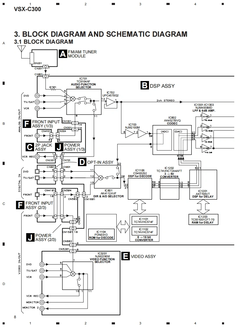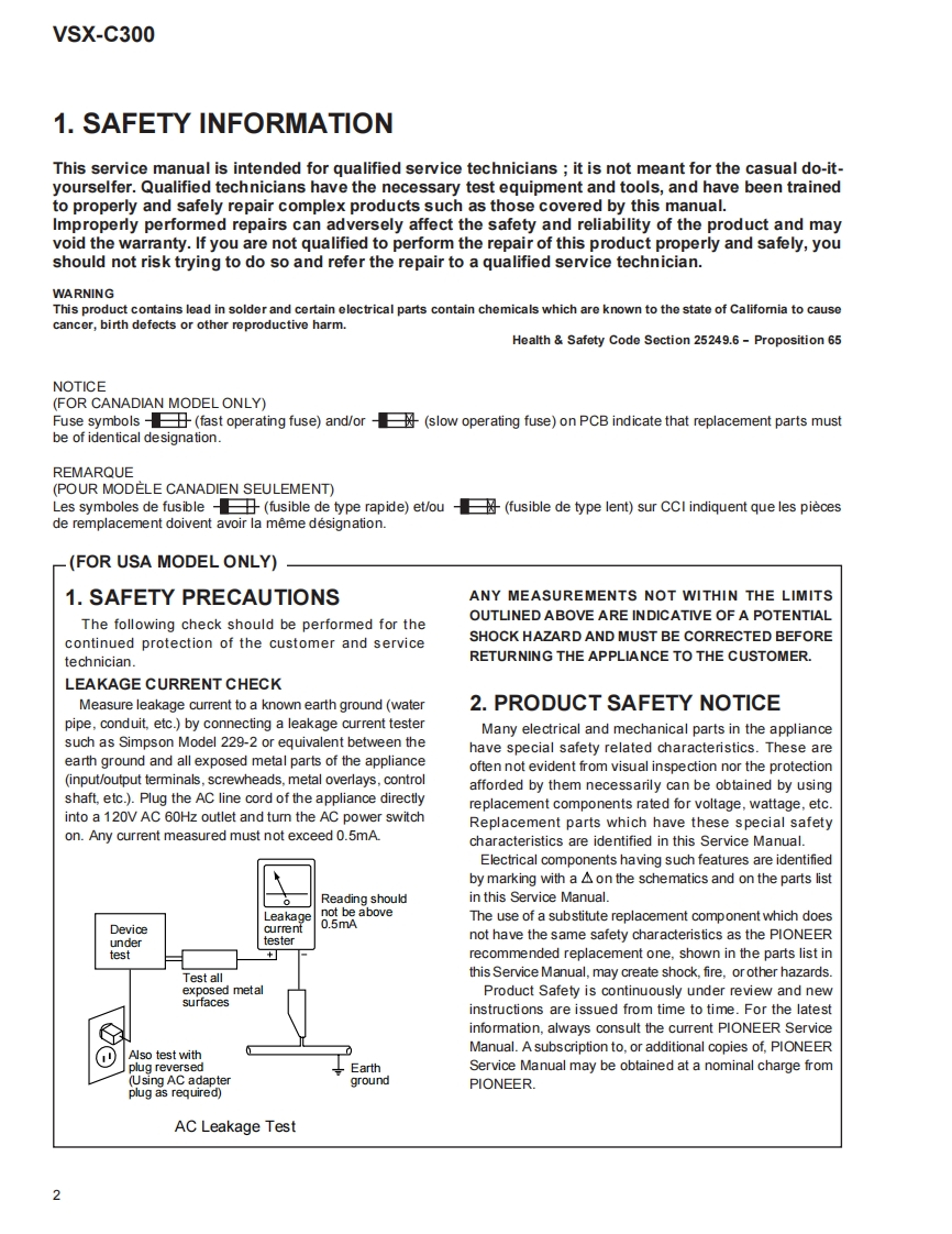Pioneer sound.vision.soulServiceManualORDER NO.]88886RRV2524AUDIONIDEO MULTI-CHANNEL RECEIVERVSX-C300THIS MANUAL IS APPLICABLE TO THE FOLLOWING MODEL(S)AND TYPE(S).ModelTypePower RequirementRemarksVSX-C300KUXJI/CAOAC120VCONTENTS1.SAFETY INFORMATION27.GENERAL INFORMATION512.EXPLODED VIEWS AND PARTS LIST...........3513.BLOCK DIAGRAM AND SCHEMATIC DIAGRAM-....87.1.1 Test M0de…514.PCB CONNECTION DIAGRAM327.1.2 Protection of the Amplifier Line.........525.PCB PARTS LIST467.1.3 Operation of the Fan-Control Line.....536.ADJUSTMENT...507.1.4 Specifications of Speaker Detection........547.1.5 Timing Chart…557.2 PARTS…567.2.11C5672.2 DISPLAY…628.PANEL FACILITIES AND SPECIFICATIONS......64PIONEER CORPORATION 4-1,Meguro 1-chome,Meguro-ku,Tokyo 153-8654,JapanPIONEER ELECTRONICS(USA)INC.P.O.Box 1760,Long Beach,CA 90801-1760,U.S.A.PIONEER EUROPE NV Haven 1087,Keetberglaan 1,9120 Melsele,BelgiumPIONEER ELECTRONICS ASIACENTRE PTE.LTD.253 Alexandra Road,#04-01,Singapore 159936CPIONEER CORPORATION 2001T-ZZR SEPT.2001 Printed in Japan