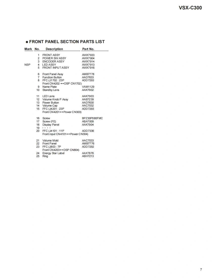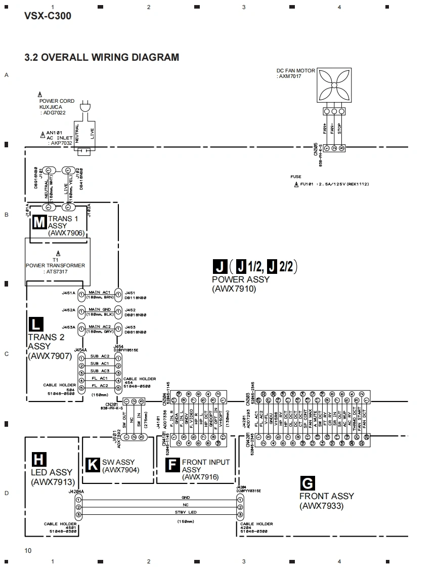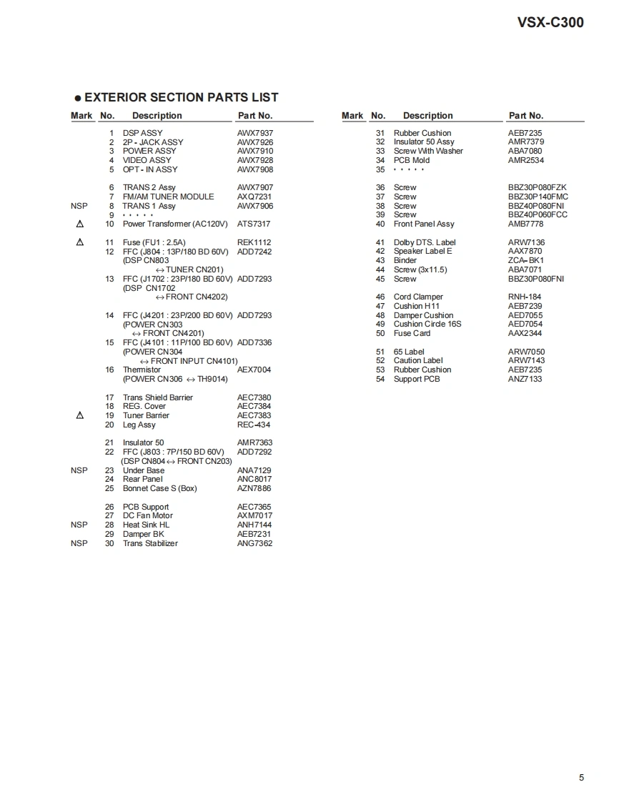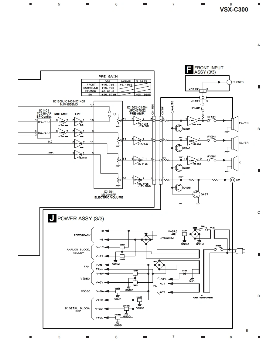Pioneer sound.vision.soulServiceManualORDER NO.]88886RRV2524AUDIONIDEO MULTI-CHANNEL RECEIVERVSX-C300THIS MANUAL IS APPLICABLE TO THE FOLLOWING MODEL(S)AND TYPE(S).ModelTypePower RequirementRemarksVSX-C300KUXJI/CAOAC120VCONTENTS1.SAFETY INFORMATION27.GENERAL INFORMATION512.EXPLODED VIEWS AND PARTS LIST...........3513.BLOCK DIAGRAM AND SCHEMATIC DIAGRAM-....87.1.1 Test M0de…514.PCB CONNECTION DIAGRAM327.1.2 Protection of the Amplifier Line.........525.PCB PARTS LIST467.1.3 Operation of the Fan-Control Line.....536.ADJUSTMENT...507.1.4 Specifications of Speaker Detection........547.1.5 Timing Chart…557.2 PARTS…567.2.11C5672.2 DISPLAY…628.PANEL FACILITIES AND SPECIFICATIONS......64PIONEER CORPORATION 4-1,Meguro 1-chome,Meguro-ku,Tokyo 153-8654,JapanPIONEER ELECTRONICS(USA)INC.P.O.Box 1760,Long Beach,CA 90801-1760,U.S.A.PIONEER EUROPE NV Haven 1087,Keetberglaan 1,9120 Melsele,BelgiumPIONEER ELECTRONICS ASIACENTRE PTE.LTD.253 Alexandra Road,#04-01,Singapore 159936CPIONEER CORPORATION 2001T-ZZR SEPT.2001 Printed in Japan