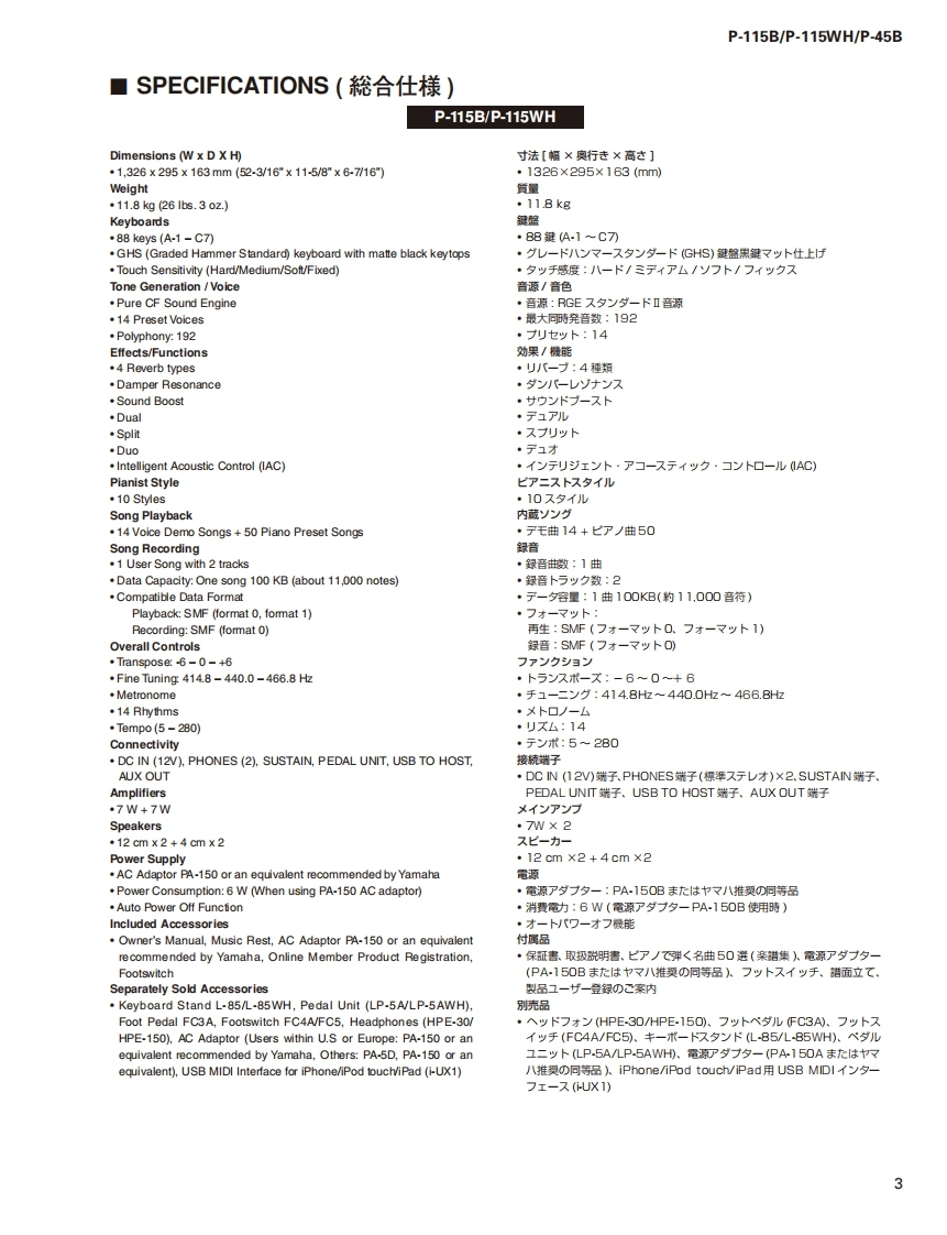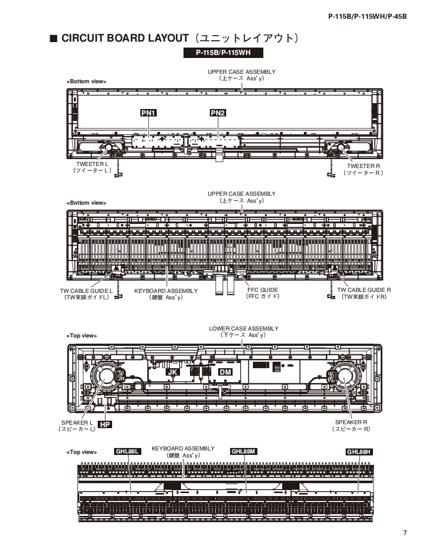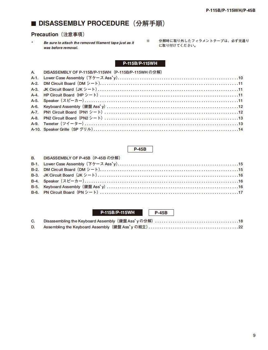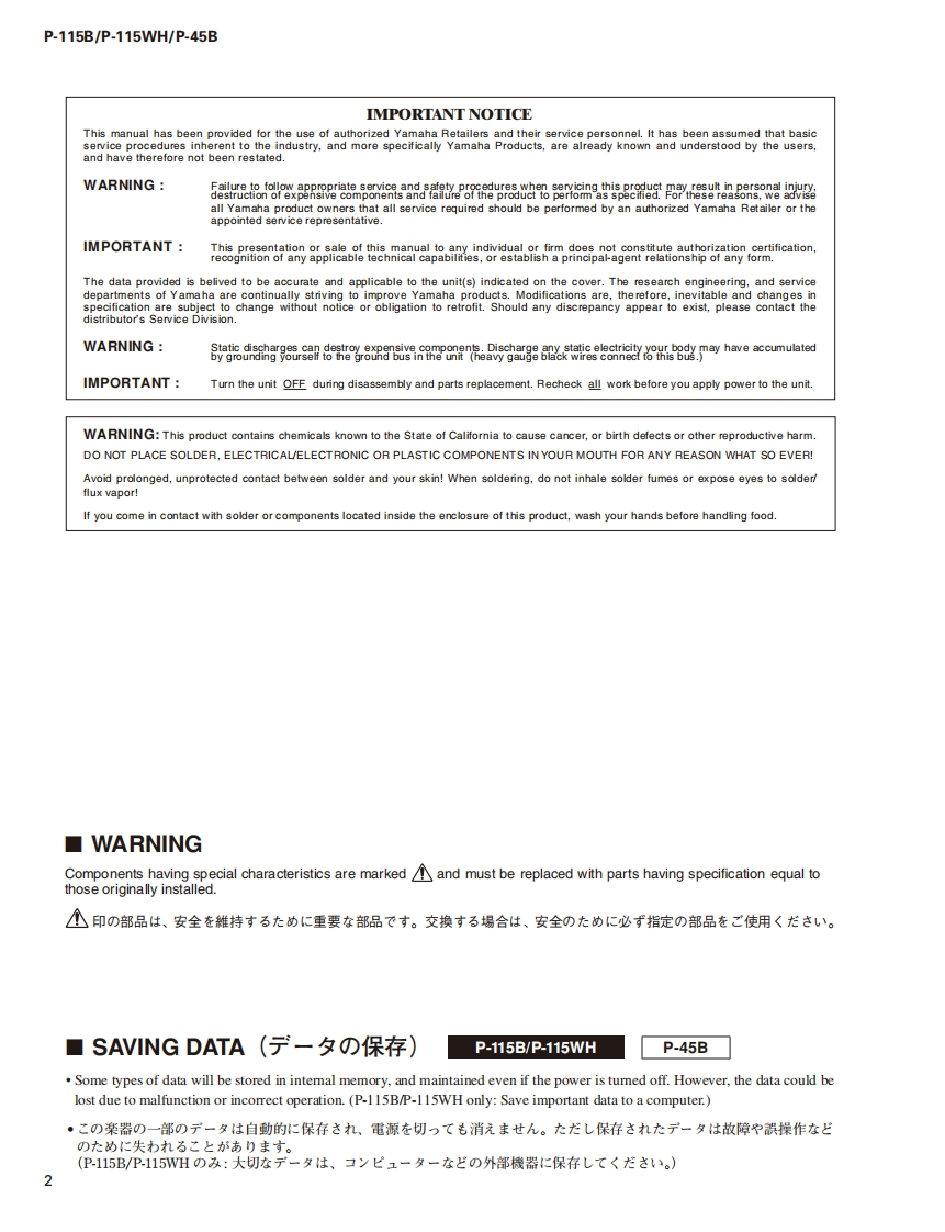 DIGITAL PIANOP-115B/P-115WH/P-45BSERVICE MANUALP.115BP-115WHP.45B■CONTENTS(目次)SPECIFICATIONS(総合仕横)......·...3DATA BACKUP AND INITIALIZINGPANEL LAYOUT(Ur礻儿L亻T7卜).::.5(バy夕了yプ匕初期化).68CIRCUIT BOARD LAYOUT(ユ二y卜レ亻T卜).7USER DATA BACKUPDISASSEMBLY PROCEDURE(分解手順).·...·.9(1-圹-子-夕のy夕了y).......70/71CIRCUIT BOARDS(-卜基板☒)。·...25PARTS LISTTEST PROGRAM(テ又卜プ口5ラA)40/50BLOCK DIAGRAM(ブ口y夕ダ亻T5ラ厶)DM CIRCUIT BOARD CHECK METHODIRING DIAGRAM(基板桔線☒)(DM一卜于工y夕方法).....60/62CIRCUIT DIAGRAM(回路☒)SYSTEM BOOTING FLOWCHART(起動口-于ヤ-卜)...64/66CL001909米YAMAHAHAMAMATSU.JAPANCopyright (c)Yamaha Corporation.All rights reserved.PDF fo'15.02