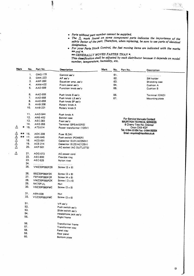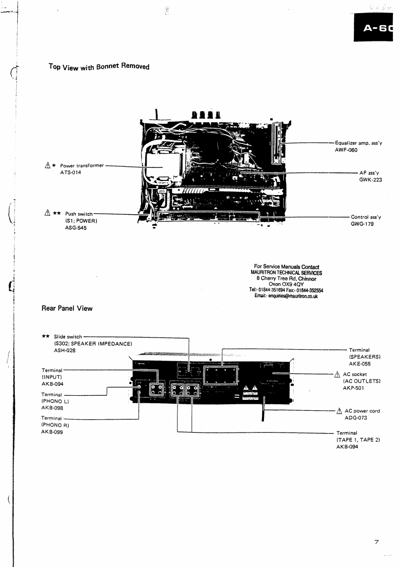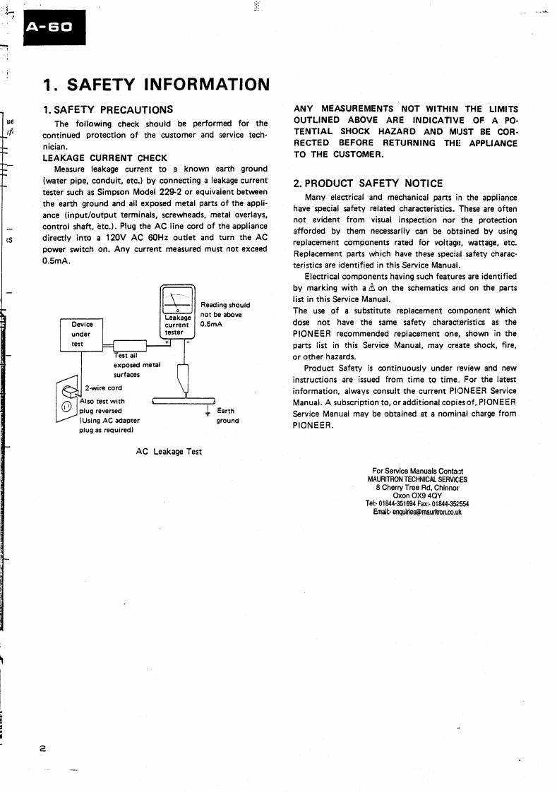 ②PIONEERServiceFor Service Manuals ContactMAURITRON TECHNICAL SERVICES8 Cherry Tree Rd,Chinnorc ManualOxon OX9 40YTek01844351694Faxc.01844-352554Email:-enquiries@mauritron.co.ukCIRCUIT DESCRIPTIONSREPAIR ADJUSTMENTSORDER NO.ARP.318-0STEREO AMPLIFIERA-60MODEL A-60 COMES IN FIVE VERSIONS DISTINGUISHED AS FOLLOWS:TypeVoitageRemarksKUAC120V onlyU.S.A.modelHEAC220V,240V (Switchable)European continent modelHBAC220V,240V (Switchable)United Kingdom modelYPAC240V onlyAustralia modelHEZAC220V,240V (Switchable)West Germany modelAC110V,120V,220V,240V (switchable)General export modelThis service manual is applicable to the KU type.For servicing of the HE,HB,YP and S types,pleaserefer to the pp.27~29.For servicing of the HEZ type,please refer to the additional service manual..Ce manuel d'instruction se refere au mode de reglage,en francais.Este manual de servicio trata del metodo de ajuste escrito en espanol.CONTENTS1.SAFETY INFORMATION.··,··29.SCHEMATIC DIAGRAM...·,··172.SPECIFICATIONS....····310.ELECTRICAL PARTS LIST..·.,·,,·203.FRONT PANEL FACILITIES..···.·,·,·411.PACKING234.PARTS LOCATION612.ADJUSTMENTS5.EXPLOOED VIEW....................8REGLAGE256.BLOCK DIAGRAM10AJUSTE,..·,267.CIRCUIT DESCRIPT1ONS..:....·.·,,.1213.FOR HE,HB AND YP TYPES278.P.C.BOARDS CONNECTION DIAGRAM ..1314.F0 RS TYPE.…29PIONEER ELECTRONIC CORPORATION 4-1.Meguro 1-Chome.Meguro-ku.Tokyo 153.JapanPIONEER ELECTRONICB [UBA]INC.1925 E.Oominguez St..Long Beech.Californa 90810 U.S.A.PIONEER ELECTRONIC [EUROPE]N.V.KeetberIONEER ELECTRONICS AUSTRALIA PTY.LTRS1Z8184 Cum178-184 Boundary Road,Braeside.Victore 3195,AustreleYZ JUNE.1983 Printed in Japan