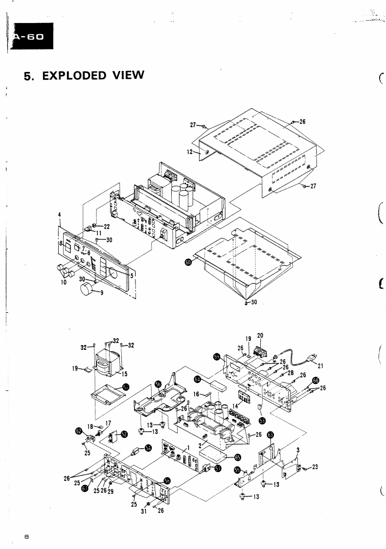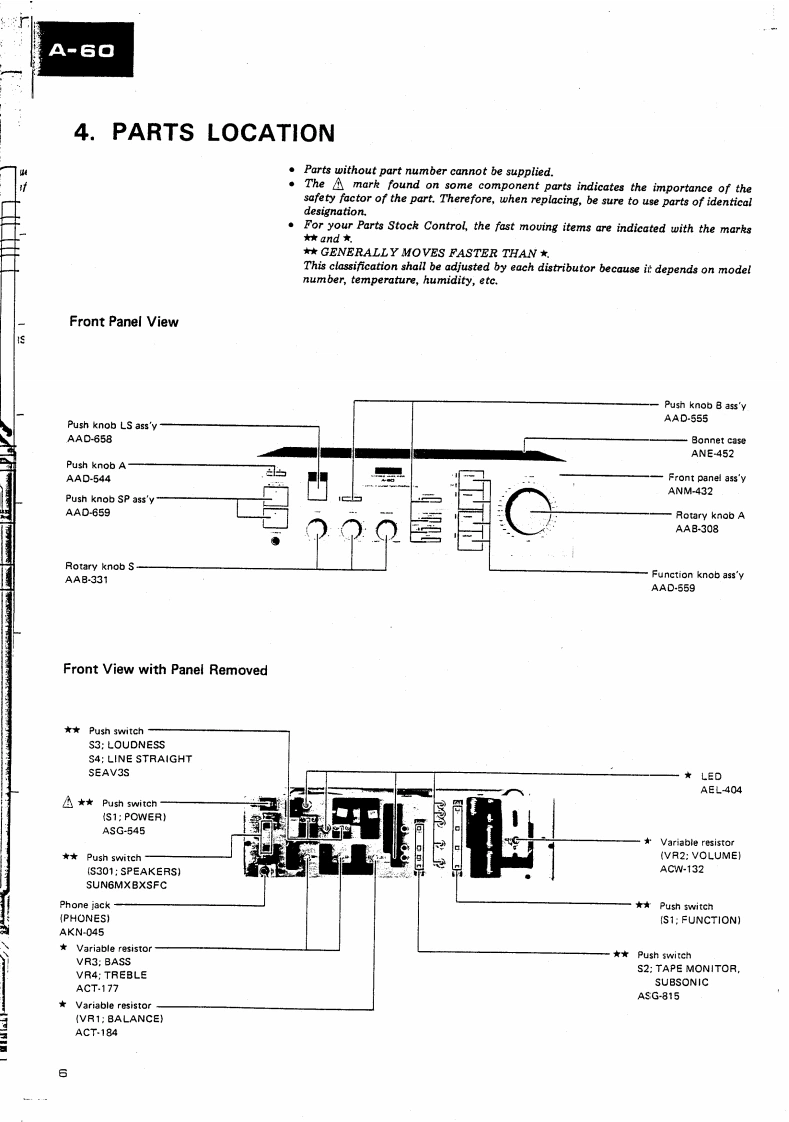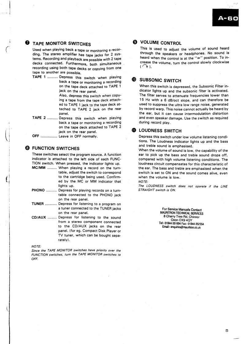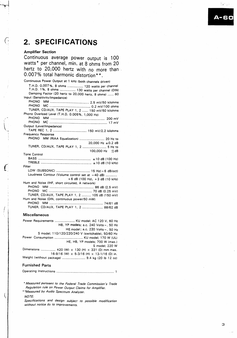 ②PIONEERServiceFor Service Manuals ContactMAURITRON TECHNICAL SERVICES8 Cherry Tree Rd,Chinnorc ManualOxon OX9 40YTek01844351694Faxc.01844-352554Email:-enquiries@mauritron.co.ukCIRCUIT DESCRIPTIONSREPAIR ADJUSTMENTSORDER NO.ARP.318-0STEREO AMPLIFIERA-60MODEL A-60 COMES IN FIVE VERSIONS DISTINGUISHED AS FOLLOWS:TypeVoitageRemarksKUAC120V onlyU.S.A.modelHEAC220V,240V (Switchable)European continent modelHBAC220V,240V (Switchable)United Kingdom modelYPAC240V onlyAustralia modelHEZAC220V,240V (Switchable)West Germany modelAC110V,120V,220V,240V (switchable)General export modelThis service manual is applicable to the KU type.For servicing of the HE,HB,YP and S types,pleaserefer to the pp.27~29.For servicing of the HEZ type,please refer to the additional service manual..Ce manuel d'instruction se refere au mode de reglage,en francais.Este manual de servicio trata del metodo de ajuste escrito en espanol.CONTENTS1.SAFETY INFORMATION.··,··29.SCHEMATIC DIAGRAM...·,··172.SPECIFICATIONS....····310.ELECTRICAL PARTS LIST..·.,·,,·203.FRONT PANEL FACILITIES..···.·,·,·411.PACKING234.PARTS LOCATION612.ADJUSTMENTS5.EXPLOOED VIEW....................8REGLAGE256.BLOCK DIAGRAM10AJUSTE,..·,267.CIRCUIT DESCRIPT1ONS..:....·.·,,.1213.FOR HE,HB AND YP TYPES278.P.C.BOARDS CONNECTION DIAGRAM ..1314.F0 RS TYPE.…29PIONEER ELECTRONIC CORPORATION 4-1.Meguro 1-Chome.Meguro-ku.Tokyo 153.JapanPIONEER ELECTRONICB [UBA]INC.1925 E.Oominguez St..Long Beech.Californa 90810 U.S.A.PIONEER ELECTRONIC [EUROPE]N.V.KeetberIONEER ELECTRONICS AUSTRALIA PTY.LTRS1Z8184 Cum178-184 Boundary Road,Braeside.Victore 3195,AustreleYZ JUNE.1983 Printed in Japan