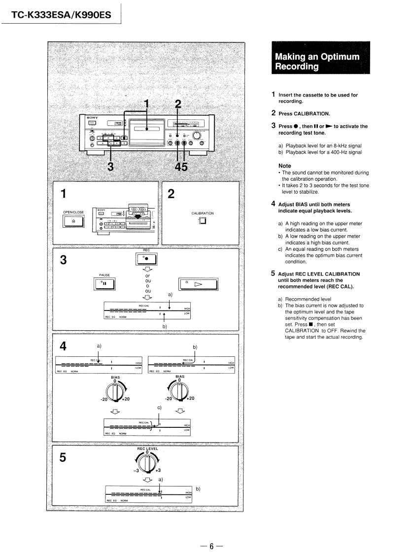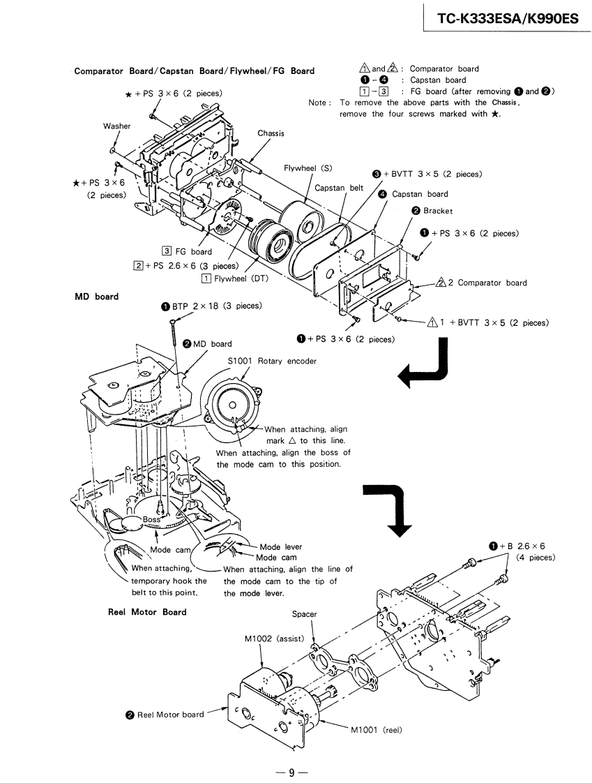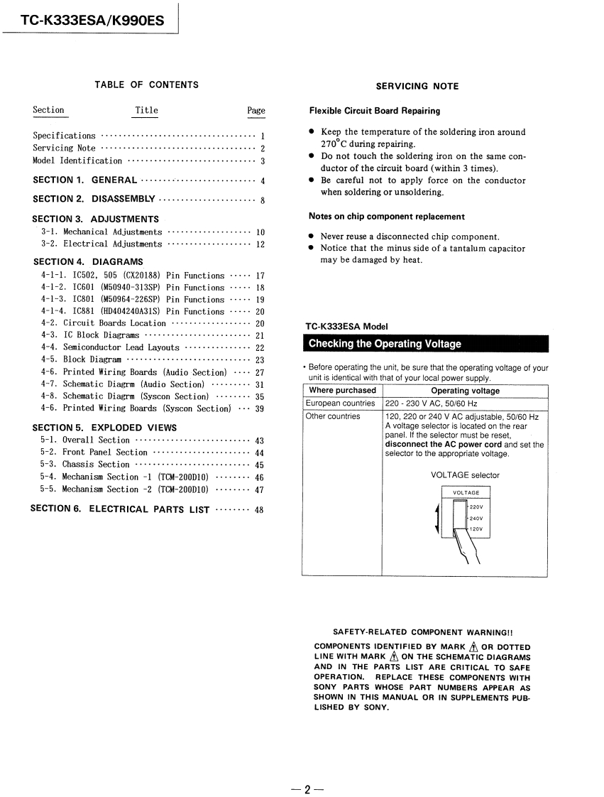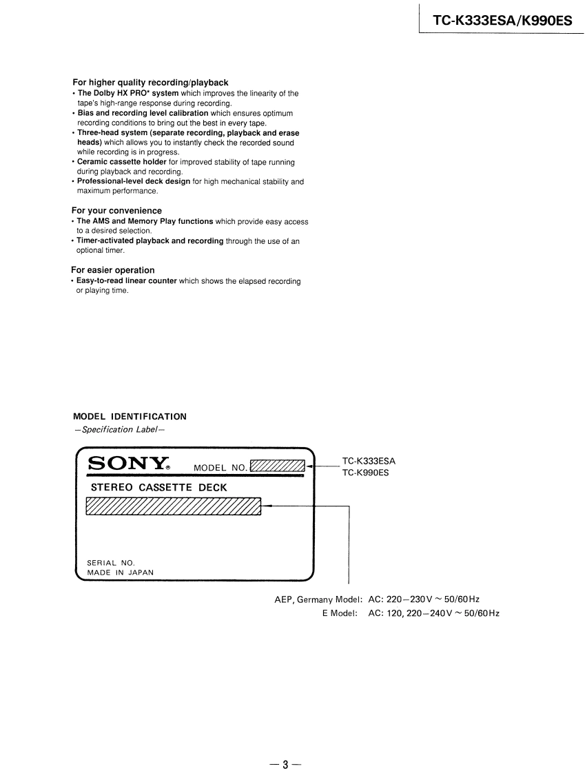TC-K333ESA/K990ESSERVICE MANUALAEP ModelTC-K990ESEModelTC-K333ESA0D0Dolby noise reduction and HX Pro headroom extensionmanulactured under license from Dolby Laboratories LicensingCorporation.HX Pro originated by Bang Olufsen.DOLBY",the double-D symboi D0 and "HX PRO'are trademarksof Doty Laboretones Licensing Corporation.Model Name Using Similar MechanismTC-K333ESGSPECIFICATIONSTape Transport Mechanism TypeTCM-200D10Recording system4-track 2-channel stereoOutputsFast winding timeApprox.90 sec.(with Sony C-60 cassette)BiasAC biasLine outputsRated output level0.5 V at a load impedanceHeadsErasing head x 1 (S&F head)(phono jacks)of 47 k ohmsRecording head x 1 (LA head)Load impedanceOver 10 k ohmsPlayback head x 1 (LA head)MotorsCapstan motor×1HeadphonesOutput level0-3 mW at a load(direct-drive linear torque BSL motor)(stereo phone jack)impedance of 32 ohmsReel motor x 1 (DC motor)Signal-to-noise ratio (at peak level)GeneralCassetteType IV(SonyType llType lPower requirementsAEP model:(Dolby NR OFFMetal-S)(Somy UX-S)Sony HF-S)220.230VAC.(or240VACadjustable by Sony personnel).61 dB59 dB57 dB5060HzE model:Measured at peak level weithted without NR.The S/N is improved by about120.220,or 240 V AC adjustable,15 dB at 500 Hz and by about 20 dB about 1 kHz with Dolby-C NR on,and by50/60Hz5 dB at 1 kHz and by 10 dB about 5 kHz with Dolby-B NR onPower consumption31WDimensionsApprox..470×140×380mm(whd)Harmonic distortion1.3%(with Sony Metal-S 250 nWb/m,315 Hz(18h×5h×15 inches)3rd H.D.)including projecting parts and controlsFrequency response(Dolby NR OFF)WeightApprox.12.0 kg (26 Ibs 8 oz)Type IV cassette15-22,000 Hz (3 dB,IEC)Model for other countries:Approx.11.2kg(Sony Metal-S)15-16,000 Hz 3 dB (-4dB recording)]Supplied accessoriesAudio connecting cords(2)Type ll cassette15-20,000Hz3dB.1EC)Screws (8)(Sony UX-S)Wireless remote commander(1)Sony SUM-3(NS)batteries (2)"Type I cassette15-18,000Hz3dB.IEC)Not supplied with model for European countries(Sony HF-S)Design and specifications are subject to change without notice.Wow and flutter±0.04%W,Peak(IEC)0.022%W.RMS (NAB)Note±0.0B5%W.Peak(DiNjThis appliance conforms with EEC Directive 87/308/EEC regardingInputsinterference suppression.Line inputsSensitivity0.16V(phono jacks)Input impedance47 k ohmsCD DIRECT INPUTInput impedance47 k ohmsSTEREO CASSETTE DECKSONY