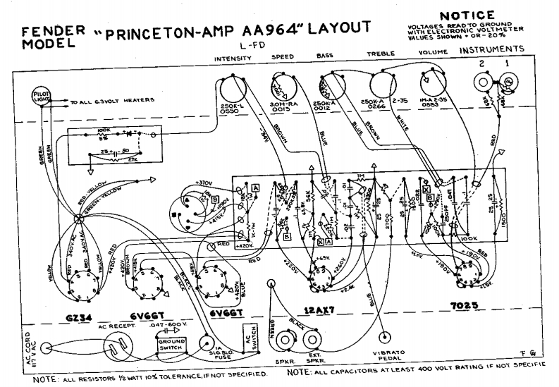 FENDERPRINCETON-AMP AA964 SCHEMATICNOTICEMODELTHIS PRODUCT MANUFACTURED UNDER ONEI.VOLTAGES READ TO GROUND WITH ELECTRONIC VOLTMETER0时+0R-20OR MOR2.ALL RESISTORSV2 WATT IOKTOLERANCE IF NOT SPECIE IED.3.ALL CAPACITORS AT LEAST 4OOVOLTRATING IF NOT SPECIF1RD.L-FDS LN3WndISNI%-7025e99各7025为-12AX76V6GT+420RT3+429TR1-1251D片-2AX7+290W+290.+415TR2,125A10B热型45T506V6GT20的GZ34VIBRATOPEDALTOALL 6.3Y HEATERSAC RECEPTACLEMA SLOBLOFUSEPILOT LICHTSWITCH■移SICAL INSTR日MENTS0d号4t9on CRod★CTFULLERTON.CALIFORKIA