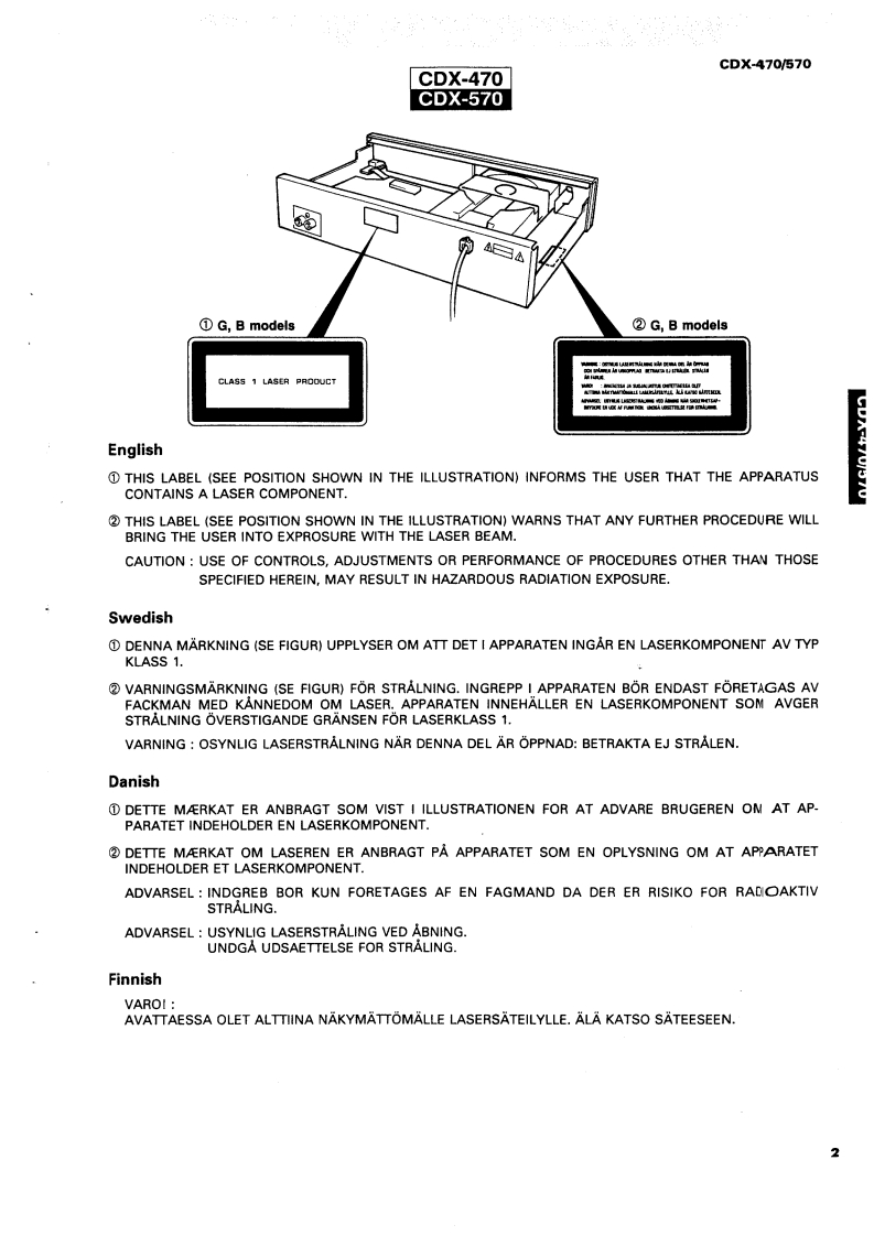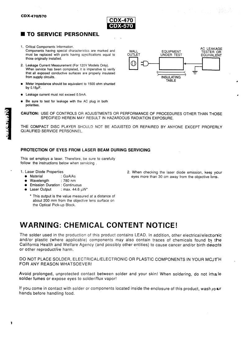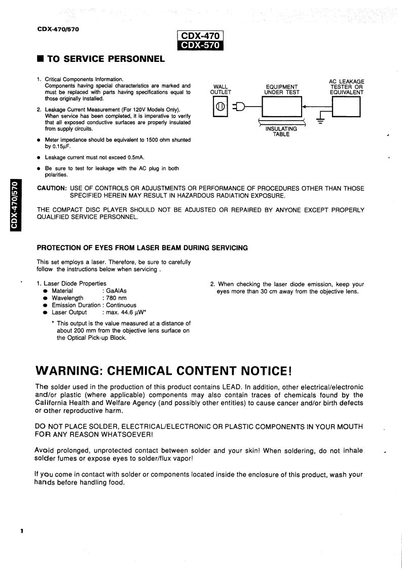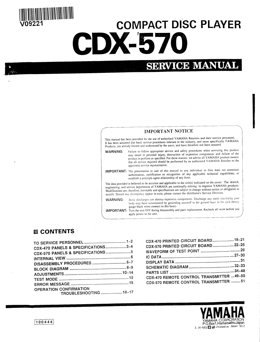 V09221COMPACT DISC PLAYERCDX470/570SERVICE MANUALC0X-470/670IMPORTANT NOTICEThis manual has been provided for the use of authorized YAMAHA Retailers and their service personnel.It has been assumed that basic service procedures inherant to the industry.and more specifically YAMAHAProducts,are aiready known and understood by the users,and have therefore not been restated.WARNING:Failure to follow appropriate service and safety procedures when servicing this produetmay result in personal injury.destruction of expensive components and failue of theproduct to perform as specified.For these reasons,we advise all YAMAHA product ownersthat all service required should be performed by an authorized YAMAHA Retaier or theappointed service representative.IMPORTANT:The presentation or sale of this manual to any individual or fim does not constituteauthorization.certification or recognition of any applicable technical cpabiities.orestablish a principle-agent relationship of any form.The data provided is believed to be cre and applicable to the ni(s)indicated on the cover The reserch,engineering.and service departments of YAMAHA are continually striving to improve YAMAHA oducts.Modifications are,therefore,inevitable and specifications are subject to change without notice or obligation toretrofit.Should any discrepancy appear toexistplease contact the distributors Service Division.WARNING:Static discharges can destroy expensive components.Discharge any static electriity yourbody may have accumulated by grounding yourself to the ground buss in the unit (heavygauge black wires connect to this buss).IMPORTANT:Tum the unit OFF during disassembly and parts replacement.Recheck all work bfore youapply power to the unit.■CONTENTSTO SERVICE PERSONNEL1-2CDX-470 PRINTED CIRCUIT BOARD.........18-21CDX-470 PANELS SPECIFICATIONS ............3~4CDX-570 PRINTED CIRCUIT BOARD..........-.22~25CDX-570 PANELS SPECIFICATIONS.5WAVEFORM OF TEST POINT................26INTERNAL VIEW.1 C DATA-.27-30DISASSEMBLY PROCEDURES.......6-7DISPLAY DATA.31BLOCK DIAGRAM..89SCHEMATIC DIAGRAM.......-.32-33ADJUSTMENTS…10-14PARTS LIST..2.34-48TEST MODE ....15CDX-470 REMOTE CONTROL TRANSMITTER.-.49~50ERROR MESSAGE15CDX-570 REMOTE CONTROL TRANSMITTER.-.......51OPERATION CONFIRMATIONTROUBLESHOOTING ..................16~17YAMAHA100444YAMAHA CORPORRATIONP.O.Box1.Hamamitssu Japan3.IK-693 Printed in ka pan '93.2