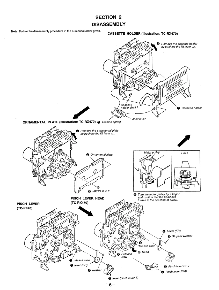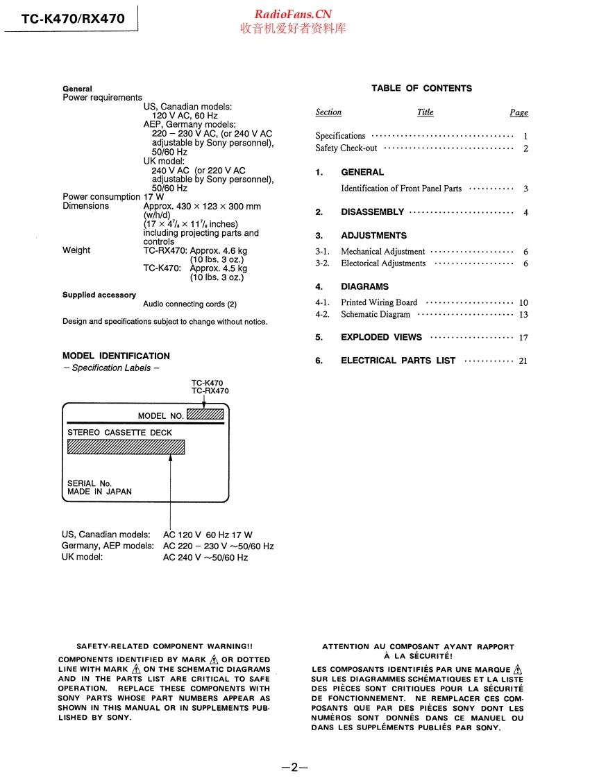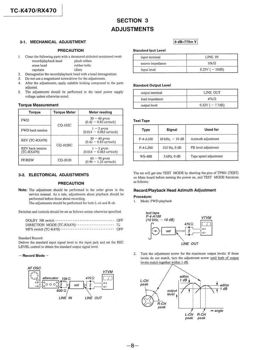 RadioFans.CNTC-K470/RX470SERVICE MANUALUS ModelCanadian ModelTC-RX470AEP ModelUK ModelGermany ModelTC-K470Dolby noise reduction and HX Pro headroom extension manufacturedunder license from Dolby Laboratories Licensing Corporation.HX ProPhoto:TC-RX470originated by Bang Olufsen."DOLBY",the double-D symbol Do and "HX PRO"are trademarks ofDolby Laboratories Licensing Corporation.SPECIFICATIONSRecording system4-track 2-channel stereoModel Name Using Similar MechanismTC-WR870Fast-winding timeApprox.90 sec.(with Sony C-60cassette)TC-RX470:BiasAC biasTape Transport Mechanism TypeTCM-200R7HeadsTC-K470Erasing head x 1 (ferrite head)TCM-200V6Playback/Recording head X 1(SD head)TC-K470MotorsCapstan motor x 1 (DC servo motor)Reel motor x 1 (DC motor)Type IV cassette30-18,000Hz(±3dB.IEC)(Sony METAL-S)ASIST(mechanical drive)motor X 130-15.000Hz[O VU (-4dB)recording](DC motorType ll cassette30-17,000Hz(±3dB.EC)(Sony UX-S)Signal-to-noise ratio (NAB (TC-RX470),at peak level)TC-RX470Type I cassette30-15,000Hz(±3dB.EC)(Sony HF-S)Dolby NR switchOFFB-typeC-typeWow and flutter±0.09%W.Peak (IEC)CassetteONON0.06%WRMS (NAB)Type IV (Sony METAL-SLT)58 dB66dB73 dB±0.16%W,Peak(DlN)Type ll (Sony UX-S)57 dB65dB72 dBInputsType I(Sony HF.S)55 dB 63 dB70 dBLine inputsSensitivity77.5mV(phono jacks】Input impedance47 kohmsTC-K470Microphone inputsSensitivity (For a0.25mVDolby NR switch(phone jacks)low-impedanceOFFB-typeC-typeTC-RX470microphone)CassetteONONOutputsType IV (Sony METAL-S)59 dB67 dB74 dBType ll (Sony UX-S)58 dBRated output0.32 V at a load66 dB73 dBLine outputs(phono jacks)levelimpedance of 47 kType I(Sony HF-S)56 dB 64 dB 71 dBohmsTotal harmonic distortionLoad impedanceOver 10 k ohms1.0%(with Sony METAL-SLT cassette)HeadphonesOutput level0.3mwFrequency responce(DOLBY NR OFF)(stereo phone(TC-RX470)orack)0-1.25mWTC-RX470(TC-K470)at aType IV cassette30-16,000Hz(±3dB)load impedance of(Sony METAL-SLT)30-14.000Hz32 ohms[O VU (-4dB)recording]Type ll cassette30=15.000Hz(±3dB)(Sony UX-S)Continued on next pageType I cassette30-14.000Hz(±3dB)(Somy HF-S)STEREO CASSETTE DECKSONY