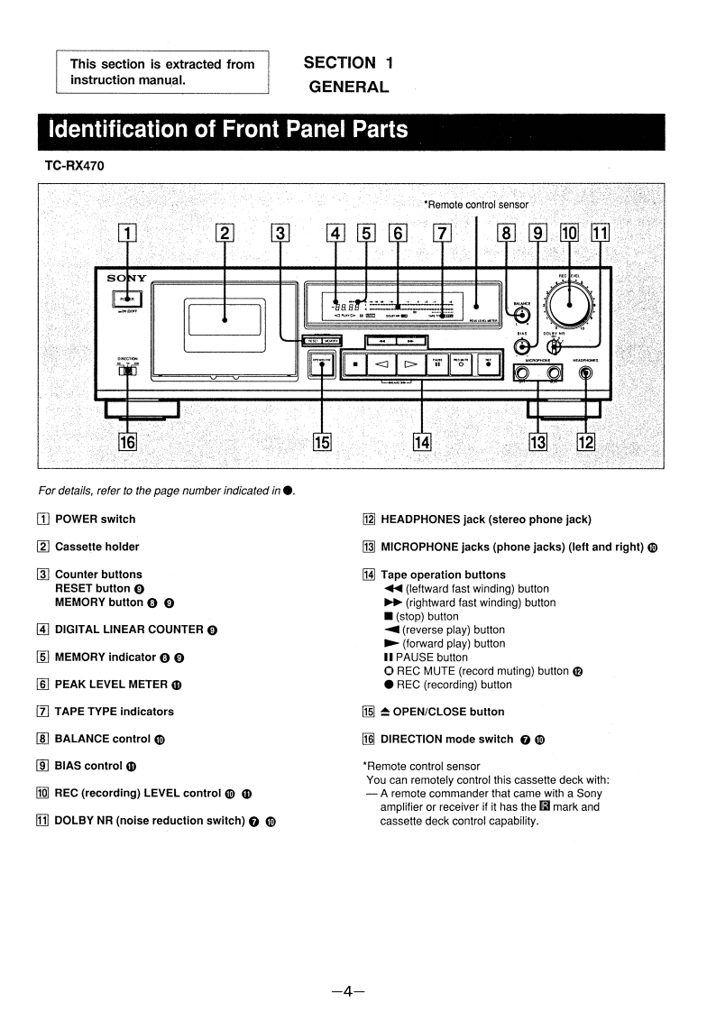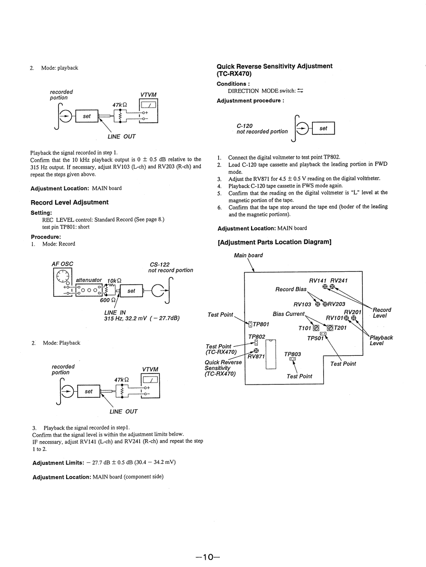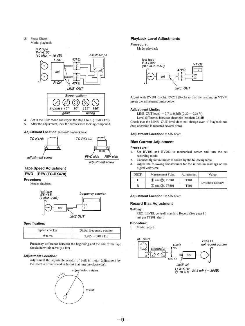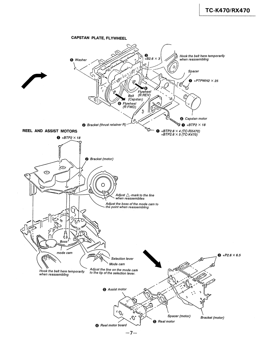 RadioFans.CNTC-K470/RX470SERVICE MANUALUS ModelCanadian ModelTC-RX470AEP ModelUK ModelGermany ModelTC-K470Dolby noise reduction and HX Pro headroom extension manufacturedunder license from Dolby Laboratories Licensing Corporation.HX ProPhoto:TC-RX470originated by Bang Olufsen."DOLBY",the double-D symbol Do and "HX PRO"are trademarks ofDolby Laboratories Licensing Corporation.SPECIFICATIONSRecording system4-track 2-channel stereoModel Name Using Similar MechanismTC-WR870Fast-winding timeApprox.90 sec.(with Sony C-60cassette)TC-RX470:BiasAC biasTape Transport Mechanism TypeTCM-200R7HeadsTC-K470Erasing head x 1 (ferrite head)TCM-200V6Playback/Recording head X 1(SD head)TC-K470MotorsCapstan motor x 1 (DC servo motor)Reel motor x 1 (DC motor)Type IV cassette30-18,000Hz(±3dB.IEC)(Sony METAL-S)ASIST(mechanical drive)motor X 130-15.000Hz[O VU (-4dB)recording](DC motorType ll cassette30-17,000Hz(±3dB.EC)(Sony UX-S)Signal-to-noise ratio (NAB (TC-RX470),at peak level)TC-RX470Type I cassette30-15,000Hz(±3dB.EC)(Sony HF-S)Dolby NR switchOFFB-typeC-typeWow and flutter±0.09%W.Peak (IEC)CassetteONON0.06%WRMS (NAB)Type IV (Sony METAL-SLT)58 dB66dB73 dB±0.16%W,Peak(DlN)Type ll (Sony UX-S)57 dB65dB72 dBInputsType I(Sony HF.S)55 dB 63 dB70 dBLine inputsSensitivity77.5mV(phono jacks】Input impedance47 kohmsTC-K470Microphone inputsSensitivity (For a0.25mVDolby NR switch(phone jacks)low-impedanceOFFB-typeC-typeTC-RX470microphone)CassetteONONOutputsType IV (Sony METAL-S)59 dB67 dB74 dBType ll (Sony UX-S)58 dBRated output0.32 V at a load66 dB73 dBLine outputs(phono jacks)levelimpedance of 47 kType I(Sony HF-S)56 dB 64 dB 71 dBohmsTotal harmonic distortionLoad impedanceOver 10 k ohms1.0%(with Sony METAL-SLT cassette)HeadphonesOutput level0.3mwFrequency responce(DOLBY NR OFF)(stereo phone(TC-RX470)orack)0-1.25mWTC-RX470(TC-K470)at aType IV cassette30-16,000Hz(±3dB)load impedance of(Sony METAL-SLT)30-14.000Hz32 ohms[O VU (-4dB)recording]Type ll cassette30=15.000Hz(±3dB)(Sony UX-S)Continued on next pageType I cassette30-14.000Hz(±3dB)(Somy HF-S)STEREO CASSETTE DECKSONY