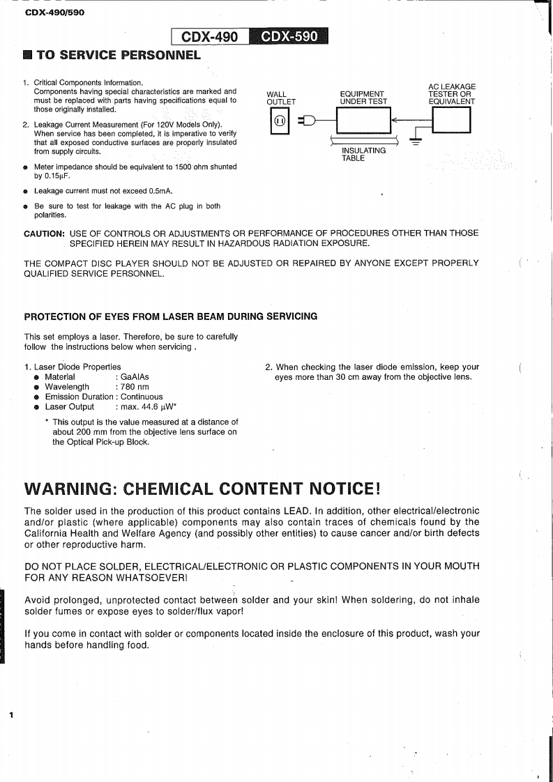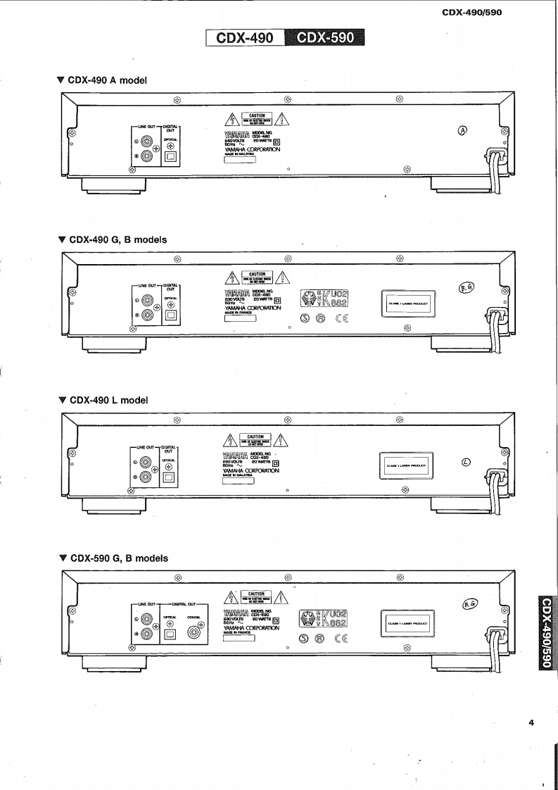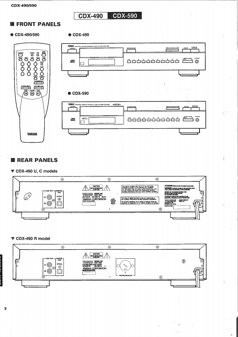 COMPACT DISC PLAYERCDX-490/590SERVICE MANUALIMPORTANT NOTICEbepred for thefred YAMA Retalers and their service peronnel.known and understood by the users,and have therefore not been restated.WARNING:inyov mmere o oue o omwe advise all YAMAHA product owners that all service required should be performed by an nuthorizedYAMAHA the ppointed.IMPORTANT:The presentan or sale ofThe data provided is believed to be accurate and applicable to the unit(s)indicated on the cover.The research,engineering.andservice deinmprovYAMAHAtModificre.thrand specifications are subcontactthe distributor's Service Division.WARNING:ad by meoIn te bomIMPORTANT:Tum the unit OFF during disassembly and parts replacement.Recheck all work before you apply power to the unit.圈CONTENTSTO SERVICE PERSONNEL12IC DATA….1520FRONT PANELS3PIN CONNECTION DIAGRAM.1REAR PANELS.34CDX-490 PRINTED CIRCUIT BOARD.2225SPECIFICATIONS.........5CDX-490 BLOCK DIAGRAM.26~27INTERNAL VIEW...61 BLOCKS.28~29DISASSEMBLY PROCEDURES4…67CDX-490 SCHEMATIC DIAGRAM .....30TEST M0D呢,78CDX-590 SCHEMATIC DIAGRAM..........31MEMORY BACKUP48CDX-590 BLOCK DIAGRAM.......…3233ERROR MESSAGE .....911CDX-590 PRINTED CIRCUIT BOARD.3437STANDARD OPERATION CHART..........12~13PARTS LIST....…3851DISPLAY DATA…14REMOTE CONTROL TRANSMITTER.....52cpx400600YAMAHA100539Y88A8剂3.2K-373 Printed in Japan '96.3