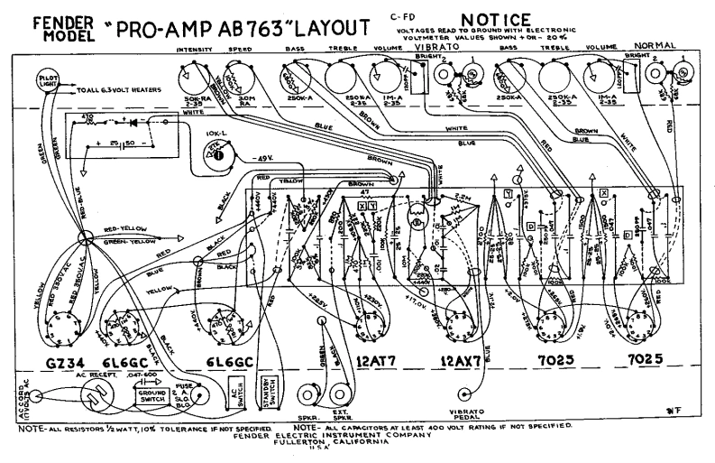 FENDERMODEL"PRO-AMP AB763"SCHEMATICNOTICETHIS PRODUCT MANUFACTUREO UNDERC-FDL-VOLTAG电s周SAD TO GROUND WITH ELECTRO制1C7025/PATENTS PENDIN6266L6GC12AT744030yPEDAL12AX743844GTH1-125P5DTR2-125CA6L6GCR3-125A1A+430回回包TR2+375¥路于7025GZ3429AC SHITCH350E A我ECEPTACL毛WITCH5Q0.U學E375回FENDER ELECTRIC INSTRUMENT COMPANYFULLERTON.CALIFORNIAUSA