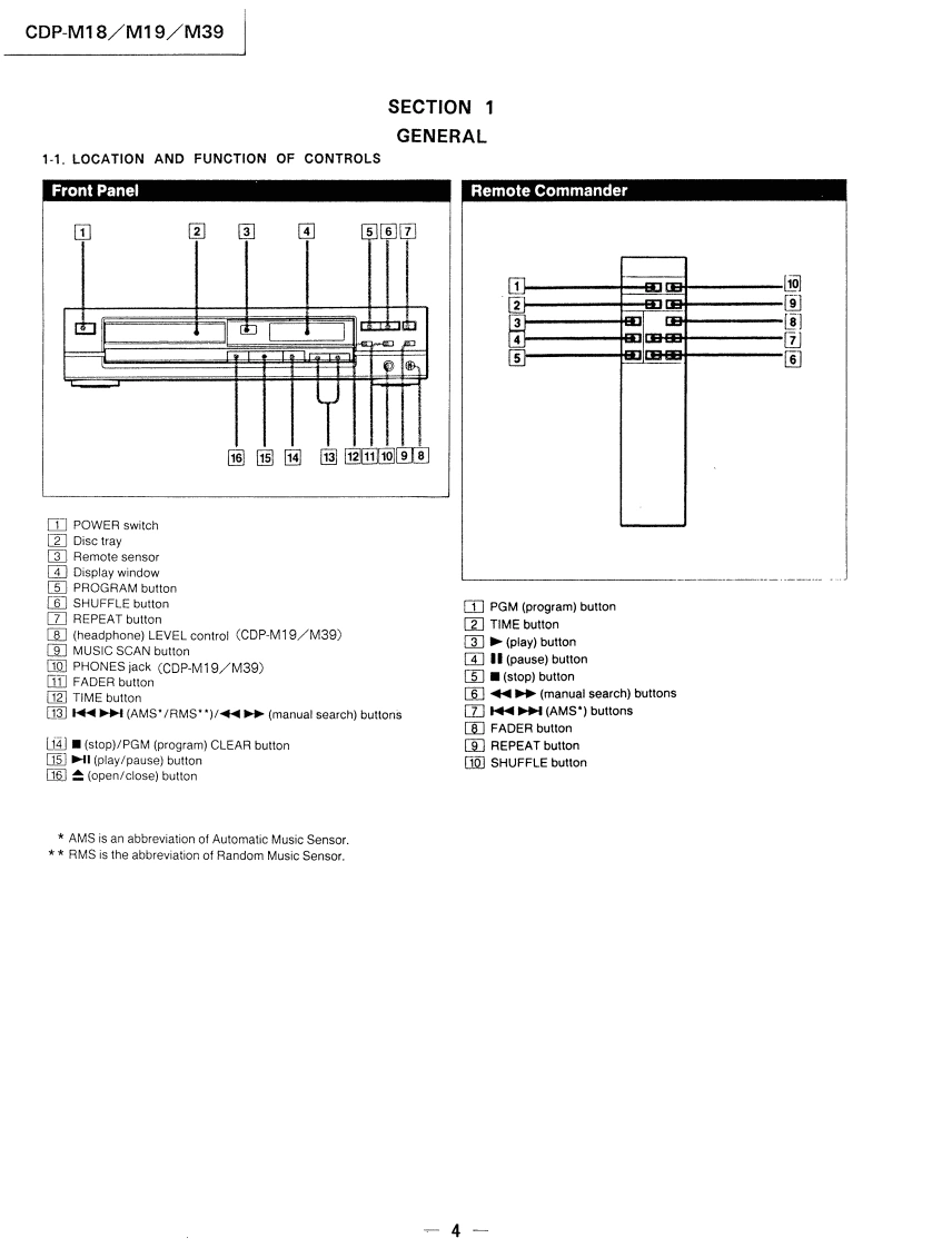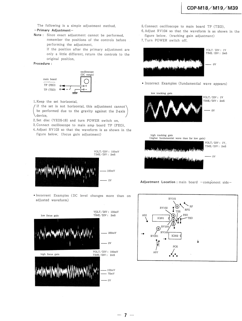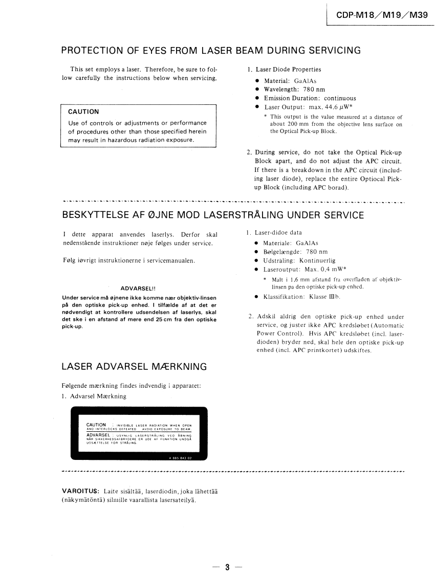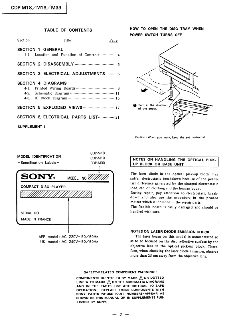 CDP-M18/M19/M39SERVICE MANUALAEP ModelDiscard CDP-M18 Service ManualUK Model(No.9-955-526-11)previously issued.This Service Manual contains it.Photo:CDP-M18Model Name Using Similar MechanismCDP.190/390CD Mechanism NameCDM14A-5KBase Unit NameBU-5KSPECIFICATIONSCompact disc playerPower consumption10WDimensions355×95×305mmFrequency response2Hz-20kHz±dB(approx..including(w/h/d)Signal to noise ratioMore than 93 dBprojections)(14×3%×11%inches).Dynamic rangeMore than 90 dBWeight (approx.)2.8 kg (6 Ibs 3oz)Harmonic distortionLess than 0.05%Channel separationMore than 90 dBRemote commanderRM-D90 (CDP-M39)OutputsRemote control systemInfrared controlPower requirements3VDC with two R6 (size AA)LINE OUTOutput level 2V (at 50 kilohms)batteries(phono jacks)Load impedance over 10 kilohmsDimensionsApprox.43×20×175mmCDP-M19/M39w/h/d)PHONESOutput level max.10 mW(1%×%×7 inches)(stereo phone jack)Load impedance 32 ohmsWeightApprox.105g (3.7 oz)Including batteriesGeneralDesign and specifications subject to change without noticePower requirementsAEP model 220 V AC(or 240 VAC adjustable bySony personnel),50/60 HzUK model 240 VAC(or 220 V AC'adjustable bySony personnel),50/60 HzCOMPACT DISC PLAYERSONY
