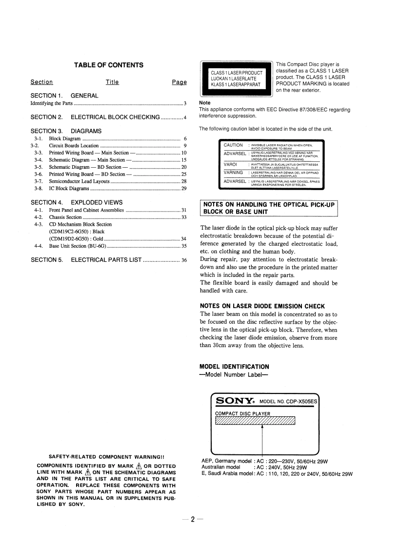 CDP-X505ESSERVICE MANUALAEP ModelE ModelAustralian Model0戴Model Name Using SimilarCDP-X559ESMechanismCDM19C2-6G50:(BLACK)CD Mechanism TypeCDM19D2-6G50:(GOLD)Optical Pick-up Block Type BU-6GSPECIFICATIONSCompact disc playerMass(approx.】European model:LaserSemiconductor laser13.2kg(29b320z)Wavelength780-790nmAustralian model:Frequency response2Hzto20kHz±0,3dB12.5kg(27lbs90zSignal-to-noise ratioMore than 118 dBOther country models:Dynamic rangeMore than 100 dB12.3kg(271b320zHarmonic distortionLess than 0.0017%Remote commanderChannel separationMore than 110 dBRemote control systemInfrared controlOutputsPower requirements3 V DC with two R6 (size AA)batteriesLINE OUT(FIXED)Output level 2V(at 50 kilo-ohms)Dimensions (approx.,including projections)Load impedance over 10 kilo-ohms62x17x175mm(w/h/d)LINE OUT (VARIABLE)Output level max.2 V (at 50 kilo-ohms)22x23/2×7 inches)Load impedance over 50 kilo-ohmsMass(approx.】135g(50z)DIGITAL OUT (OPTICAL)Wave length 660 nmOutput level -18 dBmDesign and specifications are subject to change without notice.PHONES (stereo phone jack)Output level max.28 mWLoad impedance 32 ohmsGeneralPower requirementsContinental European model:20V-230VAC,50/60HzAustralian model:240 V AC,50 HzOther country models:110,120.220or240VAC,50/60HzPower consumption29WDimensions (approx.,including projections)CDP-X505ESAustralian model:430×125x375mm(wh/d(17 x 5 x 14 /inches)Other country models:470X125x375mm(w/h/d(18x5 x 147/inches)COMPACT DISC PLAYERSONY定鱼2Y子毫