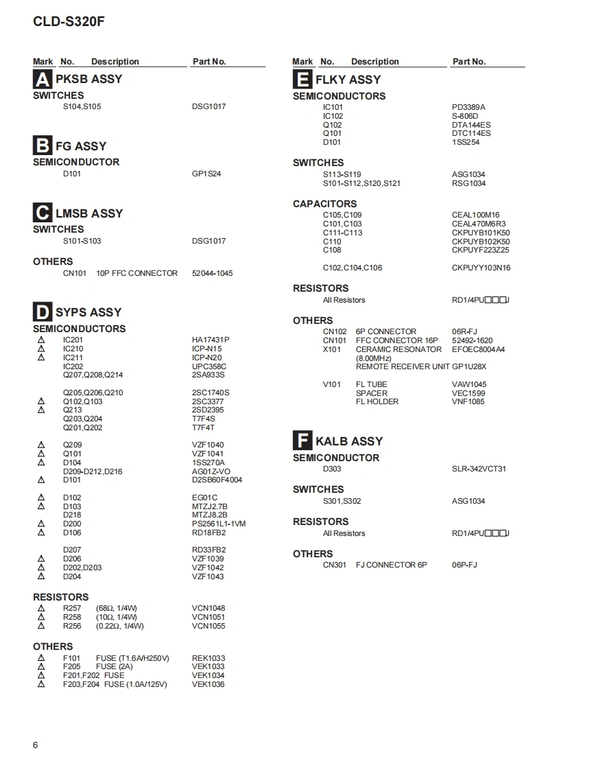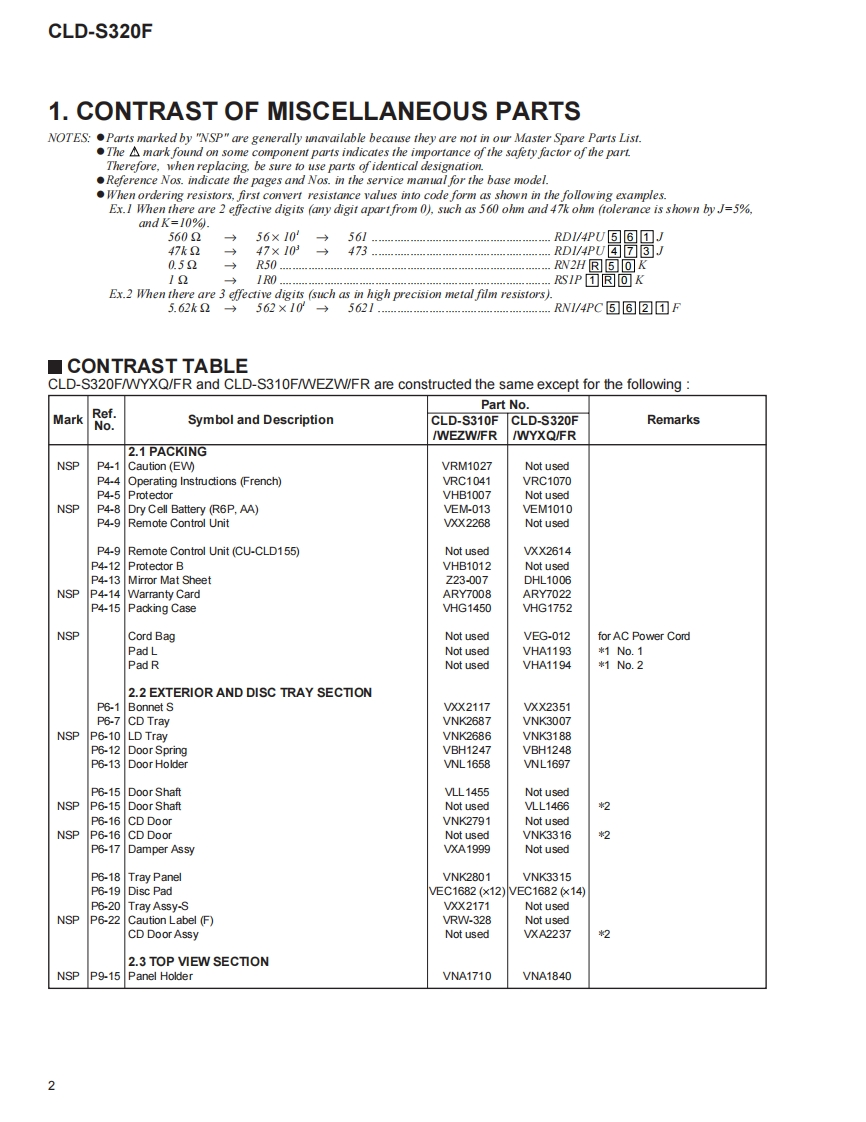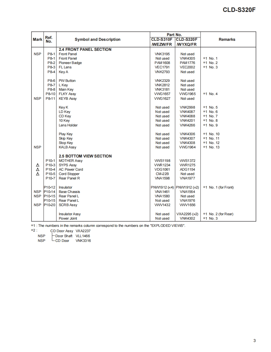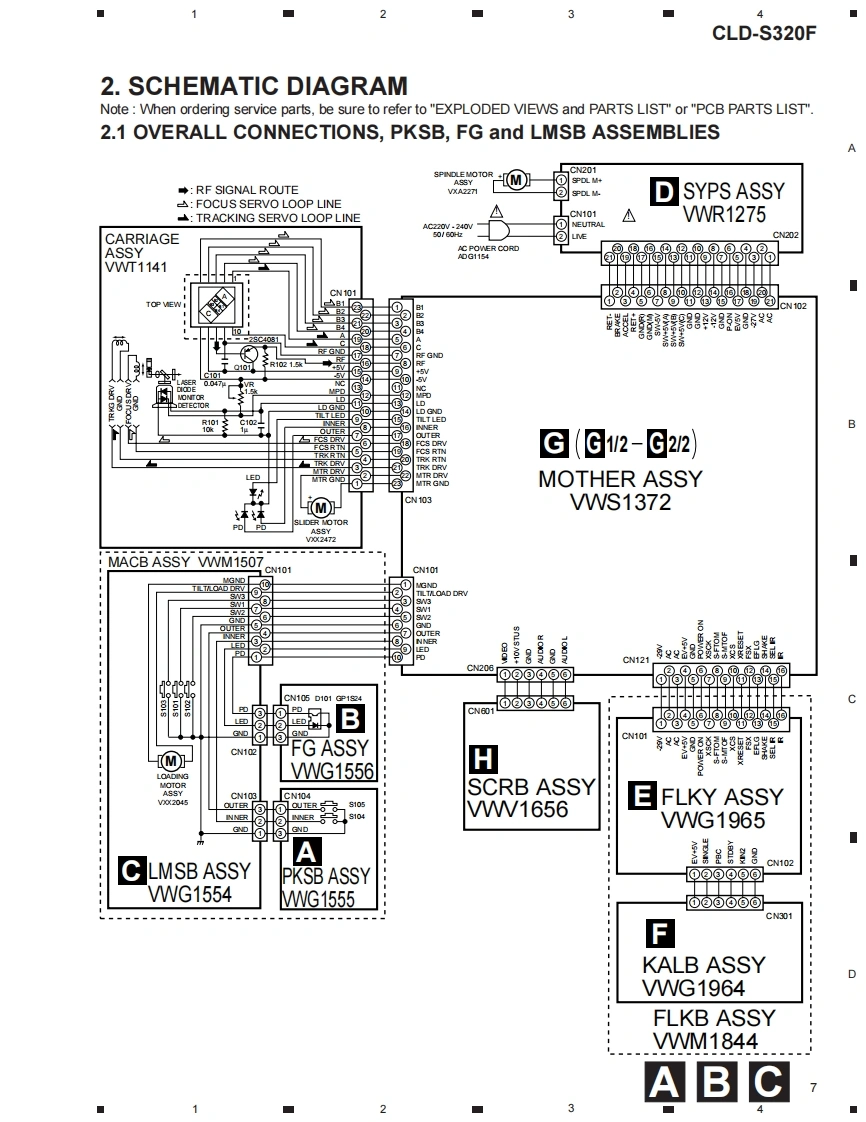 PioneerServiceManualORDER NO.RRV2091CD CDV LD PLAYERCLD-S320FRefer to the service manual RRV1342 for CLD-S310F/WEZW/FR.THIS MANUAL IS APPLICABLE TO THE FOLLOWING MODEL(S)AND TYPE(S).TypeModelRemarksCLD-S320FPower RequirementWYXQ/FROAC220-240WCONTENTS1.CONTRAST OF MISCELLANEOUS PARTS.......22.SCHEMATIC DIAGRAM73.PCB CONNECTION DIAGRAM13PIONEER ELECTRONIC CORPORATION 4-1,Meguro 1-Chome,Meguro-ku,Tokyo 153-8654,JapanPIONEER ELECTRONICS SERVICE,INC.P.O.Box 1760,Long Beach,CA90801-1760,U.S.A.PIONEER ELECTRONIC (EUROPE)N.V.Haven 1087,Keetberglaan 1,9120 Melsele,BelgiumPIONEER ELECTRONICS ASIACENTRE PTE.LTD.253 Alexandra Road,#04-01,Singapore 159936CPIONEER ELECTRONIC CORPORATION 1999T-IZE JAN.1999 Printed in Japan