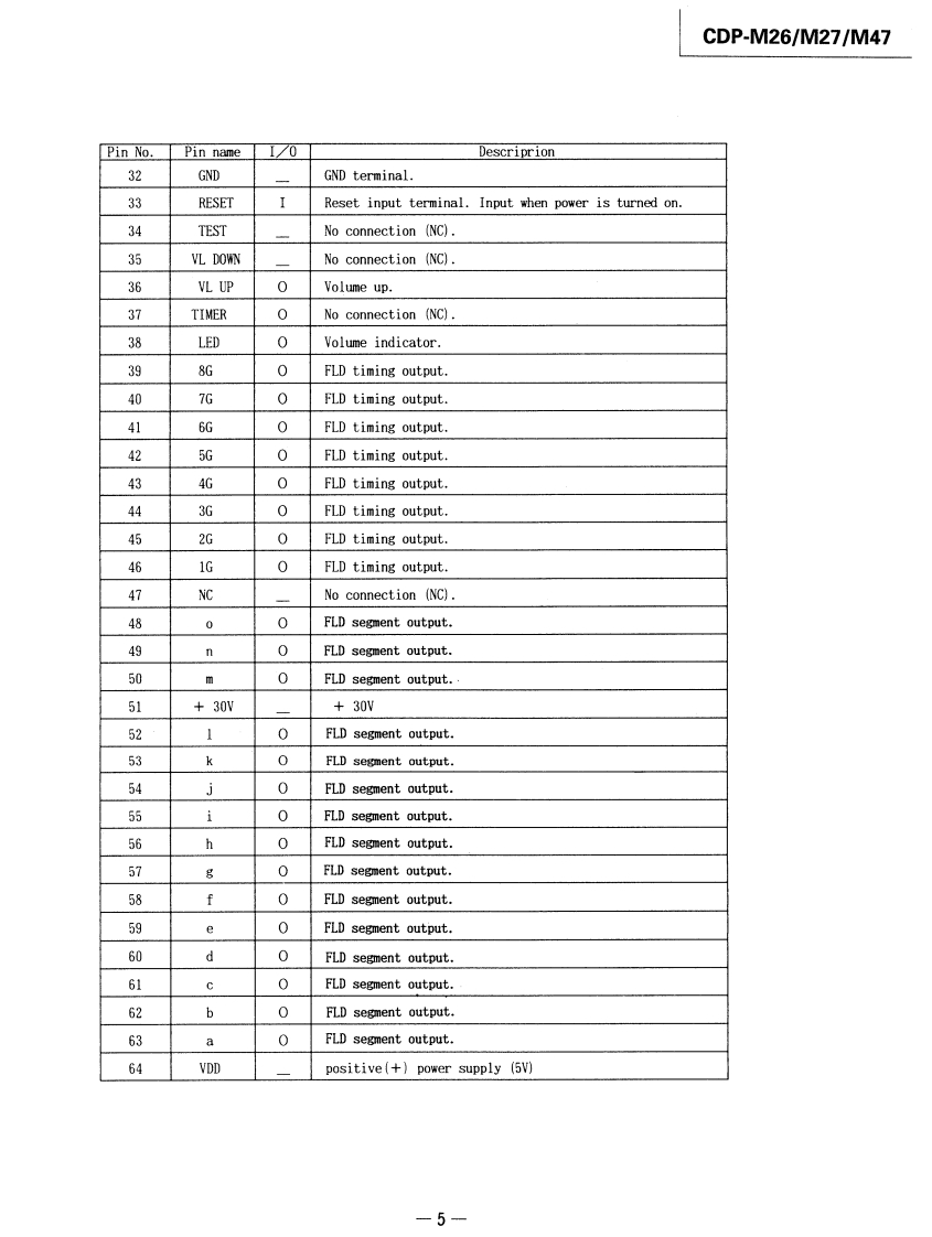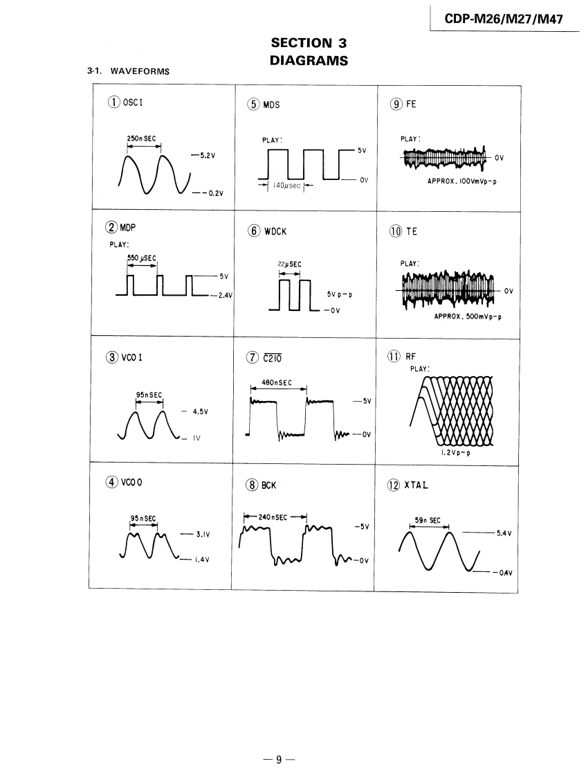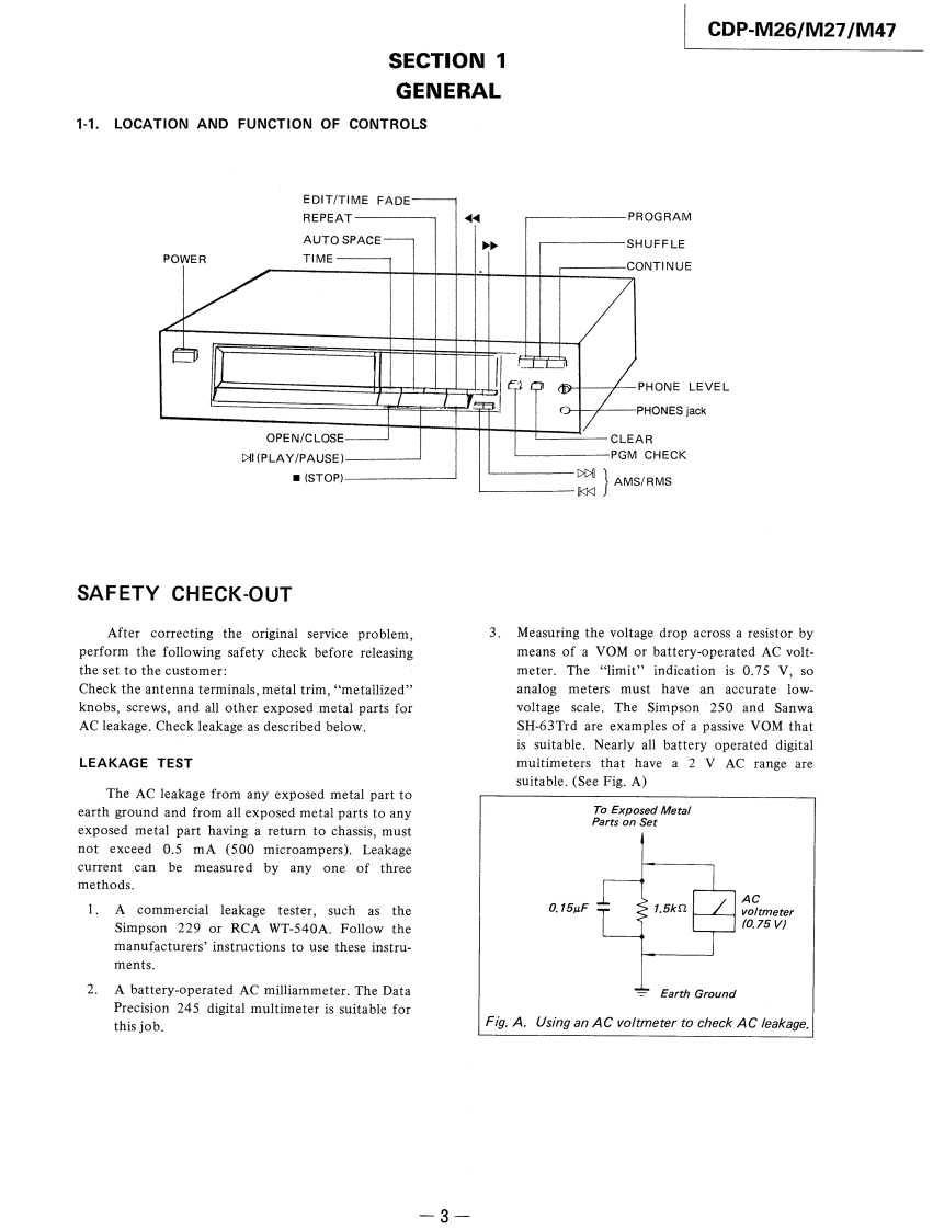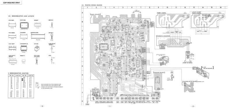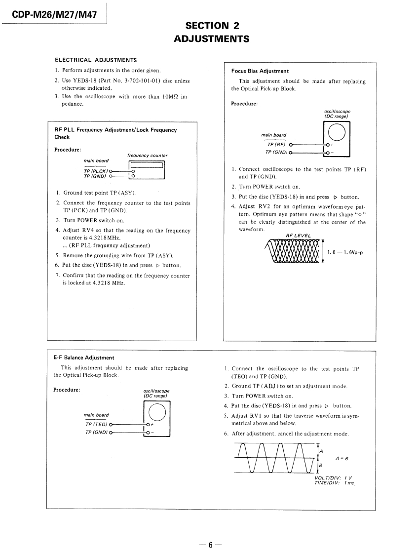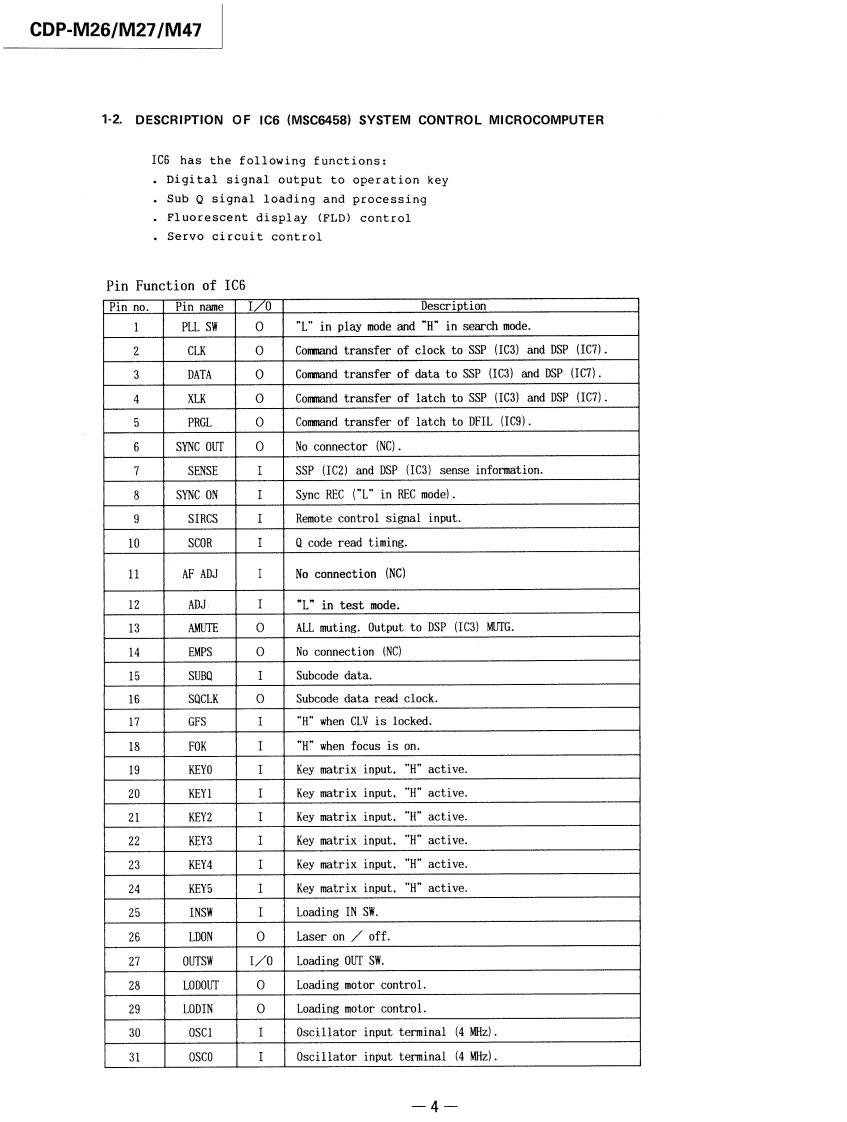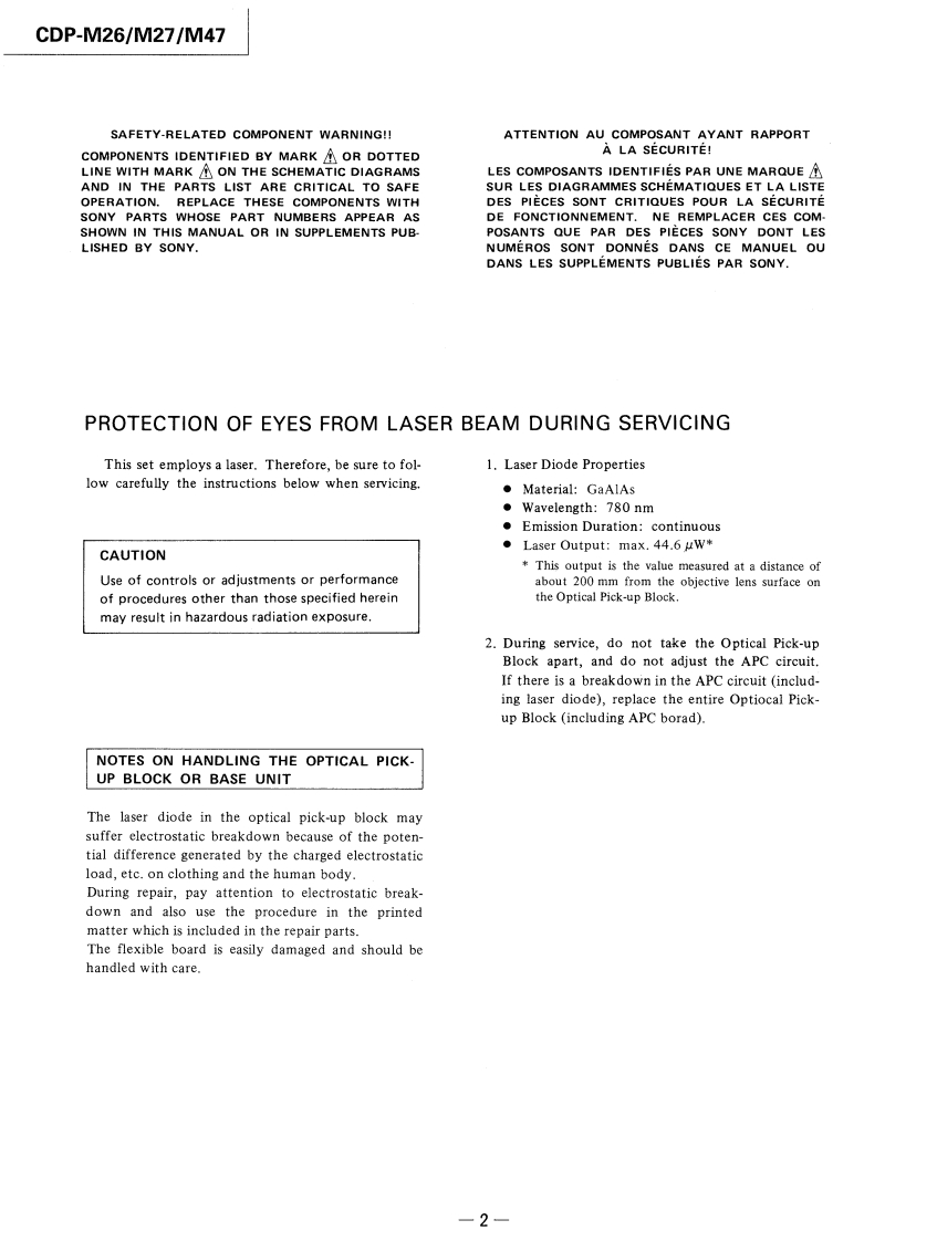 CDP-M26/M27/M47SERVICE MANUALCanadian ModelAEP ModelEModelAustralian ModelCDP-M27AEP ModelUK ModelCDP-M26/M47CDP-M27SPECIFICATIONSTABLE OF CONTENTSSystemCompact disc digital audio systemLaserSemiconductor laser (A=780nm)SectionTitlePageEmission durationContinuousFrequency resphonse2Hz-20,000Hz(±1dB)Specifications1Signal-to-noise ratioMore than 90dBHarmonic distortionLess than 0.09%Servicing Note,,,······,·····2Wow and flutterBelow measurable limitOutputLINE OUT (phono jacks)SECTION 1.GENERALOutput level 2V(at 50kilohms)1-1.Location and Function of Controls...3Load impedance over 10kilohmsl-2.Circuit Description.··········4Channel separationMore than 95dB (1 kHz)GeneralPower requirementAEP model (CDP-M26/M27/M47)SECTION2.ADJUSTMENTS·········6Australian model (CDP-M27)220WAC.50/60HzSECTION 3.DIAGRAMSUK model(CDP-M26/M4刀3-1.Waveforms·+9240WAC.5060Hz3-2.Semiconductor Lead LayoutsCanadian model(CDP-M27)10120V AC,60Hz3-3.Printed Wiring Boards·,··,,·,·11E.Saudi Arabla model (CDP-M27)3-4.Schematic Diagram.,,········13110-120V or 220-240V,adjustable50/60Hz3-5.IC Block Diagrams,········,·6Power consumption10W,12W(Canadian modelDimensionsapprox.355 x80x 275mm (w/h/dl)SECTION 4.EXPLODED VIEWS.......18(14x3%x10 inches)includingprojecting parts and controlsSECTION5.ELECTRICAL PARTS LIST.··20Weightapprox.3.0kg (6 Ibs 10oz)(net)Supplied accessoriesSUPPLEMENT-1...·Audio signal connecting cord (2 phono plugs-2 phono plugs)(1)·.24For CDP-M47 only:Remote commander (1),Sony SUM-3 (MS)batteries (2)For CDP-M26/M27/M47:AC power cord (1)COMPACT DISC PLAYERSONY