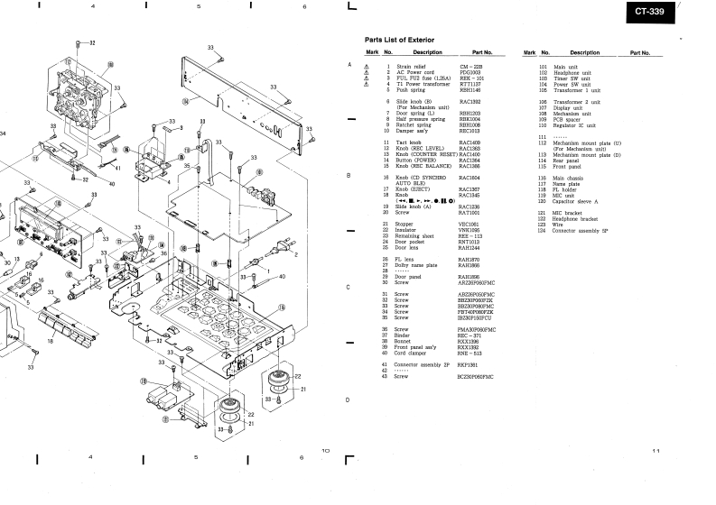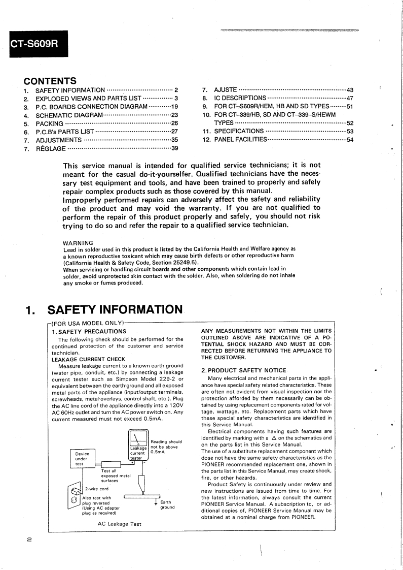 2PIONEERThe Art of EntertainmentServicec Manual皇量当与玉四回CT-S600LSTEREO CASSETTE DECKCT-S609RGT-339T-339-CT-S609R,CT-339 AND CT-339-S HAVE THE FOLLOWING:ModelTypePower RequirementRemarksCT-S609RCT-339CT-339-SKUC0AC120V onlyHEM00AC220V,240V (switchable)*HB00AC220V,240V (switchable)*HEWMOAC220V,240V (switchable)*SD00AC110V,120V-127V,220V,240V(switchable)】*Change the primary wiring of the power transformer.O This manual is applicable to the CT-S609R/KUC,HEM,HB,SD,CT-339/HEM,HB,SD and CT-339-S/HEWM types.As to the CT-S609R/HEM,HB,SD types,refer to page 51.As to the CT-339/HEM,HB,SD and CT-339-S/HEWM types,refer to page 52.OCe manuel pour le service comprend les explications de reglage en francais.O Este manual de servicio trata del metodo ajuste escrito en espanol.