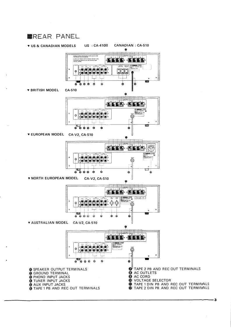 4SERVICE MANUALCA-510 GENERAL,CANADIAN,AUSTRALIAN,EUROPEAN,BRITISH MODELSCA-410II US MODELCA-V2 NORTH EUROPEAN,EUROPEAN,GENERAL,AUSTRALIAN MODELS■FRONT PANELg3460动口白山色①POWER SWITCHTREBLE CONTROLPOWER INDICATOR (LED)HEAD PHONE JACKSPEAKER SELECTION SWITCHREC OUT SELECTOR④OUTPUT LEVEL METERSINPUT SELECTOR SWITCHHIGH FILTER SWITCH®LOUDNESS CONTROLMODE SWITCHVOLUME CONTROLAUDIO MUTING SWITCHBALANCE CONTROLBASS CONTROLREAR PANEL (GENERAL MODELS)国AMAA8888888:SPEAKER OUTPUT TERMINALSTAPE 1 PB AND REC OUT TERMINALSGROUND TERMINALTAPE 2 PB AND REC OUT TERMINALSPHONO INPUT JACKS⑧AC OUTLETS④TUNER INPUT JACKS⑨AC CORD⑤AUX INPUT JACKSVOLTAGE SELECTORYAMAHA004361Printed in Japan 5.78.P.T.2K
