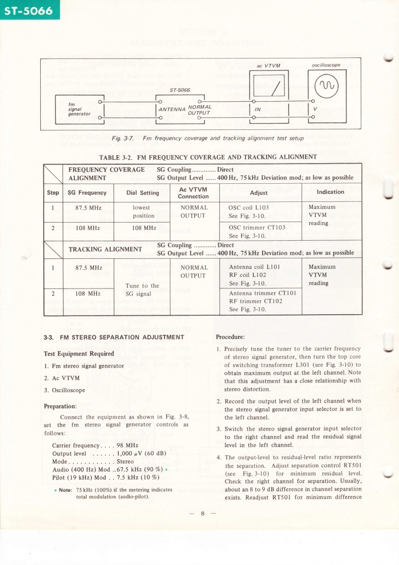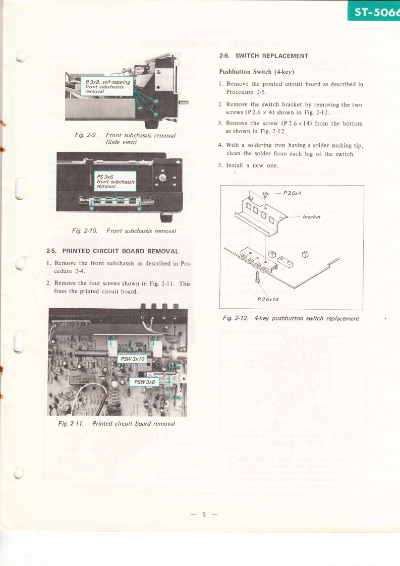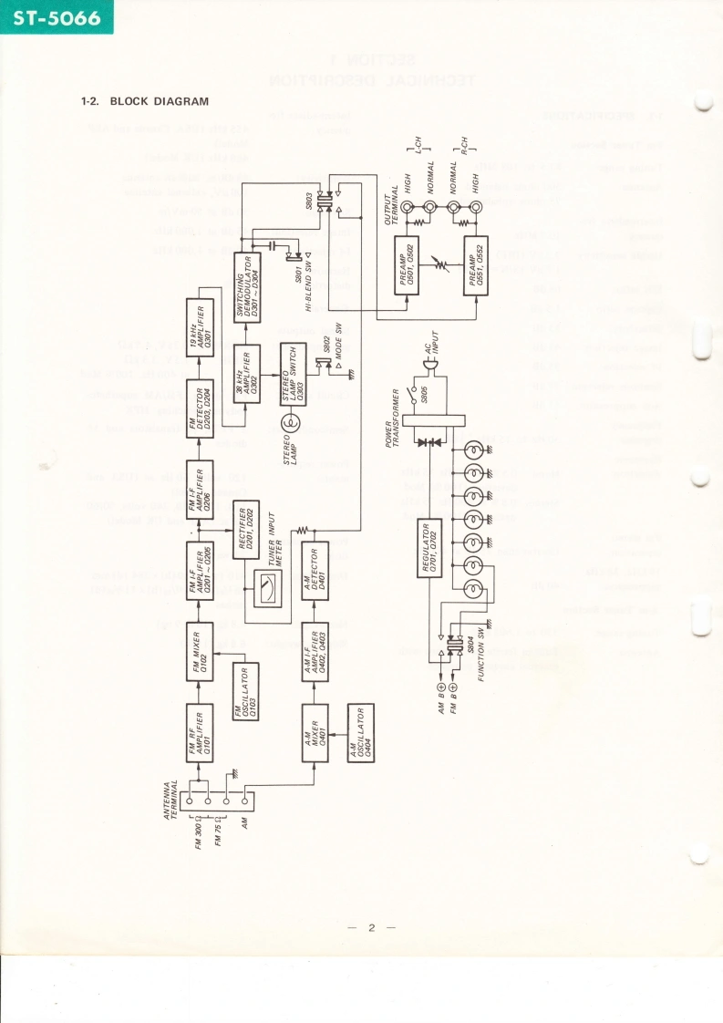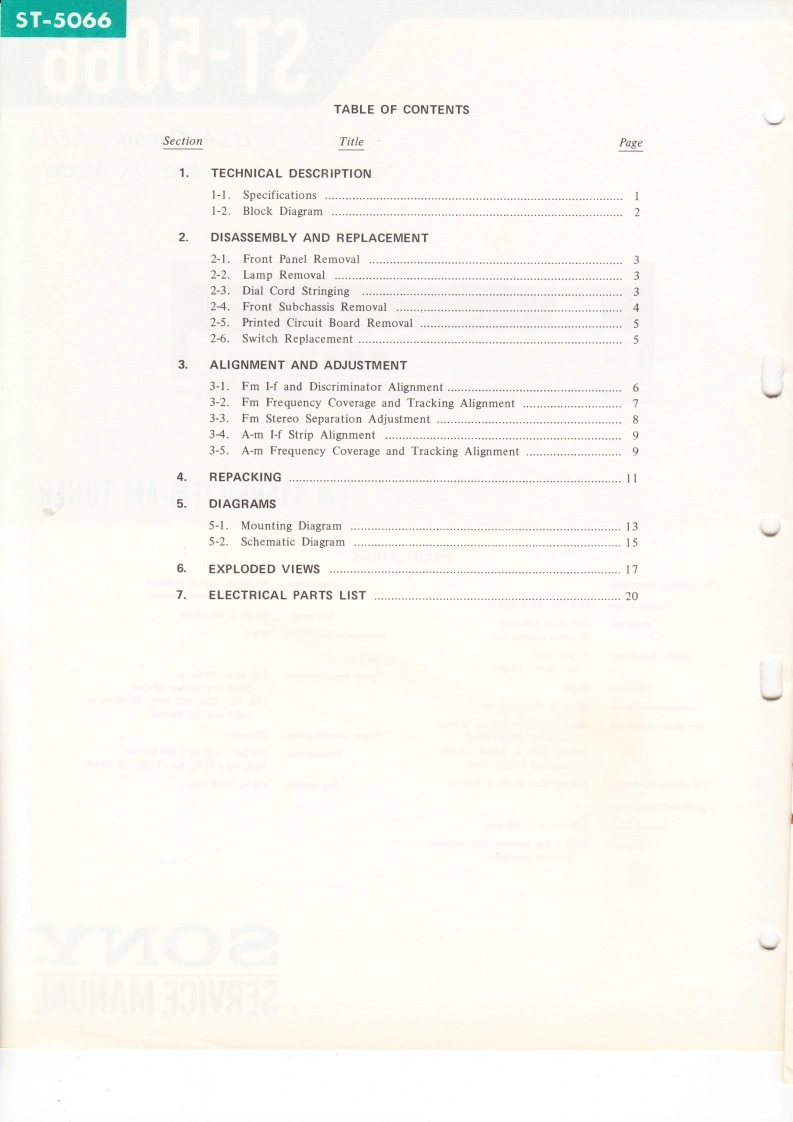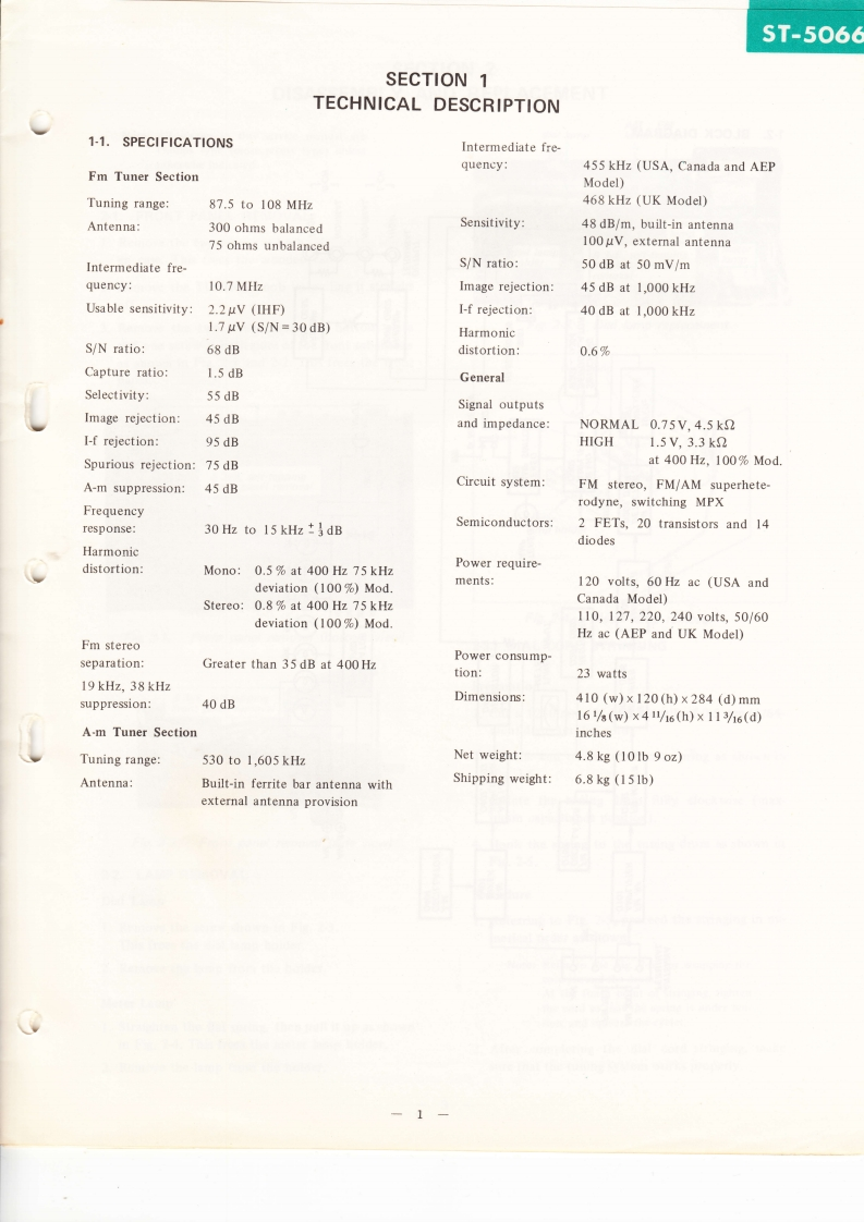 ST-5066USA,Canada,AEPand UK ModelSONY000000TM-AM5T-5066o0.0FM STEREO/FM-AM TUNERSPECIFICATIONSFM TUNER SECTIONSensitivity:48 dB/m,built-in antennaTuning range:87.5 MHz to 108 MHz100uV,external antennaAntenna:300 ohms balancedS/N ratio:50dB at 50mV/m75 ohms unbalancedHarmonic distortion:0.6%Usable sensitivity:2.2uV (IHF)1.7uV (S/N =30 dB)GENERALPower requirements:120 volts,60 Hz acS/N ratio:68 dB(USA and Canada Model)Frequency response:30 Hz to 15 kHz dB110.127,220.240 volts,50/60HzacHarmonic distortion:Mono 0.5%at 400 Hz 75 kHz(AEP and UK Model)deviation (100%)Mod.Power consumption:23 wattsStereo 0.8%at 400 Hz 75kHzDimensions:410(wlx120(hl×284(d)mmdeviation (100%)Mod.161/s (w)x 41116 (h)x 11316 (d)inchesFm stereo separation:Greater than 35 dB at 400 HzNet weight:4.8kg (101b 9oz)A-M TUNER SECTIONTuning range:530kHz to 1,605 kHzAntenna:Built-in bar antenna with externalantenna provisionSONYSERVICE MANUAL