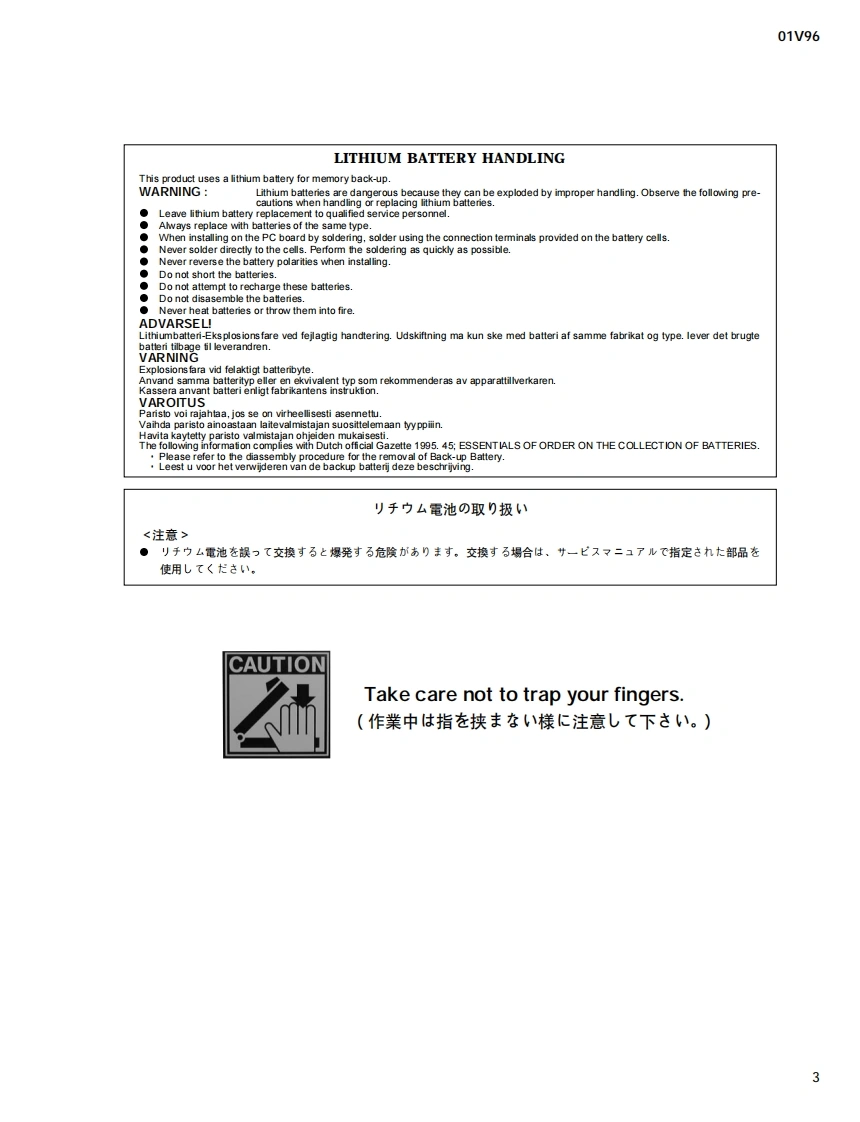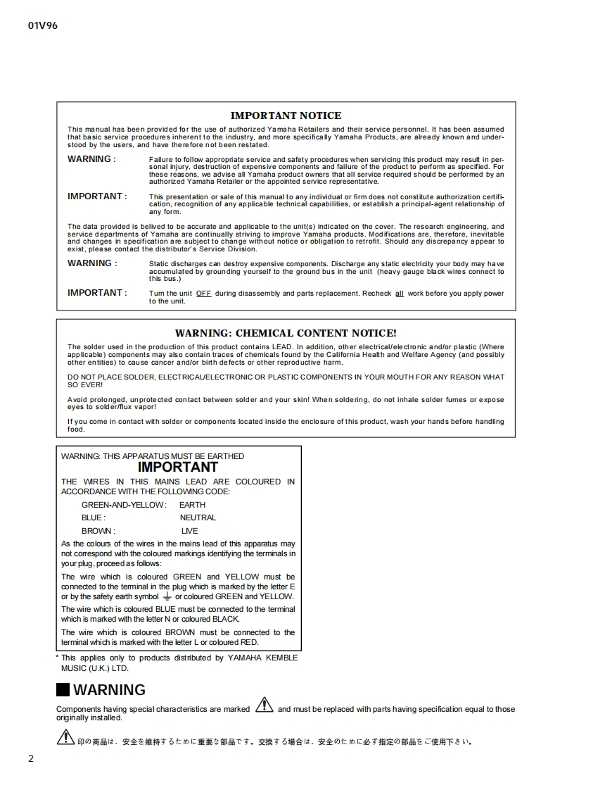 DIGITAL MIXING CONSOLEOIV96SERVICE MANUAL日■■■CONTENTS(目次)SPECIFICATIONS(然合仕樣)....DIMENS引ONS(寸法☒)…12PANEL LAYOUT(パ礻儿y7ヴ卜).1CIRCUIT BOARD LAYOUT(1二y卜亻了7卜)....2DISASSEMBLY PROCEDURE(分解手順)......23INSTALLING AN OPTIONAL CARD(才ブ>3力一0取门付付)…32LSI PIN DESCRIPTION(LSI端子機能表)..…33IC BLOCK DIAGRAM(ICブ口y夕☒)41CIRCUIT BOARDS(之一卜基板☒).46INSPECTIONS(梭查)..76/83SERVICE CHECK PROGRAM(-ピ又検查プ口分ラㄙ).90/102INITIALIZING THE01V96(01V96の初期化)...114TRANSMITTING PARAMETER SETTINGS VIA MIDI(BULK DUMP)(内部設定卷M1D1经由c出力(バ儿夕ダ之ブ機能)).115/117CHECKING THE BATTERY AND THE SYSTEM VERSION(バツ于一の残量为之又于ㄙのバ一少三之0確認).119CALIBRATING THE FADERS(フ工一分0丰ヤ)ブ一之ョ之)……119MIDI DATA FORMAT(MIDIデ-夕フ才一マy卜)...120MIDI IMPLEMENTATION CHARTICO-PULH(MIDI不>ブ刂メ之テ之ョ之于ヤ一卜134PARTS LIST可竹一-E1子二3了柱工门作子35化7[ECF:每地素系漂白心k方)老使用LT1事,BLOCK DIAGRAM(ブ口ッ夕ダ亻了分ラㄙ)色soOVERALL CONNECTOR CIRCUIT DIAGRAM(総口礻夕夕接続回路☒)This document is printed on chlorine fee (ECF)paper with soy inkCIRCUIT DIAGRAM(回路☒)PA011680YAMAHA200304-250000HAMAMATSU,JAPAN1.329K-1933 FT:Printed in Japan '03.03