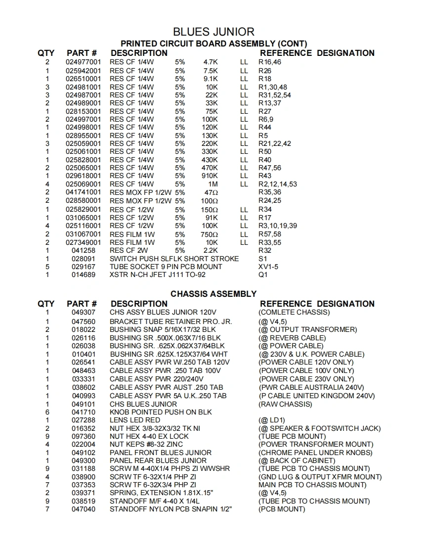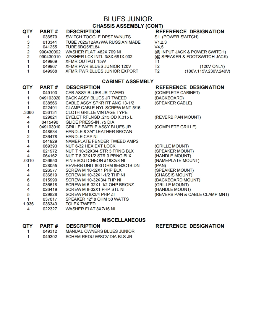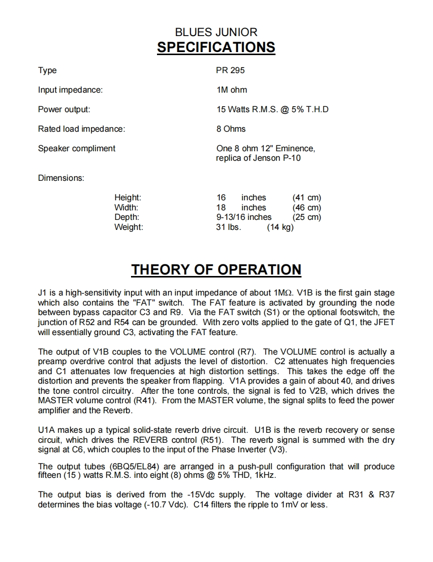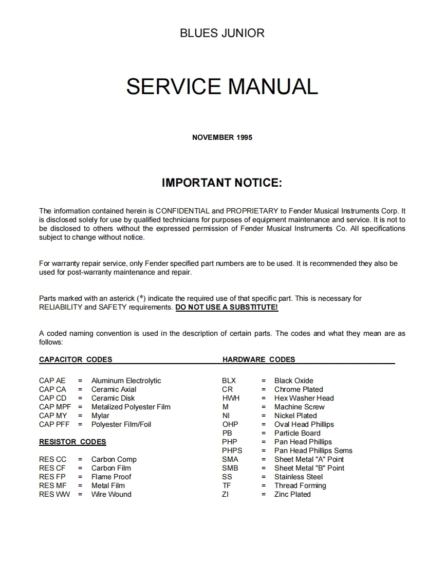 BLUES JUNIORELECTRONICSSERVICE MANUALFenderCONTENTS:NoticesSpecificationsTheory ofoperationParts lists:PCB assemblyChassis assemblyCabinet assemblyMiscellaneousSchematics/Service diagramFender Musical Instruments Corp.,8860 E.Chaparral Road Suite 100 Scottsdale,AZ 85250