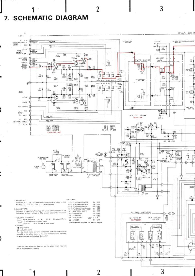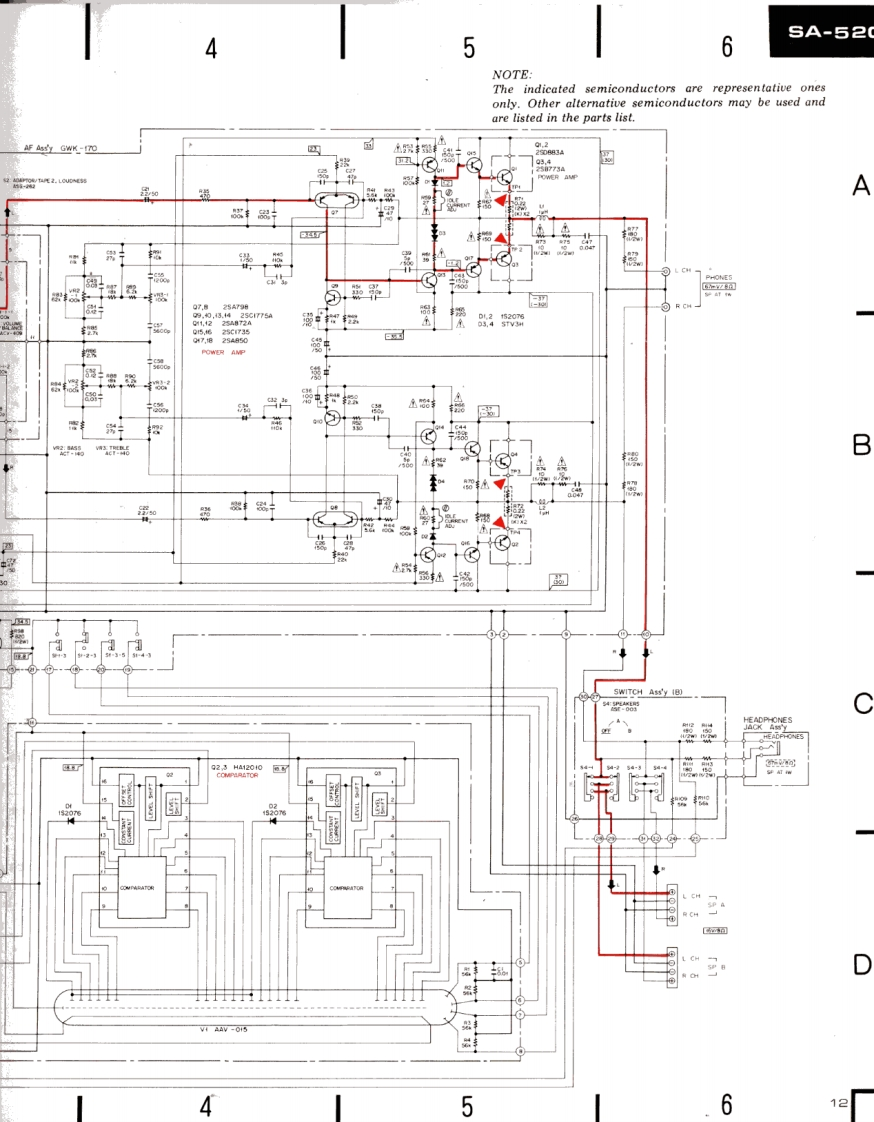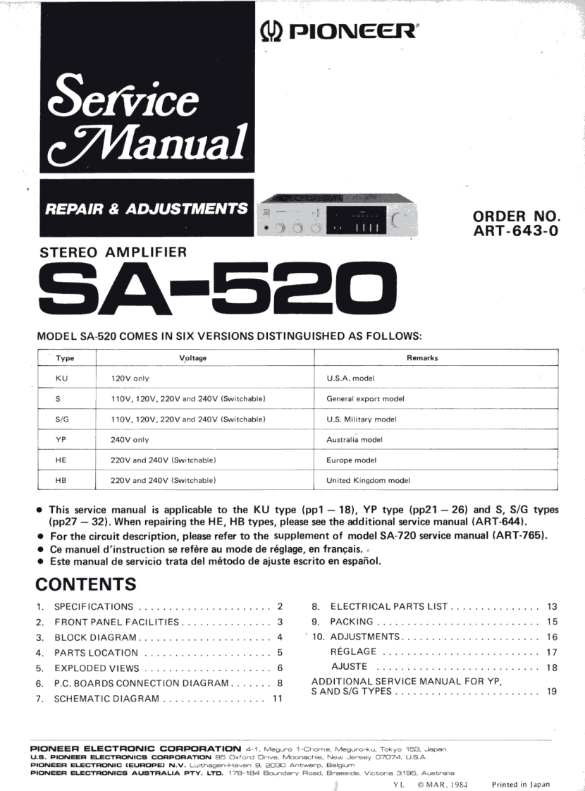 PIONEERServicec ManualREPAIR ADJUSTMENTSORDER NO.)6··1111ART-643-0STEREO AMPLIFIERSA-520MODEL SA-520 COMES IN SIX VERSIONS DISTINGUISHED AS FOLLOWS:TypeVoltageRemarksKU120V onlyU.S.A.models110V,120V,220V and 240V (Switchable)General export modelS/G110V,120V,220V and 240V (Switchable)U.S.Military modelYP240V onlyAustralia modelHE220V and 240V (Switchable)Europe modelHB220V and 240V (Switchable)United Kingdom model.This service manual is applicable to the KU type (pp1-18),YP type (pp21-26)and S,S/G types(pp27-32).When repairing the HE,HB types,please see the additional service manual(ART-644).For the circuit description,please refer to the supplement of model SA-720 service manual (ART-765).Ce manuel d'instruction se refere au mode de reglage,en francais..Este manual de servicio trata del metodo de ajuste escrito en espanol.CONTENTS1.SPECIFICATIONS...·,·,·,,·,·28.ELECTRICAL PARTS LIST..·······132.FRONT PANEL FACILITIES...............39.PACKING·153.BLOCK DIAGRAM.,···410.ADJUSTMENTS.·········164.PARTS LOCATION········5REGLAGE,,·,,,··175.EXPLODED VIEWS........·,.,,.·,,,·6AJUSTE:·186.P.C.BOARDS CONNECTION DIAGRAM.····ADDITIONAL SERVICE MANUAL FOR YP,7.SCHEMATIC DIAGRAM.................S AND S./G TYPES..,..·.·,,.··,:,·,··1911PIONEER ELECTRONIC CORPORATION 4-1.Meguro 1-Chome.Meguro-ku.Tokyo 153.JoponU.S.PIONEER ELECTRONICS CORPORATION BS Oxford Drive.Moonechie.New Jersey 07074.U.S.A.PIONEER ELECTRONIC (EUROPE]N.V.Luithagen-Haven 9.2030 Antwerp.BelgiumPIONEER ELECTRONICS AUSTRALIA PTY.LTD.178-184 Boundary Road,Braeside.Victoria 3195.AustraliaYL MAR.1981 Printed in Japan