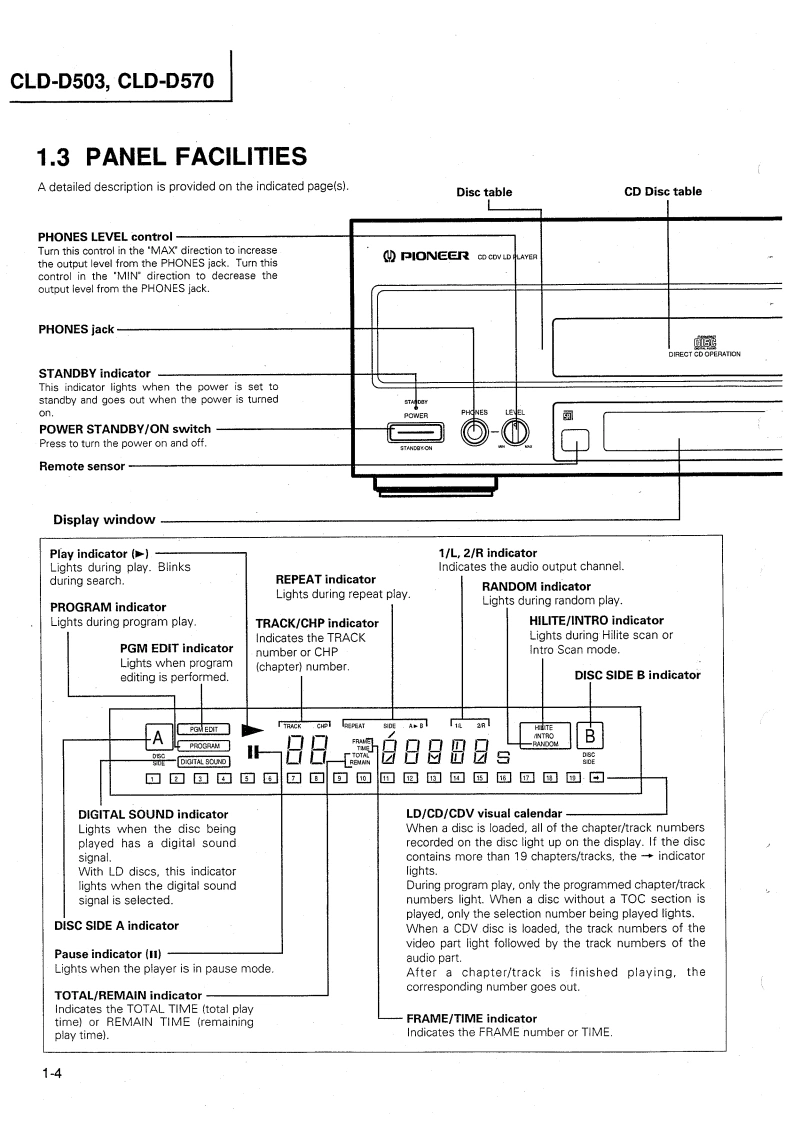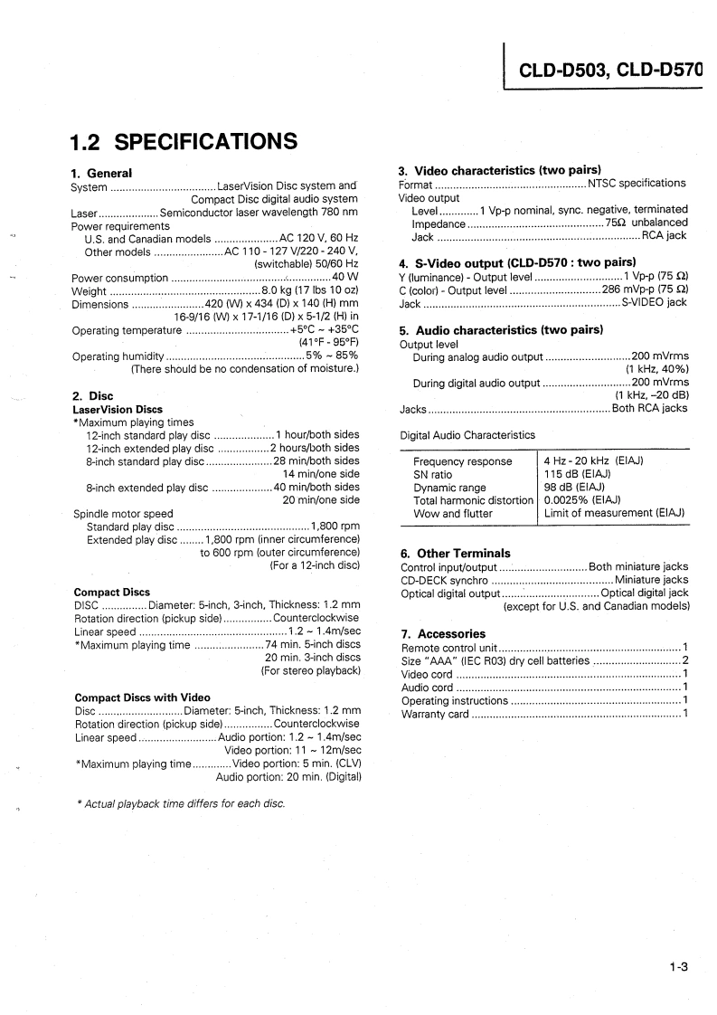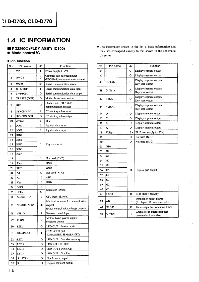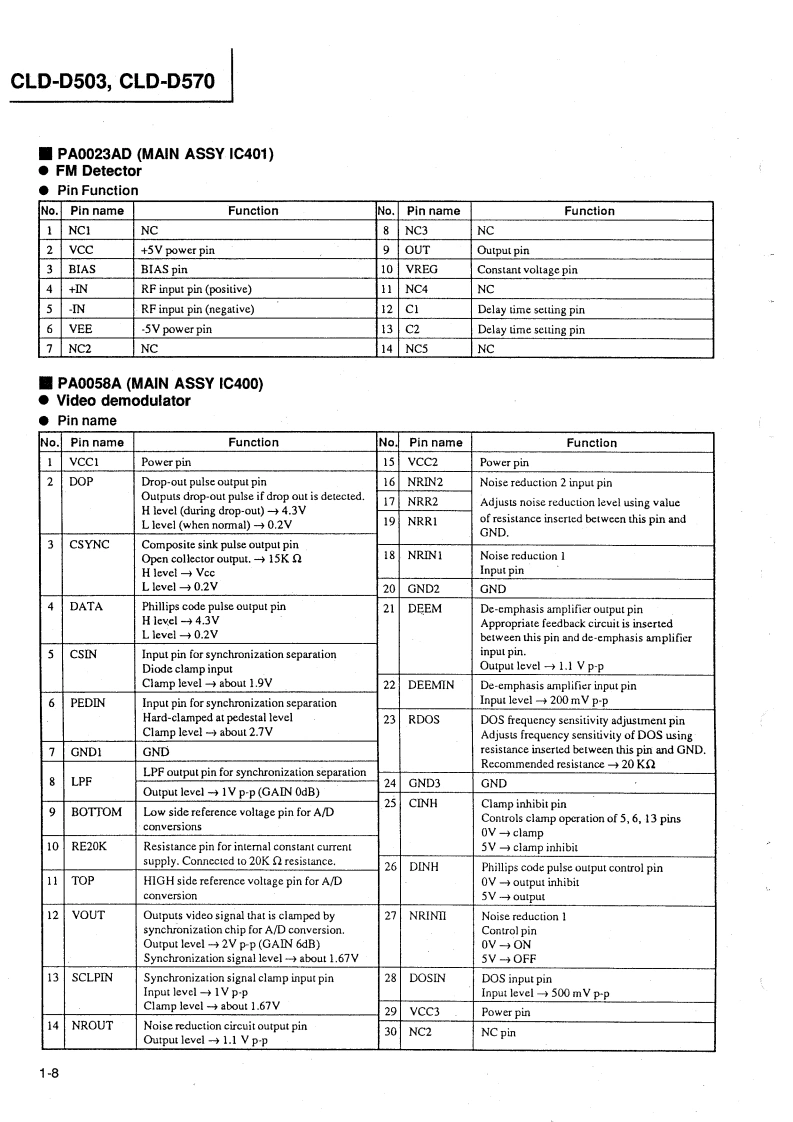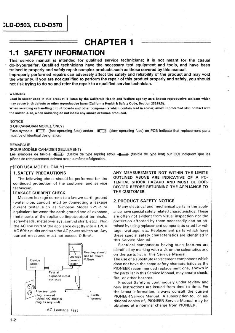 ②PIONEER:The Art of EntertainmentServiceManualORDER NO.RRV1065The chapter 1 of this Service Manual will not be reprinted.On your additional orders,we may supply only thechapter 2.For the chapter 1.please make coples and attach to the chapter 2 at your side if necessary.CD CDV LD PLAYERCLD-D503CLD-D570THIS MANUAL IS APPLICABLE TO THE FOLLOWING MODEL(S)AND TYPE(S).The voltage can be converted by theTypeModelPower Requirementfollowing method.KUCLD-D503AC120V一KCCLD-D503AC120V一RDCLD-D570AC110-127V/220-240VWith the voltage selector.For the circuit and mechanism descriptions,refer to the service guide RRV1066 for CLD-D503.CONTENTSCHAPTER 11.1 SAFETY INFORMATION.....1-21.2 SPECIFICATIONS…1-31.3 PANEL FACILITIES…1-41.41 C INFORMATION+4…1-61.5 ERROR CODE TABLE...1-201.6 ADJUSTMENTS..1-221.7 PCB PARTS LIST......1-331.8 PARTS LIST FOR EXPLODED VIEWSAND PACKING+…1-37CHAPTER 22.1 PACKING AND EXPLODED VIEWS 2-22.2 SCHEMATIC AND PCB CONNECTIONDIAGRAMS+44…2-11PIONEER ELECTRONIC CORPORATION 4-1,Meguro 1-Chome,Meguro-ku,Tokyo 153.JapanPIONEER ELECTRONICS SERVICE INC.P.O.Box 1760,Long Beach,California 90801 U.S.APIONEER ELECTRONICS OF CANADA,INC.300 Allstate Parkway Markham,Ontario L3R OP2 CanadaPIONEER ELECTRONIC [EUROPE]N.V.Haven 1087 Keetberglaan 1,9120 Melsele,BelgiumPIONEER ELECTRONICS AUSTRALIA PTY.LTD.178-184 Boundary Road,Braeside,Victoria 3195,Australia TEL:[03]580-9911PIONEER ELECTRONIC CORPORATION 1994T-FFJ FEB.1994 Printed in Japan