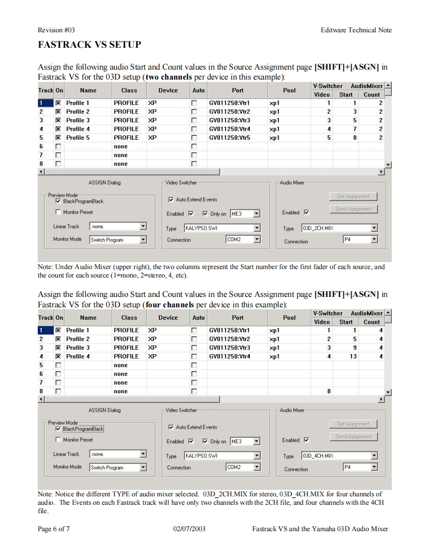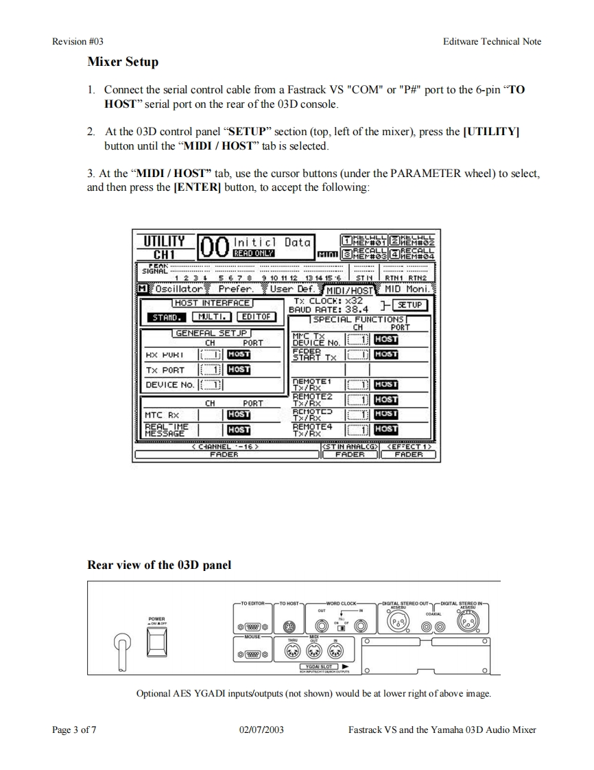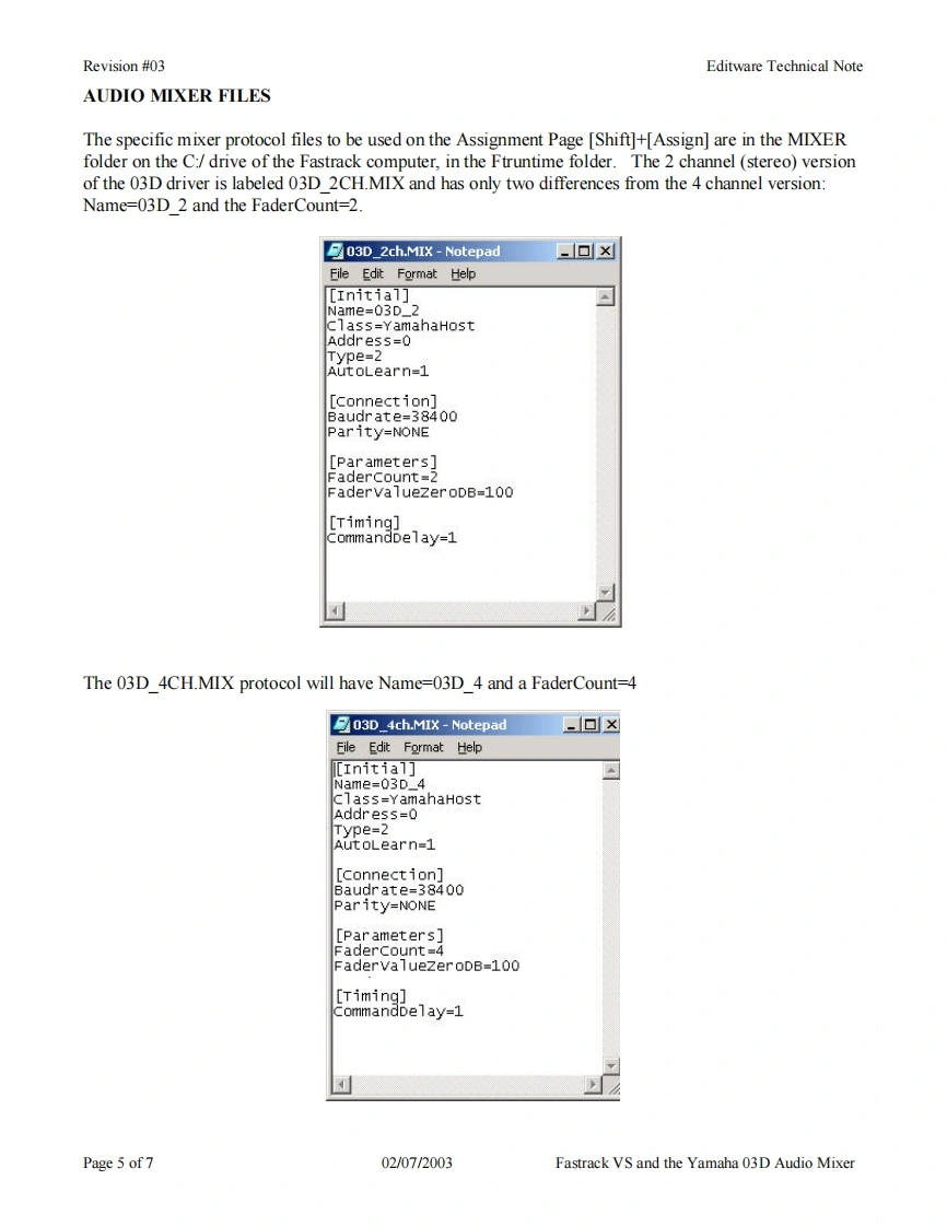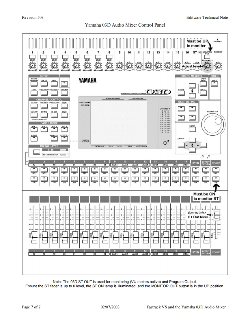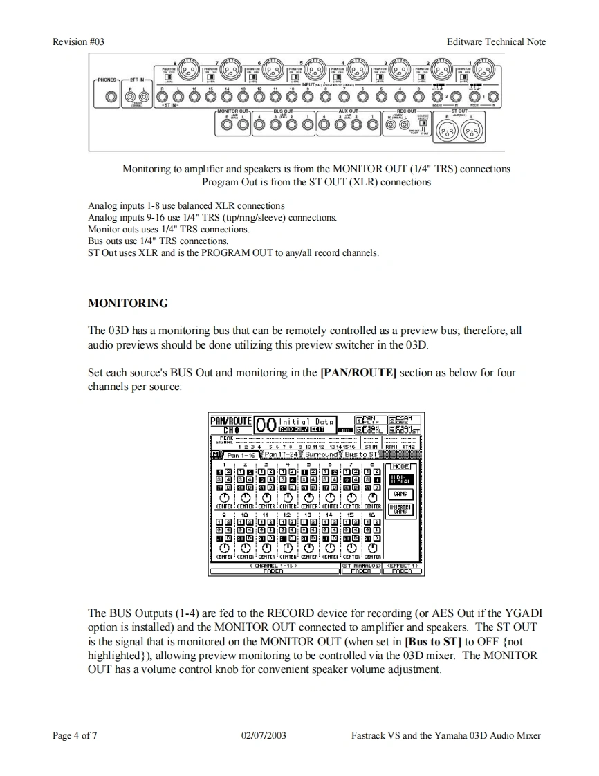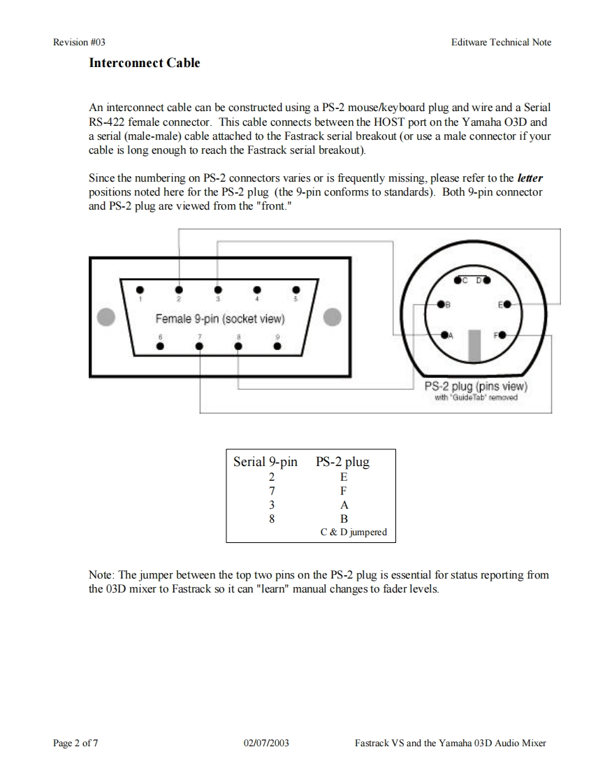 Revision #03Editware Technical NoteEditwareGRASS VALLEY,CALIFORNIATECH NOTEFastrack VS Version 2.1 and laterYAMAHA 03D SERIAL AUDIO MIXER用阳The Fastrack VS hybrid editing system interfaces to the 03D Serial Audio Mixer with a 6-pin DINto 9-pin RS-422 serial control cable and Yamaha 03D audio mixer serial protocol.Direct controlof each individual fader and the leaming of manual adjustments are possible.Page 1 of702/07/2003Fastrack VS and the Yamaha 03D Audio Mixer