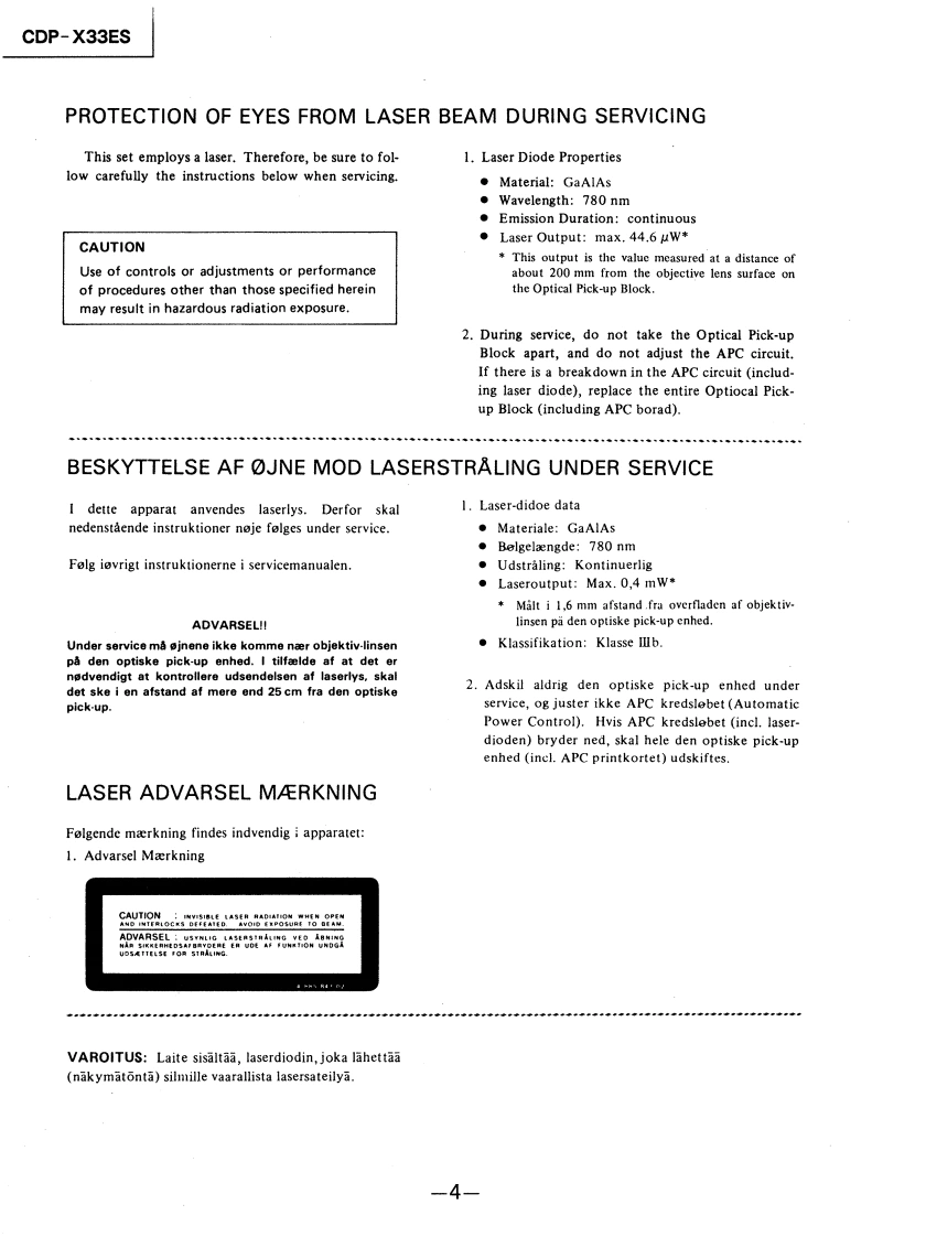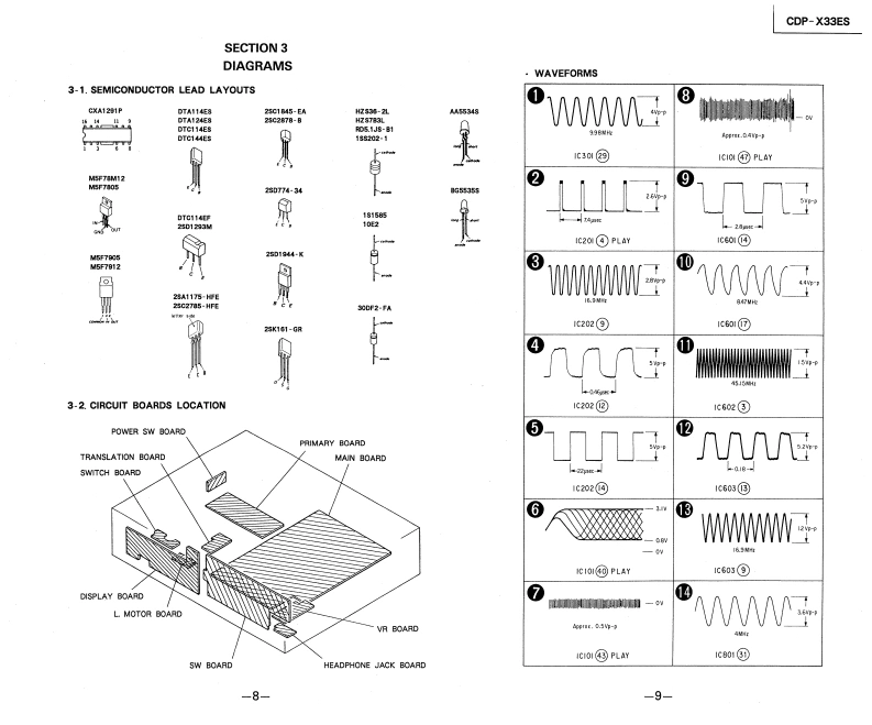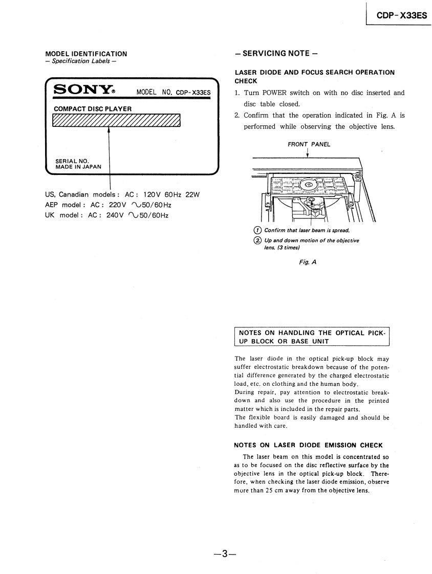 CDP-X33ESSERVICE MANUALUS ModelCanadian ModelAEP ModelUK ModelModel Name Using Similar MechanismCDP-338ESD/608ESDCD Mechanism NameCDM11E-6CBase Unit NameBU-6CSPECIFICATIONSCompact disc playerRemote commander (RM-D590)Frequency r阳sponse2H-20kHz±0,5d8Remote controlInfrared controlSignal to noise ratioMore than 113 d8systemDynamic rangeMore than 100 dBPower3 V DC with two batterics size AAHarmonic distortionrequirements(EC designation RB)Less than 0.0020%Dimensions67×18×175mm(w/h/dChannel separationMore than 110 dB(2/ax/a×7 inches)Weight15095.3ozIncluding batteriesOutputsLINE OUTOutput level 2 V(at 50 kiloohms)(FIXED)(phonoLoad impedance over 10 kiloohmsSupplied accessoriesjacks)1LINE OUTConnecting cordOutput level max.2 V (at 50 kiloohms)(VARIABLE)(2 phono plugs+2 phono plugs)Load impedance over 50 kiloohms(phono jacks)RemoteDIGITAL OUTcommanderWave length 660 nm(OPTICAL)(opticaOutput level -18 dBmSize AA batteriesoutput connector)HEADPHONESOutput level max.28 mWStereo phoneLoad impedance 32 ohmsOptional accessoryjack)Audio optical connecting cord POC-15Design and specifications subject to change without notice.GeneralPowerAEP Modelrequirements220 V AC (or 240 V AC adjustable byUX680omne.50/eoz240 V AC (or 220 V AC adjustable byUs Mod120V60zPower20WconsumptionDimensions430×125×375mmw/h/dapprox..including(17×5×147/.inches)projections)COMPACT DISC PLAYERWeight (approx).10 kg (22 Ibs 1 oz)要明付饼利招0工的轻SONY