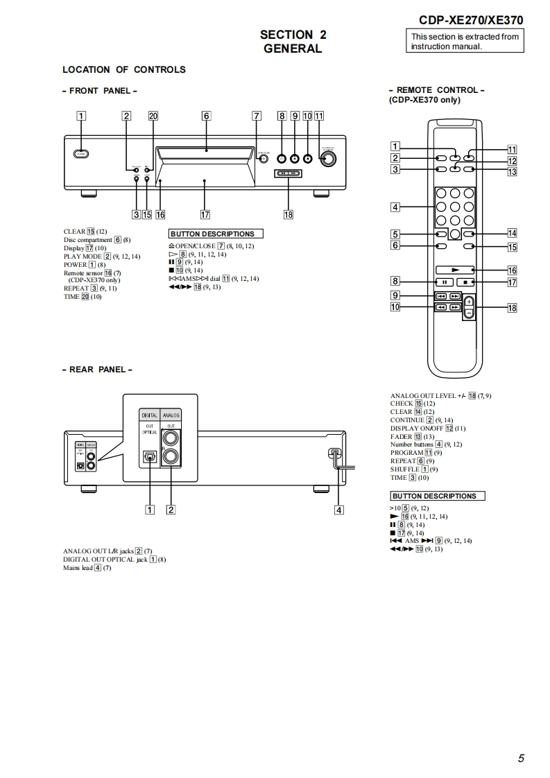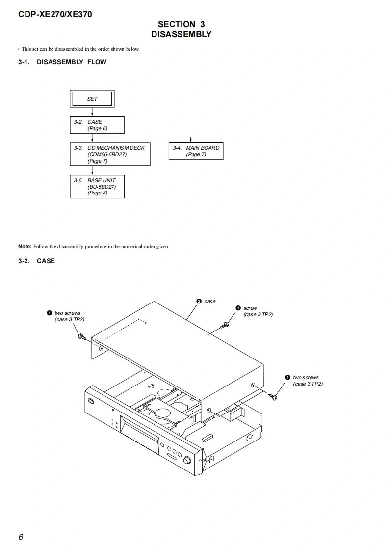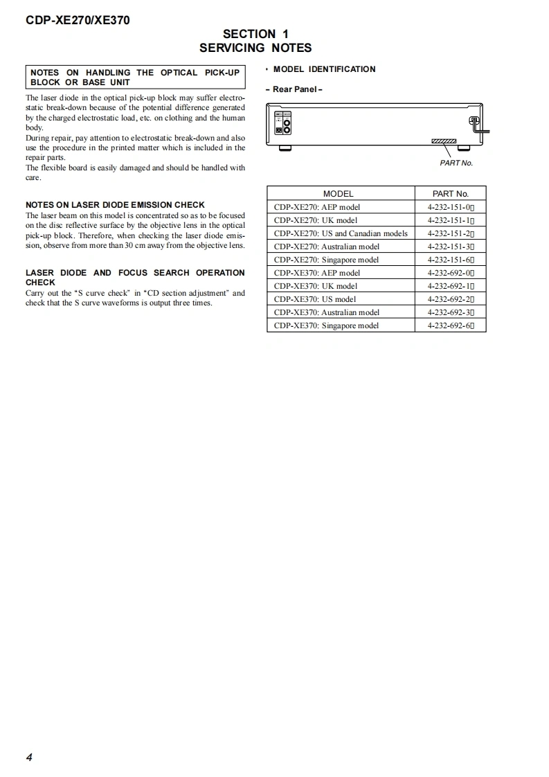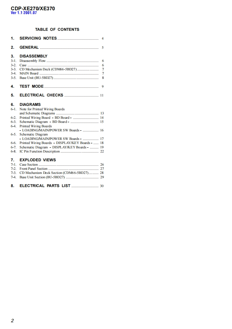 CDP-XE270/XE370SERVICE MANUALUS ModelCDP-XE270/XE370Ver1.12001.07Canadian ModelCDP-XE270AEP ModelUK ModelEModelo00⊙Australian ModelCCDP-XE270/XE370Photo:CDP-XE370Model Name Using Similar MechanismNEWCD Mechanism TypeCDM66-5BD27Base Unit NameBU-5BD27Optical Pick-up NamePXR-104XSPECIFICATIONSCompact disc playerGeneralLaserSemiconductor laser (Power requirements780nm)Where purchasedEmission duration:Power requirementscontinuousUS,Canadian models 120 VAC,60 HzFrequency response2zto20kHz±0.5dBMore than 93 dBAEP,UK models230VAC50W60H2Dynamic rangeHarmonic distortion0.0045%Australian model240 VAC,50/60 HzOutputsSingapore model220V-230VAC,500HzPower consumption11WJackMaximumLoadDinons(approx.)430x95x290mmtypeoutput level im pedance(w/hd)incl.projecting partsANALOGPhono2VOver 10Mass (approx.)CDP-XE370:3.2 kgoUTjacks(t50kilohmsCDP-XE270:3.2 kgkilohms)DIGITALOptical-18dBmWave length:Supplied accessoriesOUToutput660nm(OPTICAL)connectorme)C)R6(size AA)batteries(2)(CDP-XE370 only)Design and specifications are subject to changewithout notice.COMPACT DISC PLAYER9-929-591-12Sony Corporation2001G0500-1Home Audio Company©2001.7Shinagawa Tec Service Manual Production GroupSONY