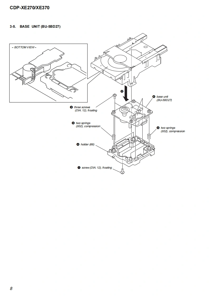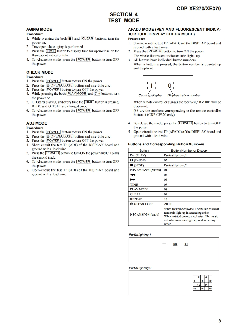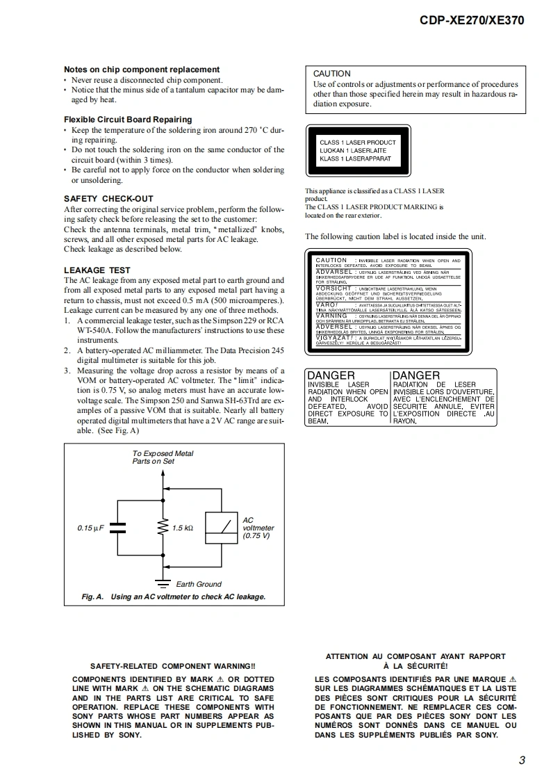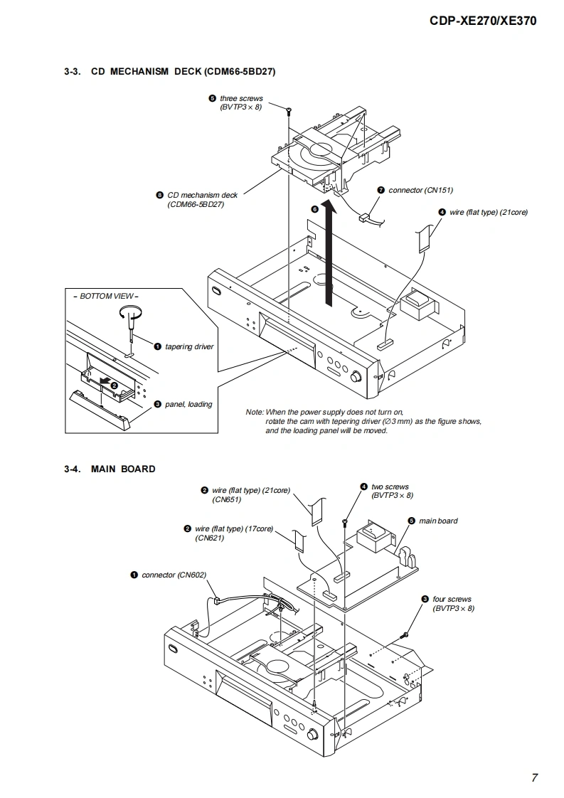 CDP-XE270/XE370SERVICE MANUALUS ModelCDP-XE270/XE370Ver1.12001.07Canadian ModelCDP-XE270AEP ModelUK ModelEModelo00⊙Australian ModelCCDP-XE270/XE370Photo:CDP-XE370Model Name Using Similar MechanismNEWCD Mechanism TypeCDM66-5BD27Base Unit NameBU-5BD27Optical Pick-up NamePXR-104XSPECIFICATIONSCompact disc playerGeneralLaserSemiconductor laser (Power requirements780nm)Where purchasedEmission duration:Power requirementscontinuousUS,Canadian models 120 VAC,60 HzFrequency response2zto20kHz±0.5dBMore than 93 dBAEP,UK models230VAC50W60H2Dynamic rangeHarmonic distortion0.0045%Australian model240 VAC,50/60 HzOutputsSingapore model220V-230VAC,500HzPower consumption11WJackMaximumLoadDinons(approx.)430x95x290mmtypeoutput level im pedance(w/hd)incl.projecting partsANALOGPhono2VOver 10Mass (approx.)CDP-XE370:3.2 kgoUTjacks(t50kilohmsCDP-XE270:3.2 kgkilohms)DIGITALOptical-18dBmWave length:Supplied accessoriesOUToutput660nm(OPTICAL)connectorme)C)R6(size AA)batteries(2)(CDP-XE370 only)Design and specifications are subject to changewithout notice.COMPACT DISC PLAYER9-929-591-12Sony Corporation2001G0500-1Home Audio Company©2001.7Shinagawa Tec Service Manual Production GroupSONY