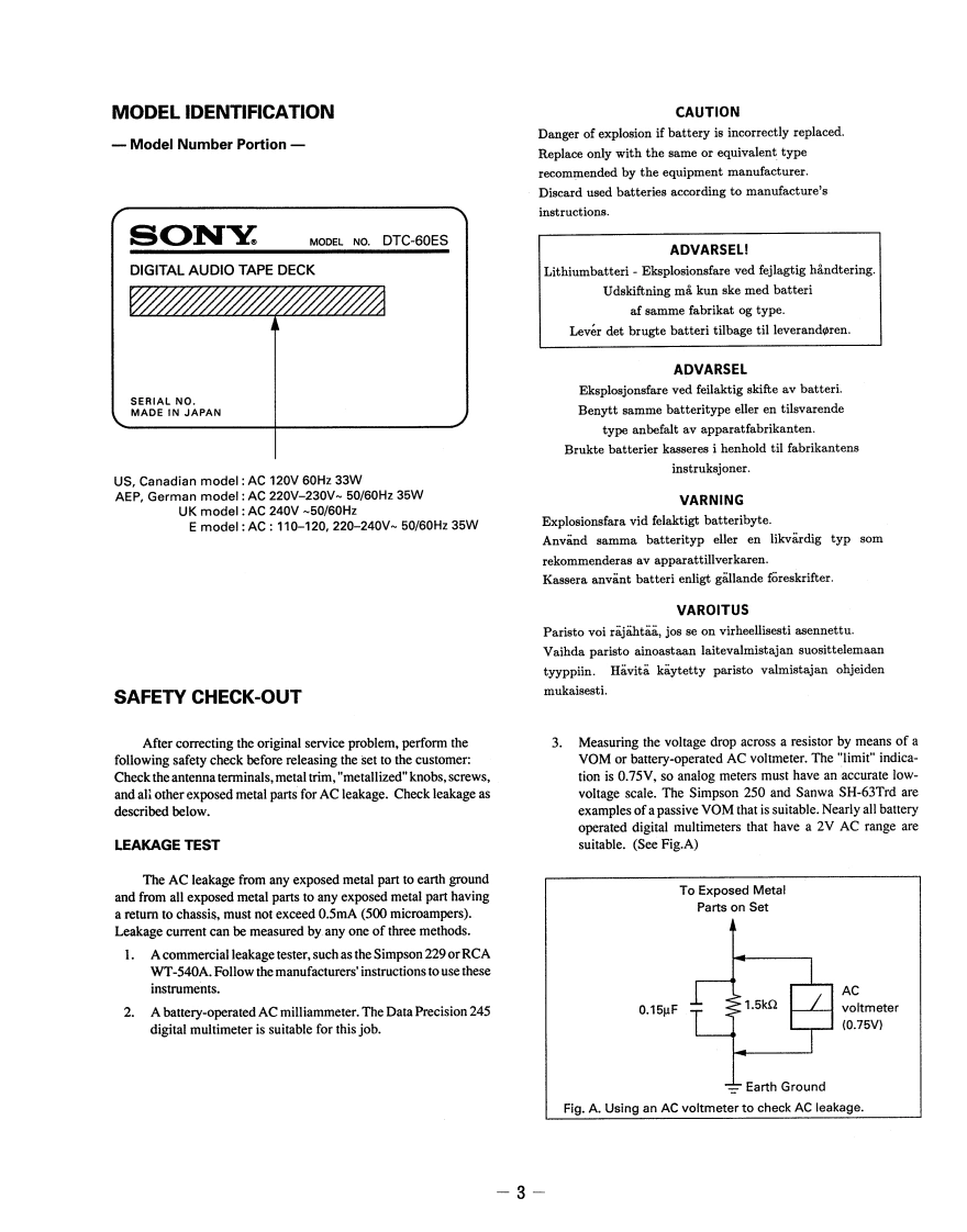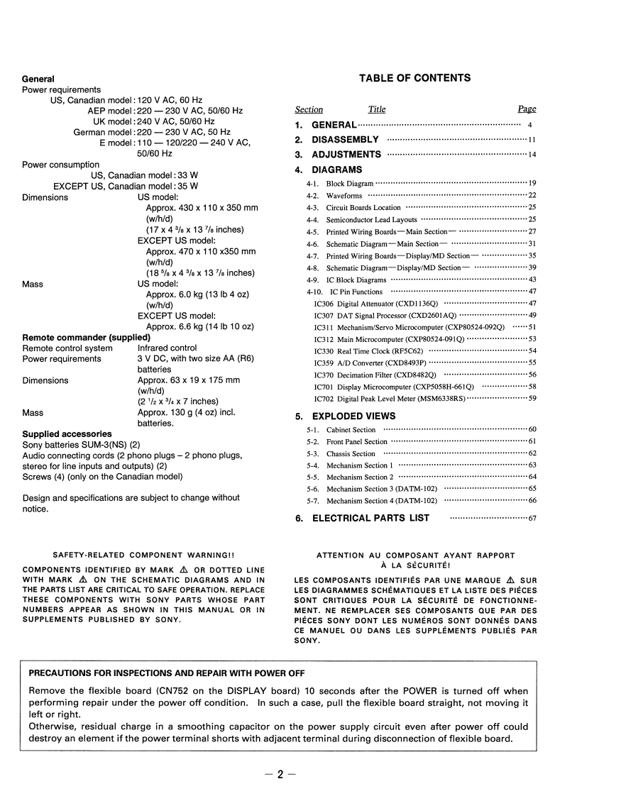 微电子时空基准带好音乐的休闲时光fzmcu.taobao.comDTC-60ESSERVICE MANUALUS ModelCanadian ModelAEP ModelUK ModelEModelPhoto:Black typeSPECIFICATIONSModel Name Using Similar MechanismDTC-59ESTapeDigital audio tapeTape Transport Mechanism TypeDATM-102Recording headRotary headRecording timeStandard:120 minutes.Wow and flutterBelow measurable limitLong-play mode:240 minutes(with DT-120)】(±0.001%W.PEAK)Tape speedStandard:8.15 mm/s,Long play mode:4.075 mm/sInputImpedanceDrum rotationJack typeRated input levelStandard:2,000 rpm,Long-play mode:1,000 rpmLINE IN-4 dBsError correctionDouble Read Solomon codephono jack47 kohms0.5Vp-p,±20%Tapephono jack75 ohmsTrack pitch13.6m(20.4m)DIGITAL INoptical jackSampling frequency48 kHz,44.1 kHz,32 kHzModulation system8-10 ModulationTransfer rate2.46 Mbit/sec.OutputNumber of channel2 channels,stereoJack typeRatedLoadD/A conversion (Quantization)outputStandard:16-bit linearLong-play mode:12-bitLINE OUTphono jack470 ohms-4 dBsMore thannon-linear10 kohmsFrequency responseStandard:2-22,000 Hz(±0.5dB)HONESstereo220 ohms0.6mW32 ohmsLong-play mode:2-14,500 Hzphone jack(±0.5dB)Signal to noise ratioStandard:more than 92 dBDIGITALphono jack75 ohms0.5 Vp-pLong-play mode:more thanOUT±20%92 dBDynamic rangeStandard:more than 92 dBDIGITAL OUT (optical jack):wavelength 660 nmLong-play mode:more than92 dB-Continued on next pageTotal harmonic distortionStandard:less than 0.0045%(1 kHz)Long-play mode:less thanDIGITAL AUDIO TAPE DECK0.08%(1kH2)SONY