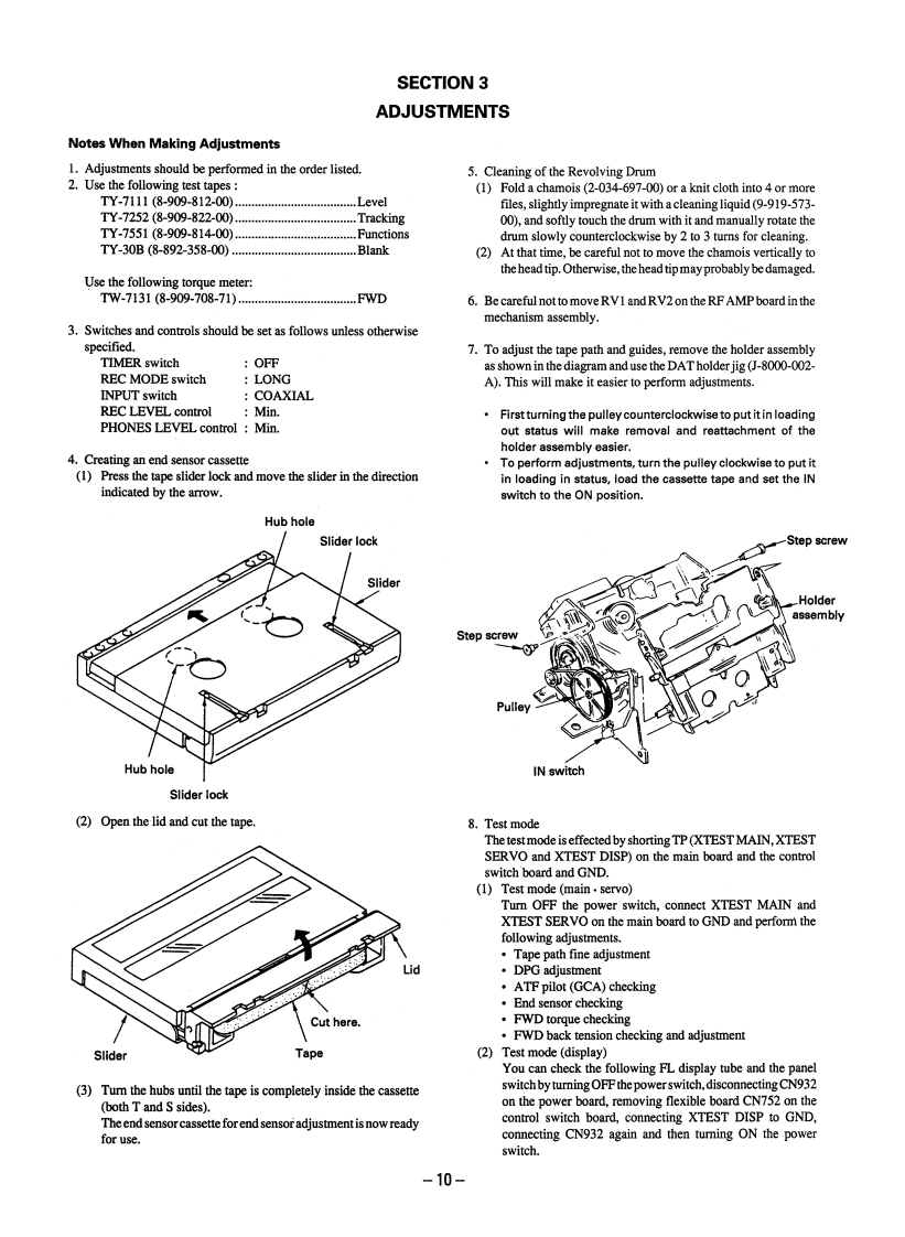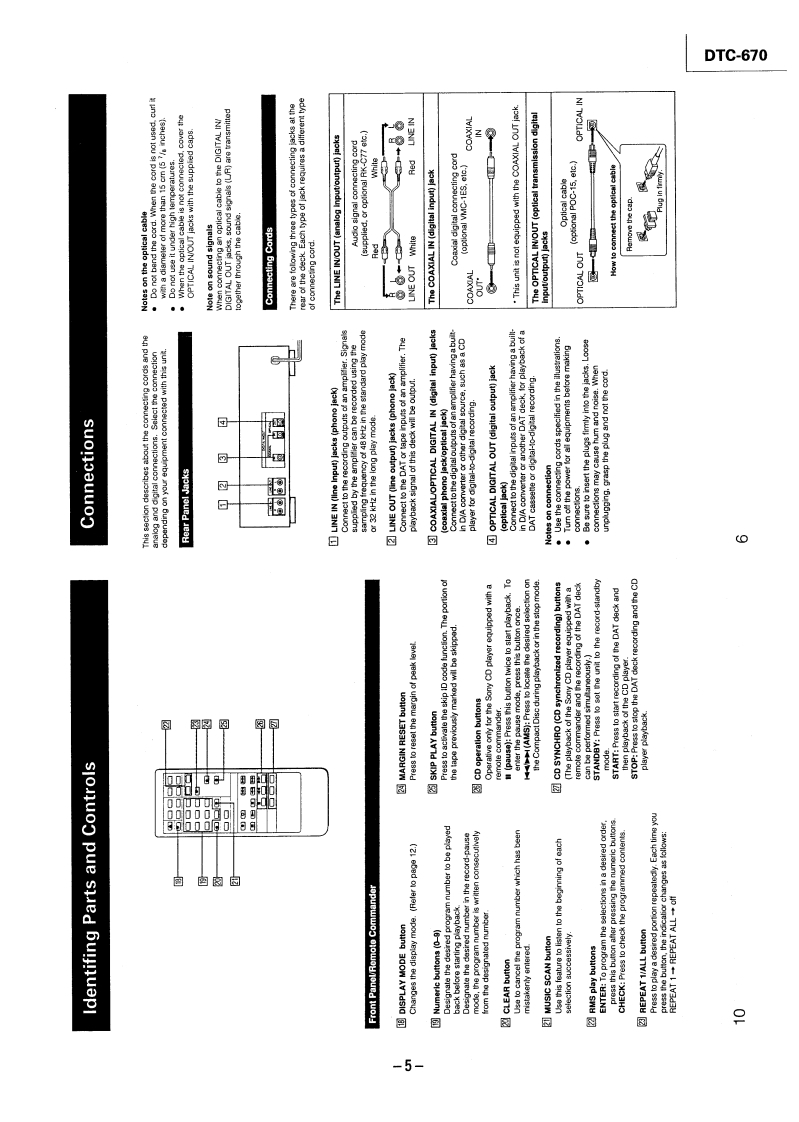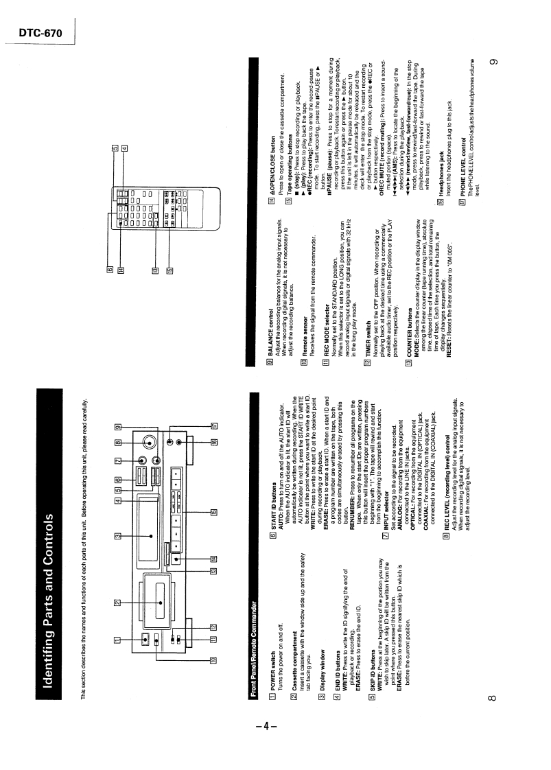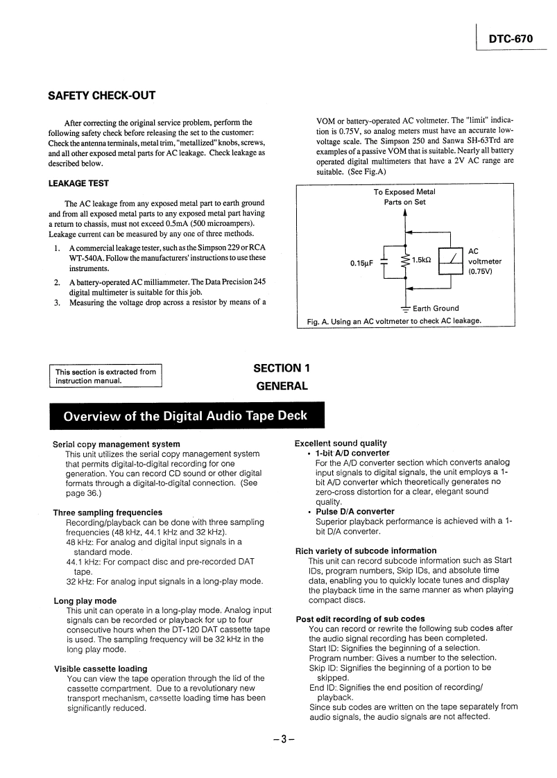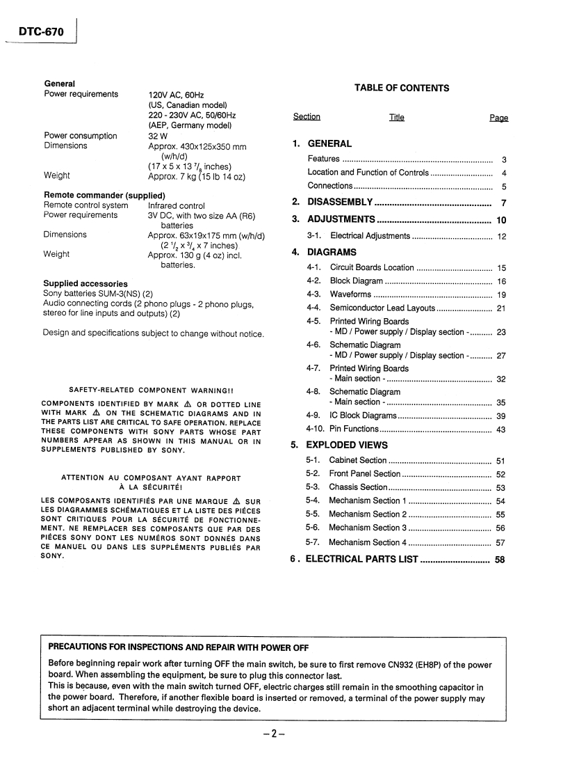 微电子时空基准带好音乐的休闲时光fzmcu.taobao.comDTC-670SERVICE MANUALUS ModelCanadian ModelAEP ModelSPECIFICATIONSModel Name Using Similar Mechanism DTC-57ESTapeDigital audio tapeTape Transport Mechanism TypeDATM-100Recording headRotary headRecording timeStandard:120 minutesLong-play mode:240 minutes(with DT-120)Wow and flutterTape speedStandard:8.15 mm/s,Long play mode:4.075 mm/sDrum rotationStandard:2,000 rpm.InputLong-play mode:1,000 rpmJack typeImpedanceRated input levelError correctionDouble Read Solomon codeLINE INphono jack47 kohms-4 dBsTapeTrack pitch13.6um(20.4m)DIGITAL INphono jack75 ohms0.5Vp-p,20%Sampling frequency48 kHz,44.1 kHz,32 kHzModulation system8-10 ModulationDIGITAL INoptical jackTransfer rate2.46 Mbit/sec.Number of channel2 channels,stereoD/A conversion(Quantization)OutputJack typeImpedanceRatedLoadStandard:16-bit linearoutputimpedanceLong-play mode:12-bitnon-linearphono jack470 ohms-4 dBsMore thanFrequency responseStandard:2-22,000 Hz(+0.5LINE OUT10 kohmsdB)Long-play mode:2-14,500 Hzstereo220 ohms1.3mW32 ohms(±0.5dB)PHONESSignal to noise ratioStandard:more than 90 dBphone jackLong-play mode:more than 90dBDIGITAL OUT (optical jack):wavelength 660 nmDynamic rangeStandard:more than 90 dBLong-play mode:more than 90dBTotal harmonic distortionStandard:less than 0.005%(1continued on next pagekHz)Long-play mode:less than0.08%(1kHz)DIGITAL AUDIO TAPE DECKBelow measurable limit(±0.001%W.PEAK)SONY