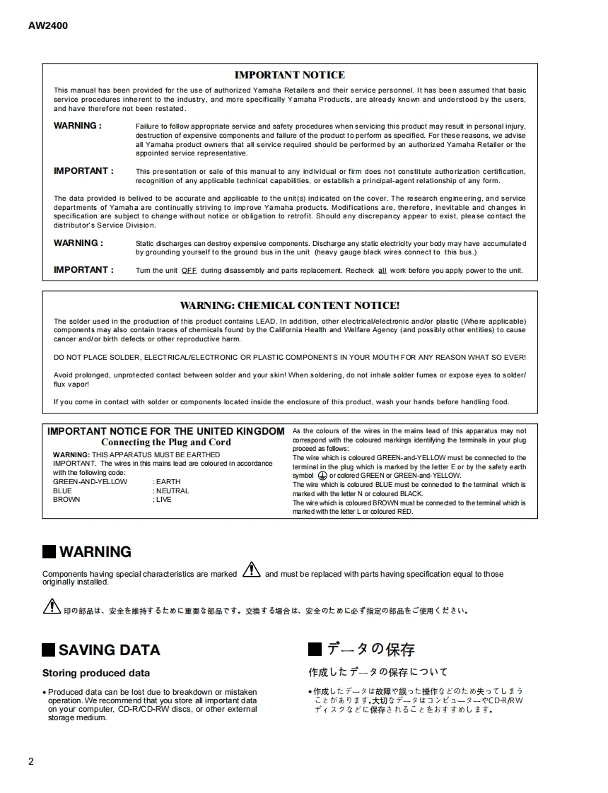 PROFESSIONAL AUDIO WORKSTATIONW/L4▣▣SERVICE MANUAL国验■■■CONTENTS(目次)PROTECTION OF EYES FROM LASER BEAMINSTALLING AN OPTIONAL CARDDURING SERVICING(才ブ之3)力一ドの取)付付)93/94(作業中の上一圹一光線办5の目0保護).…3RESTORING THE INTERNAL HARD DISK TOSPECIFICATIONS(総合仕樣)416THE FACTORY-SET CONDITIONPANEL LAYOUT(パ礻儿V才了ヴ卜)…8(内藏八一ドデ亻又夕苍工場出荷時の設定仁戾寸)DIMENSIONS(寸法☒).16...95/96CIRCUIT BOARD LAYOUTMESSAGE LIST(Xy七-)又卜)..97100(1二y卜上亻了ヴ卜)17MIDI IMPLEMENTATION CHART...103DISASSEMBLY PROCEDURE(分解手順)..19MIDI DATA FORMAT ........LSI PIN DESCRIPTION(LSI端子機能表).30.104PARTS LISTIC BLOCK DIAGRAM(ICブ口y夕☒).36BLOCK DIAGRAM(ブ口y夕ダ亻7分ラㄙ)CIRCUIT BOARDS(一卜基板☒)39NIRING(結線☒)INSPECTIONS(検查)62/67CIRCUIT DIAGRAM(回路☒)TEST PROGRAM(于又卜ブa夕74).72I82SOFTWARE BLOCK DIAGRAMHOW TO UPGRADE THE MAIN UNIT PROGRAM(y7卜ヴ工了ブ口y夕ダ亻了分ラㄙ)(ブ口分ラ4バ一沙ョ之了ッブ方法).92PA011785YAMAHA20050830-才-寸>寸ラ1入HAMAMATSU,JAPANCopyright (c)Yamaha Corporation.All rights reserved.PDF-K7672 T05.08