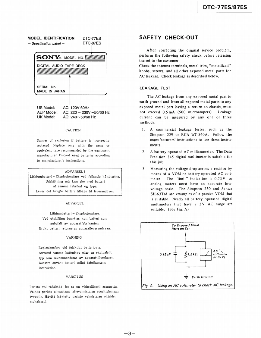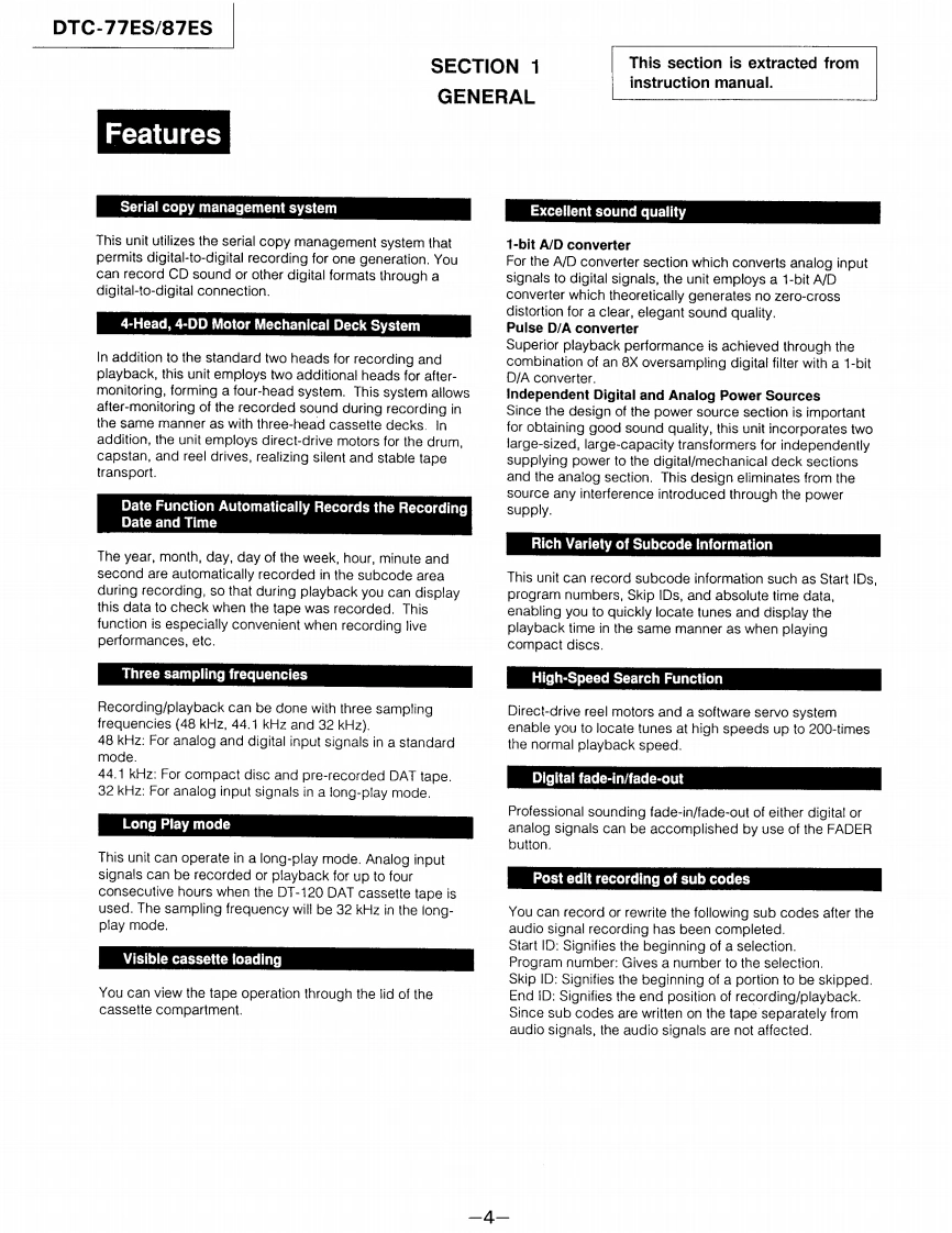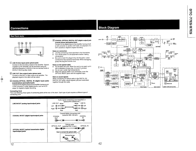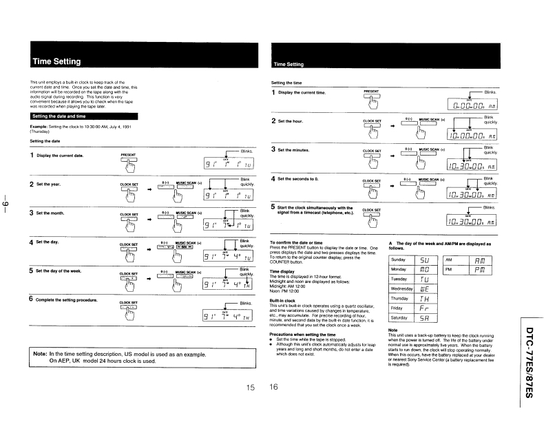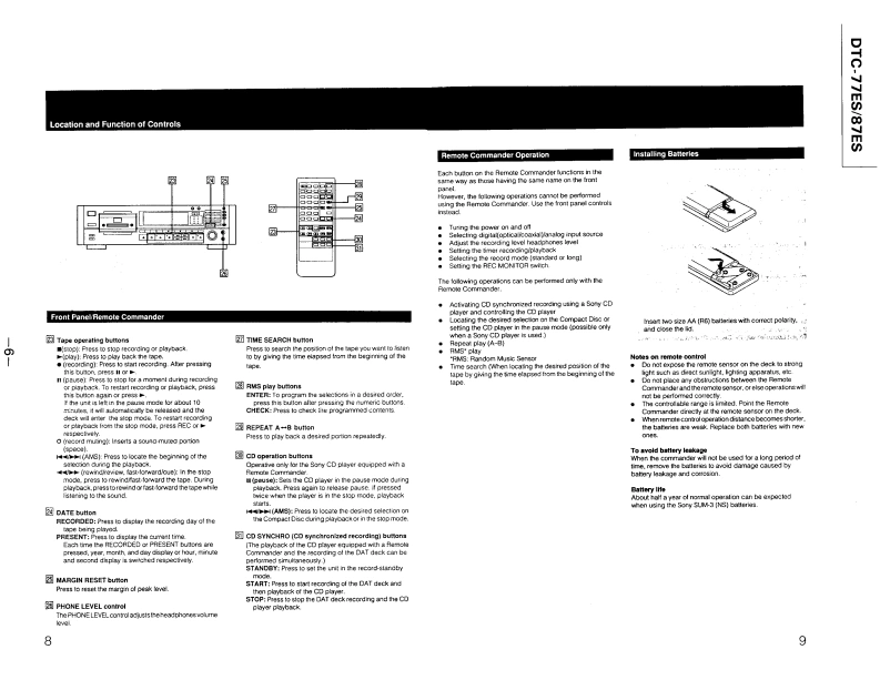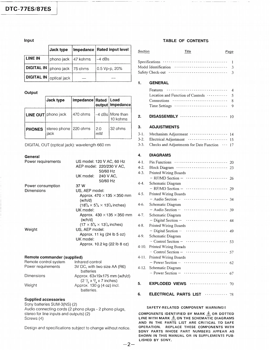 DTC-77ES/87ESSERVICE MANUALUS ModelDTC-87ESAEP ModelUK ModelDTC-77ESPhoto:DTC-87ES微电子时空基准带好音乐的休闲时光Model Name Using Similar Mechanism New Mechanismfzmcu.taobao.comTape Transport Mechanism TypeDATM-51SPECIFICATIONSTapeDigital audio tapeDTC-77ESDTC-87ESRecording headRotary headSignal to noiseSPRecording timeStandard:120 minutes.ratioLPmore than 93 dBmore than 94 dBmore than 93 dBLong-play mode:240 minutesDynamic rangemore than 93 dBmore than 94 dB(with DT-120)LPmore than 93 dBTape speedStandard:8.15 mm/s,Long play mode:4.075 mm/sTotal harmonicSPless than 0.0045%less than 0.004%distortion (1 kHz)LPDrum rotationStandard:2,000 rpm,less than 0.08%less than 0.08%Long-play mode:1,000 rpmSP:standard-play modeError correctionDouble Read Solomon codeLP:Long-play modeTapeWow and flutterBelow measurable limitTrack pitch13.6μm(20.4μm)(±0.001%W.PEAK)Sampllng frequency48 kHz,44.1 kHz,32 kHzModulation system8-10 ModulationTransfer rate2.46 Mbit/sec.Number of channel2 channels,stereoD/A conversion (Quantization)Standard:16-bit linearLong-play mode:12-bitnon-linearFrequency responseStandard:2-22,000 Hz (0.5dB)Long-play mode:2-14,500 Hz(±0.5dB)Continued on next page-DIGITAL AUDIO TAPE DECKMICROFILMSONY