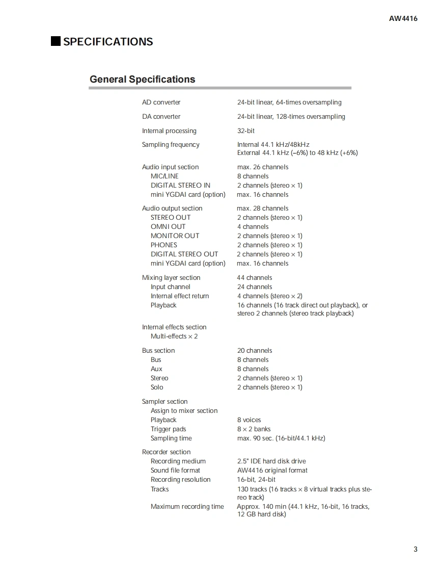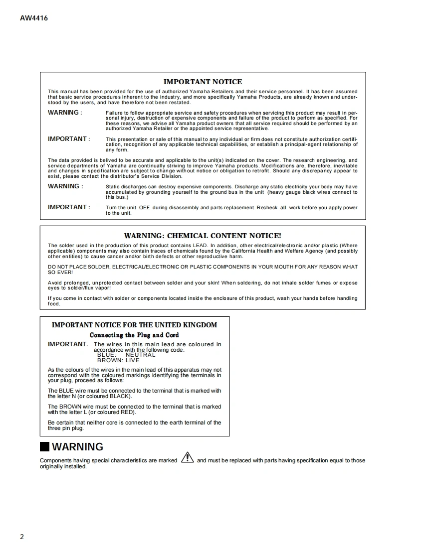PROFESSIONAL AUDIO WORKSTATION△W风WL4L415SERVICE MANUALi21012-64■CONTENTSSPECIFICATIONS.3/8PANEL LAYOUTDIMENTIONS23CIRCUIT BOARD LAYOUT2Hardware componentsDestinationBLOCK DIAGRAM26AW4416 onlyJapaneseDISASSEMBLY PROCEDURE31AW4416+HDDU.S.A.,Canadian,HARD DISK INSTALLATION35North European,CD-RW DRIVE INSTALLATIONBritish,37Asian PacificI/O CARD INSTALLATION41AW4416+HDD CD-RWNorth European,LSI PIN DESCRIPTION43BritishIC BLOCK DIAGRAM54CIRCUIT BOARDS58TEST PROGRAM70/89DISPLAY MESSAGE LIST108/112MIDI IMPLEMENTATION CHART...............................116色808.MIDI DATA FORMAT117PARTS LISTThis document is prnted on chlodine free (ECF)paper with soy ink.OVERALL CIRCUIT DIAGRAMYAMAHAPA011525HAMAMATSU,JAPAN20000825-OPEN PRICE1.44K-6332 K:Printed in Japan '00.09