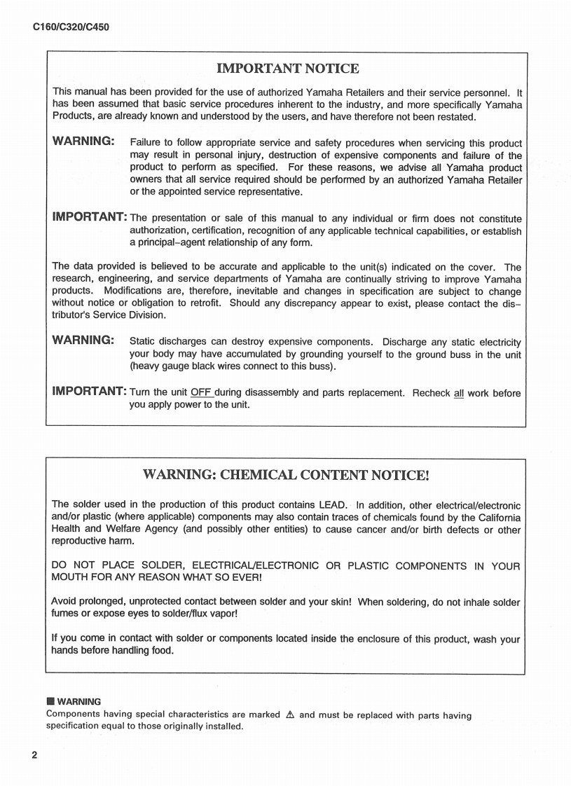 POWER AMPLIFIERC1≤e/C32e/C5eSERVICE MANUAL金YAMAHAw日88围4细■CONTENTSSPECIFICATIONS........................................8PANEL LAYOUT4DIMENSIONS5BLOCK DIAGRAM....CIRCUIT BOARD LAYOUT&WIRING...................6.DISASSEMBLY PROCEDURE..10IC BLOCK DIAGRAM................12POWER CONSUMPTION vs OUTPUT POWER GRAPH.......12CAUTION FOR SPEAKER CONNECTION ..12CIRCUIT BOARDS…INSPECTIONS..........13.16TROUBLESHOOTING18PARTS LISTOVERALL CIRCUIT DIAGRAMYAMAHAPA011394HAMAMATSU.JAPAN0.41K-4041(D Printed in Japan '98.2