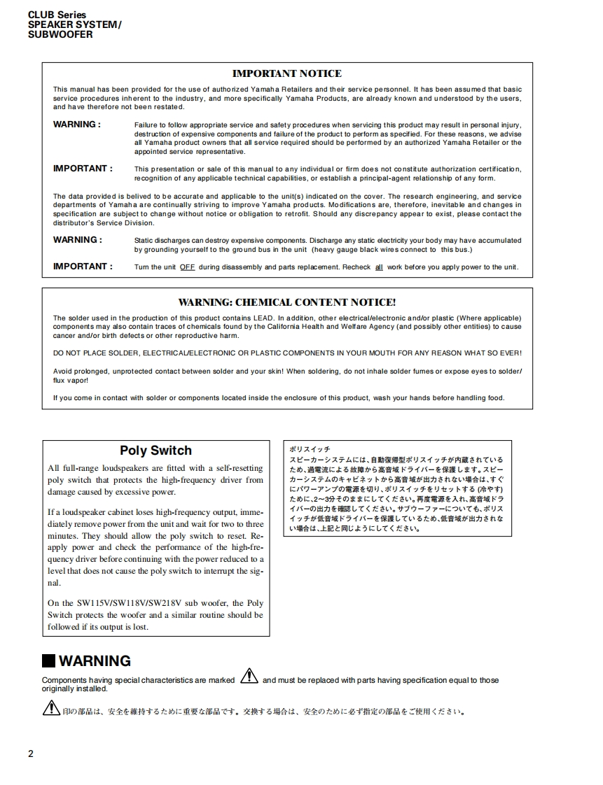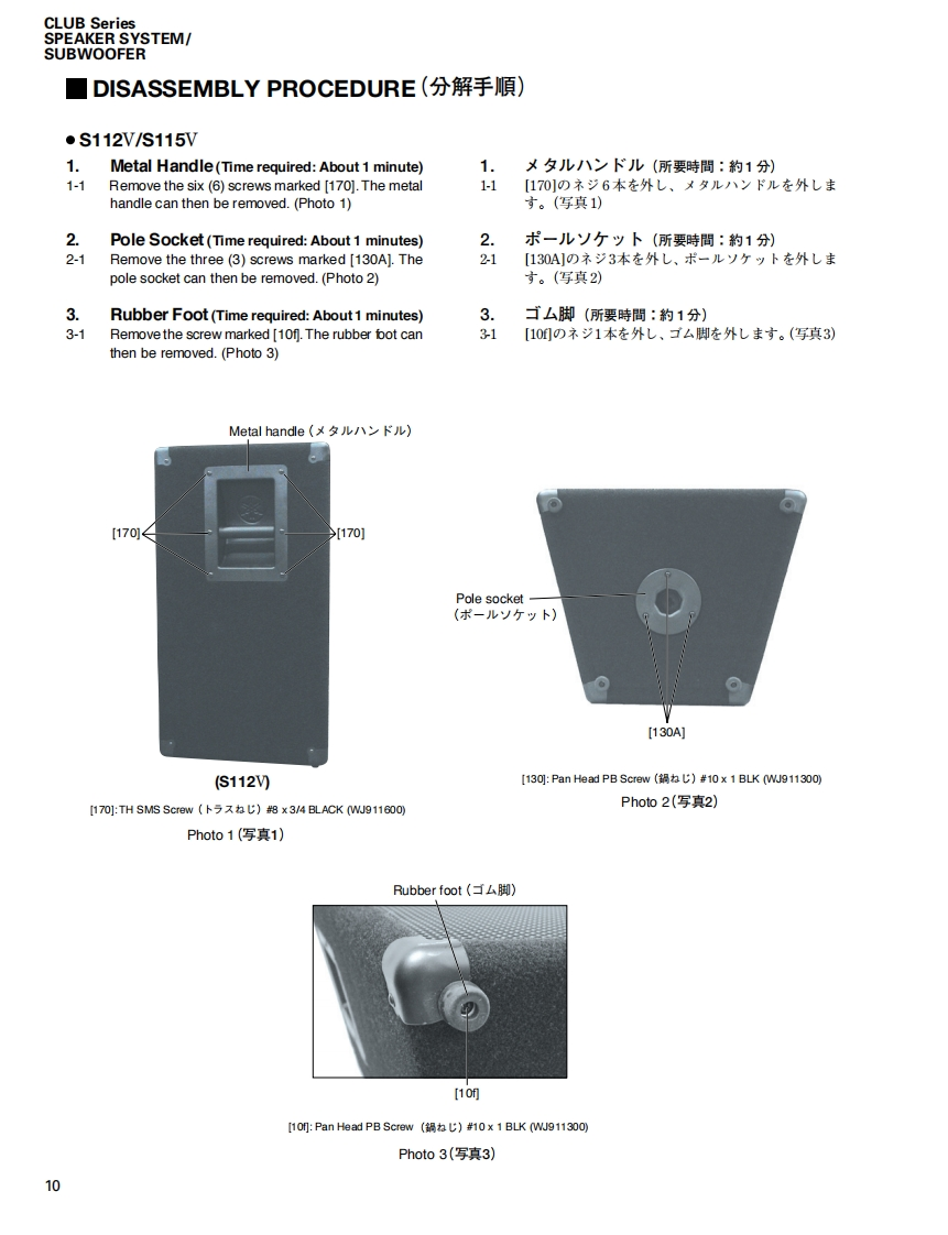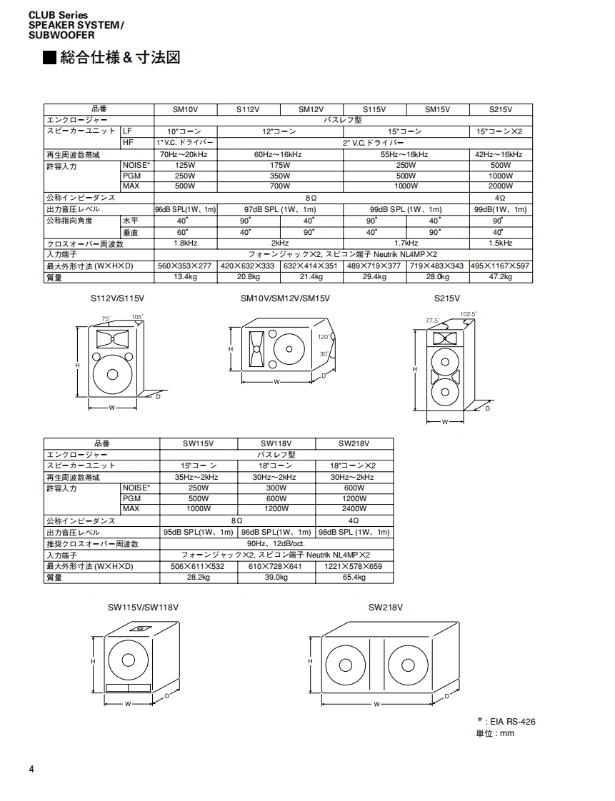 CLUB Series SPEAKER SYSTEM/SUBWOOFERSERVICE MANUAL型S112VS115VS215VSM10VSM12VSM15VSW115VSW118V■CONTENTS(目次)SPECIFICAT1ONS&DIMENSIONS(豁合仕樣&寸法☒)..3/4NETWORK(礻y卜7-)NIRE HARNESS(ワ亻ヤ-八-礻又).5DISASSEMBLY PROCEDURE(分解手順).10●S112V/S115V.....10●S215V..14SW218V●SM10V..17·SM12V/SM15V.2Use this manual for products with a serial number of 7 figures·SW115V/SW118V23(本了二ュ下儿t、制造番号护7桁②商品飞乙使用(龙ě(。)·SW218V.…6An example of a serial number(造番号例)NEUTRIK NL4FC PLUG WIRINGNK01069(又ピ口NEUTRIK NL4FCブラ5)配線)287 figures(7粉)PARTS LISTPA0118673W18N3878-86,99YAMAHASW218V:200706.136.500S112V:200706-68,250SM10V:200706-68,250HAMAMATSU,JAPANS115V:200706-78.750SM12V:200706-73500Copyright (c)Yamaha Corporation.All rights reserved.PDFH'07.07S215V:200706.157500SM15V:200706-84,000