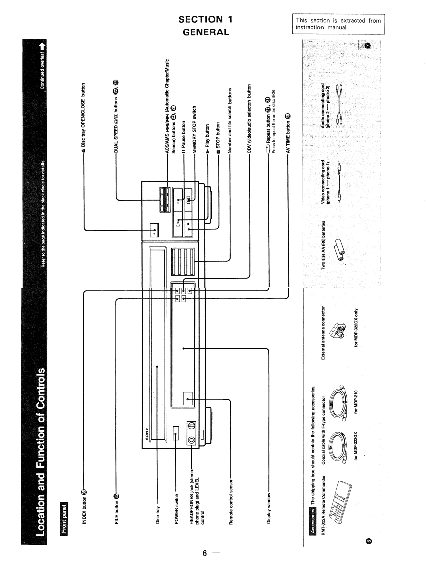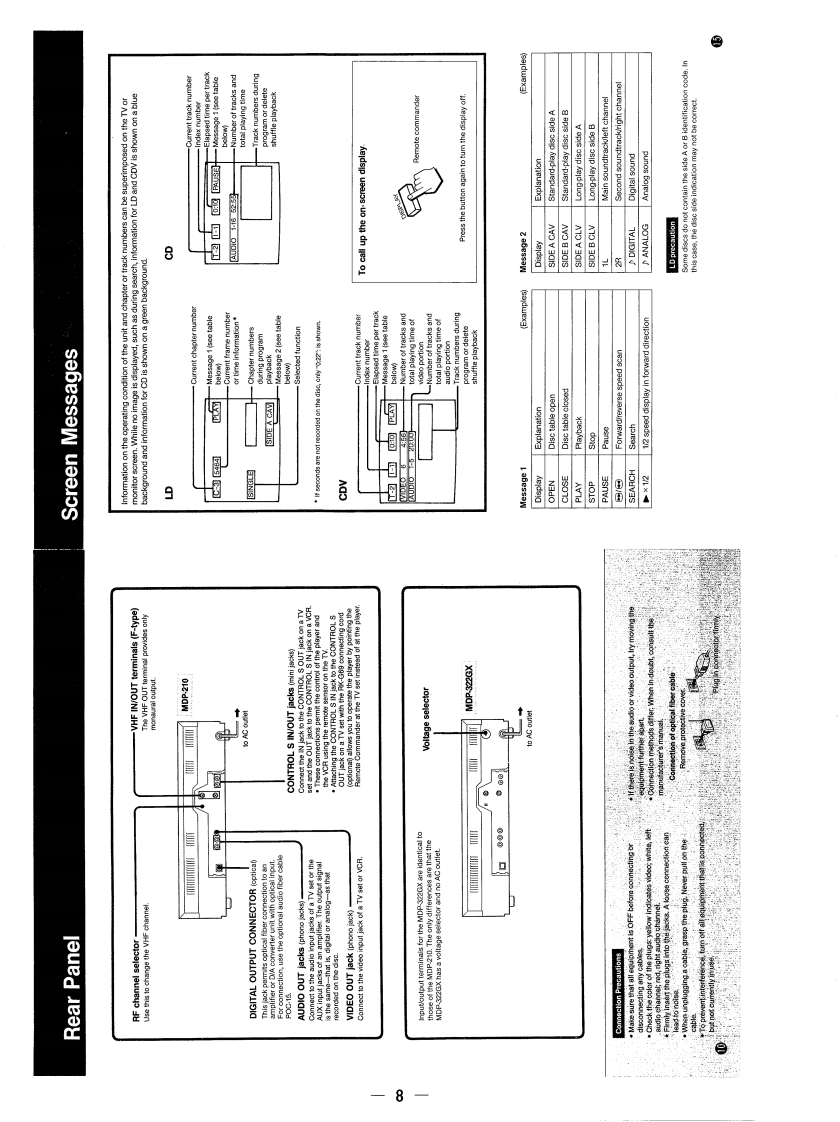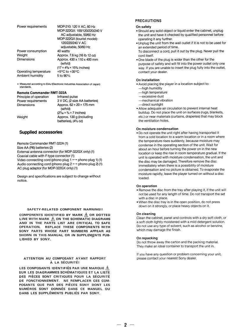 M0P-210/322GXSERVICE MANUALUS ModelCanadian Model:MDP-210E ModelMDP-322GXPhoto MDP-322GXSPECIFICATIONSTypeCD/CDV/LD PlayerChannel separationMore than 100 dB(EIAJ)Wow and flutterBelow measurement limitSignal readoutOptical (Laser beam reflection)Signal format(0.001%W.PEAK)(EIAJ)ElA standard,NTSC colorPlaying timeHorizontal video resolution 425 linesVideo output1.0 Vp-p,75 ohms,unbalanced30cm(12in)60Audio outputAnalog:200 mVrms (1 kHz,40%double-sidedmodulation)CAV20 cm (8 in)28Digital:200 mVrms(1 kHz,double-sided-20dB)20 cm (8 in)VHF input/output75 ohms,unbalanced LD output,single-sided14NTSC channel 3 or 4(switchable)LDHeadphone output28 mW (32 ohms),30cm(12in)120impedance =8 ohmsdouble-sidedContinued on page 2-CLV20 cm (8 in)40double-sided20 cm (8 in)20OSERVICE OF REMOTE COMMANDER RMT-322Asingle-sided12cm (5 in)single-sided74Remote commander RMT-322A is availableas a unit.But as individual parts the batteryCD8 cm (3in)case lid of commander is only available.single-sided20Audio portion20CDVVideo portion 5(minutes)Digital audio specificationsFrequency response4 Hz to 20 kHz (+0.5 dB,-1.0 dB)Signal-to-noise ratioMore than 107 dB (EIAJ)*Dynamic rangeMore than 96 dB (EIAJ)Total harmonic distortion0.003%or less (at 1 kHz,EIAJ)CD/CDV/LD PLAYERSONYe3的