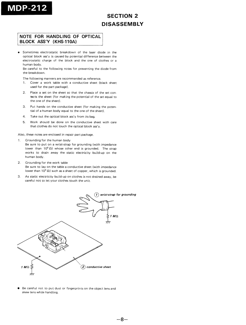MDP-212SERVICE MANUALAEP ModelAustralian ModelMDP■SPECIFICATIONSTypeCD video system playerPower requirementsSignal read-outOptical (laser beam reflection)For the United Kingdom:240 V AC,50/60 HzSignal formatCCIR standard,PAL color systemFor the other area:220 V AC,50/60 HzPlaying timePower consumptionLDCAV30 cm(12 inches)7240 wattsdouble-sidedWeight11 kg (24 Ib 4 oz)Dimensions20 cm(8 inches)32Approx.430×110×414mmwh/d)(17×4/e×16/a inchesdouble-sidedOperating temperatureCLV30 cm(12 inches)120+5°Cto35°Cdouble-sidedAmbient humidity 5 to 90%20 cm (8 inches)40double-sidedRemote Commander RMT-102Principle of operationCD12 cm (5 inches)74Infrared pulsesingle-sidedPower requirements8 cm (3 inches)203 V DC(2 size AA batteries)single-sidedDimensionsApprox..67×21×175mm(wlh/d(2×2/a×7 inches)CDVAudio portion20WeightApprox.155 g (including batteries),(6 oz)Video portion6(minutes)Design and specifications subject to change without noticeFrequency responseHzto20kHz(±0.3dB)Signal-to-noise ratioMore than 100 dBDynamic rangeMore than 96 dBTotal harmonic distortion0.003%or lessWow and flutterBelow measurement limit (+0.001 W.PEAK)Video output1.0 Vp-p,75 ohms,unbalancedAudio output (x2)Analog:200 mVrms(1 kHz,40%modulation)Digital:200mVrms (1 kHz,-20 dB)AERIAL (VHF)input/outputA symmetrical aerial socket,75 ohmsunbalancedHeadphone output28 mW (32 ohms),impedance 8 ohmsCD/CDV/LD PLAYERSONY