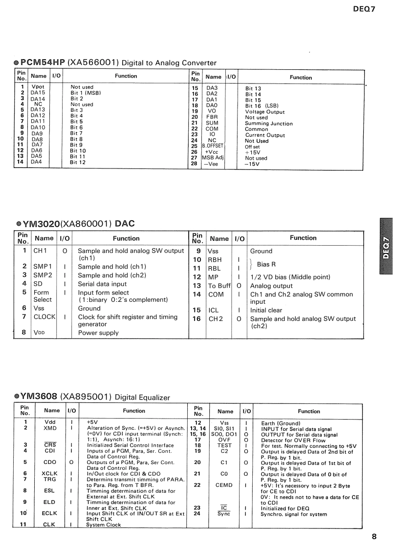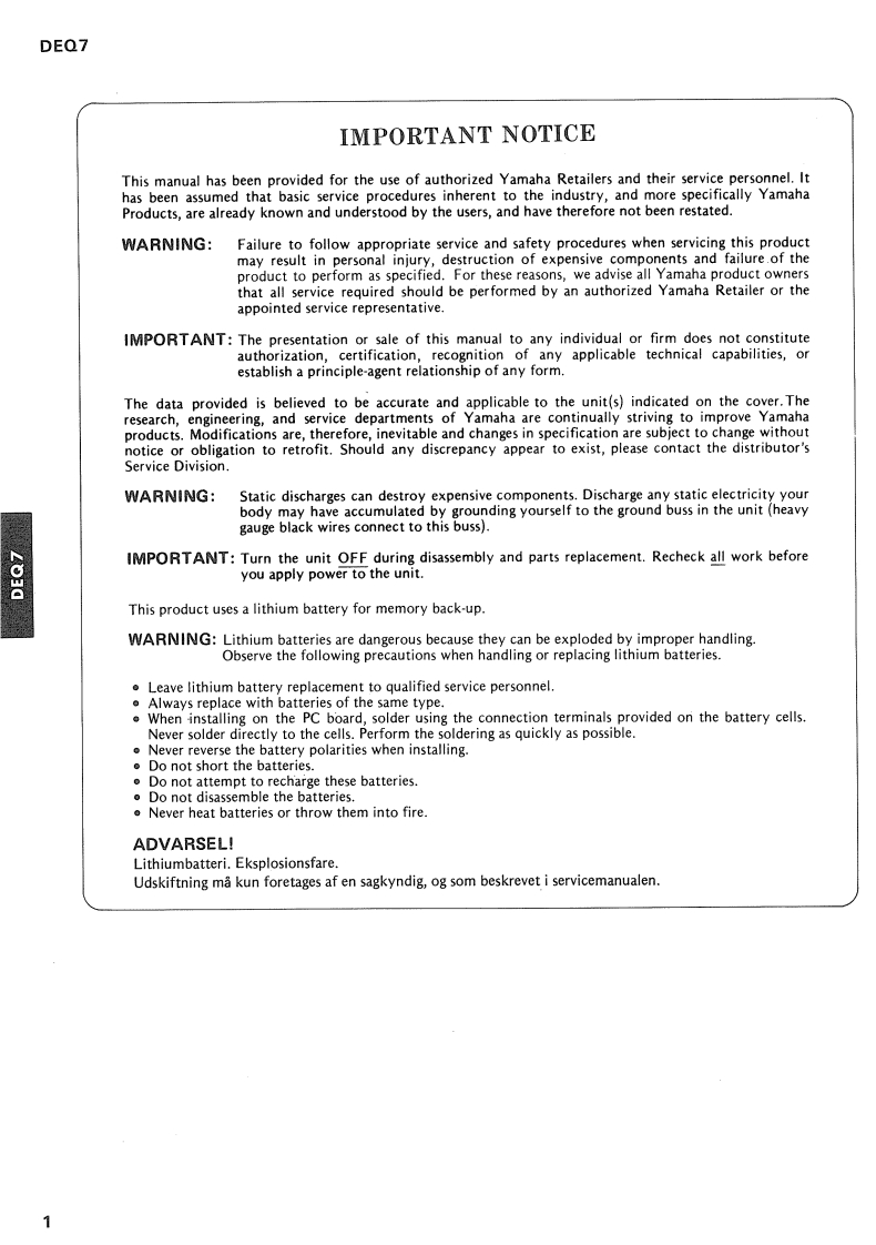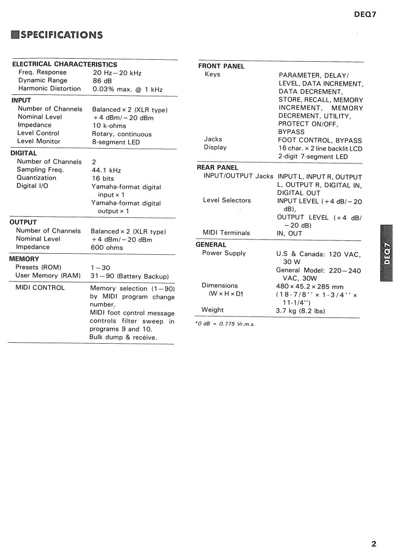 Digital EqualizerSERVICE MANUALO国CONTENTSSPECIFICATIONS...2PANEL LAYOUT…3DIMENSIONS3BLOCK DIAGRAM................4CIRCUIT BOARD LAYOUT WIRING5LSI DATA TABLE6IC BLOCK DIAGRAM…10CIRCUIT BOARDS…13MIDI DATA FORMAT…18MIDI IMPLEMENTATION CHART...........22TEST PROGRAM…23CHECKS…25ADJUSTMENTS……27DISASSEMBLY PROCEDURES29PARTS LISTYAMAHA CORP006775HAMAMATSU.JAPAN2.05K-492K Printed in Japan'87-11