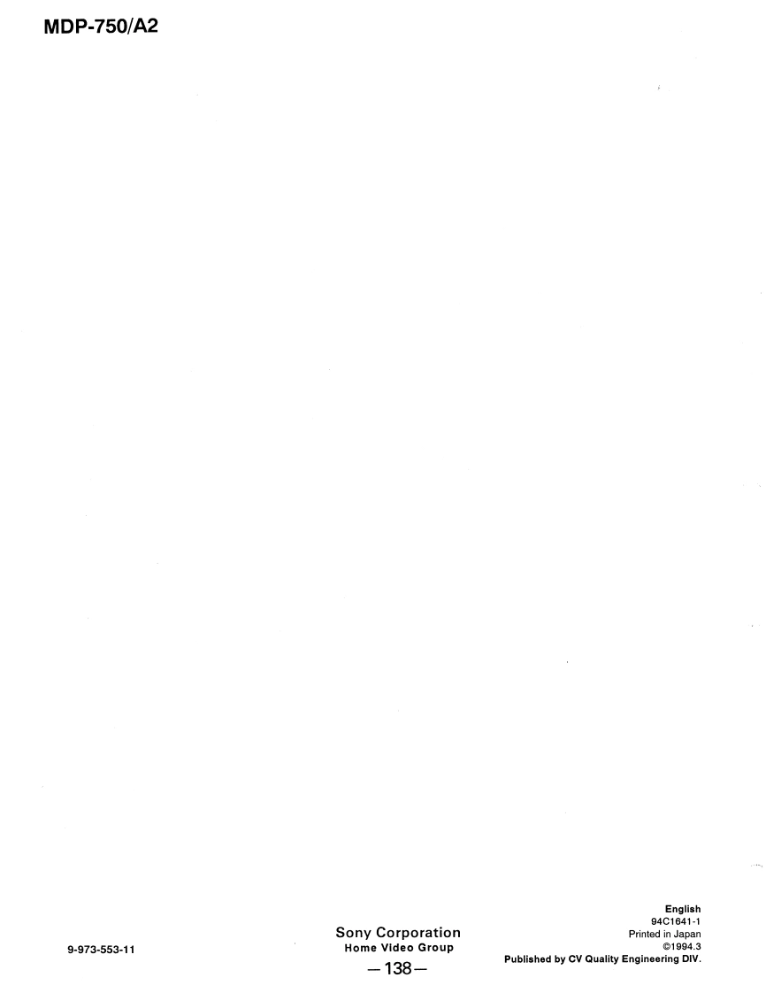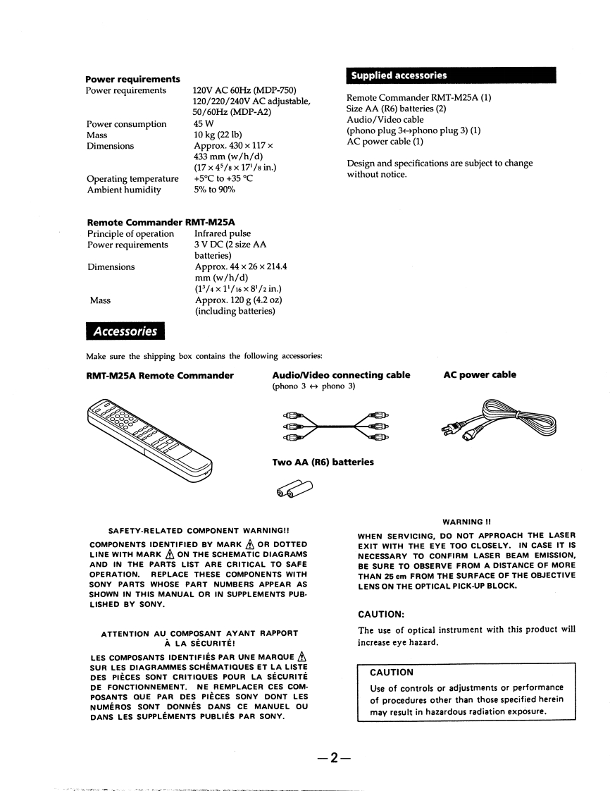MDP-750/A2BMT-M25ASERVICE MANUALUS ModelCanadian ModelMDP-750E ModelMDP-A2Photo:MDP-750SPECIFICATIONSTypeCD/CDV/LD PlayerVideo specificationsSignal readoutOptical (Laser beam reflection)Horizontal video425 linesSignal format systemEIA standard,NTSC color systemresolutionPlaying time(minutes)Signal-to-noise ratioMore than 50 dB30cm(12in)double-sided60Input/output specificationsVideo output 1,21.0 Vp-p,75 ohms,unbalanced20 cm (8 in)Audio output 1,2Stereo L,RCAVdouble-sided的Analog:200 mVrms20 cm (8 in)(1 kHz,40%modulation)single-sided14Digital:200 mVrmsLD(1 kHz,-20 dB)30cm(12in)120S video output 1,2Luminance:1 Vp-p,75 ohms,double-sidedunbalanced,sync negative20 cm (8 in)Chrominance:0.286 Vp-p,CLVdouble-sided4075 ohms,unbalanced20 cm (8 in)Audio digital output-18 dBm,wavelength 660 nmsingle-sided20(optical)12 cm (5in)Headphone output12 mW(8 ohms)single-sided74Impedance =8 ohmsCDCONTROL S INMini jack8 cm (3 in)20Mic jackStandard jacksingle-sided1mV (Impedance below 1 kilohm)Audio portion20CDVMeasured according to EIAl (Electronic IndustriesVideo portion5Association of Japan)standards.VSDVideo portionDigital audio specificationsFrequency response4Hzto20kHz(±0.3dB)Continued on next pageSignal-to-noise ratioMore than 115 dB(EIAJ)*Dynamic rangeMore than 99 dB (EIAJ)Wow and flutterBelow measurement limitCD/CDV/LD PLAYER(0.001%W.PEAK)(EIAJ)SONYMICROFILM