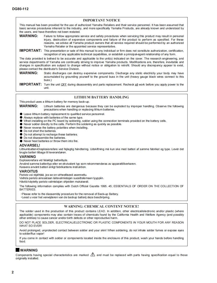 GUITAR AMPLIFIERD68o-m2SERVICE MANUAL18日站世滋地单堂曾她变日⊕YAMAHA■CONTENTSSPECIFICATIONS…3…PANEL LAYOUT…4…CIRCUIT BOARD LAYOUT…5…BLOCK DIAGRAM....…6…DISASSEMBLY PROCEDURE…6…LSI PIN DESCRIPTION…9…IC BLOCK DIAGRAM…个2…CIRCUIT BOARDS…14TEST PROGRAM8ERROR MESSAGES…21MIDI IMPLEMENTATION CHART......................................22…PARTS LISTGA011459YAMAHA19990301-148000HAMAMATSU.JAPAN2.02K-186 Printed in Japan 99.02
