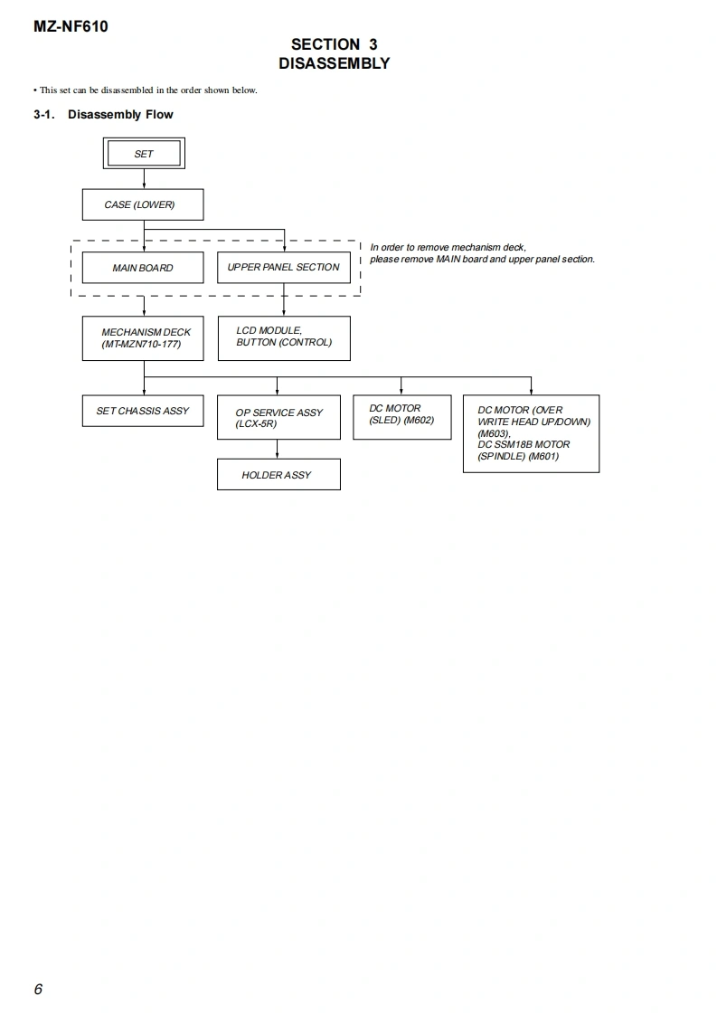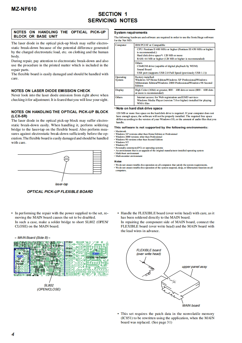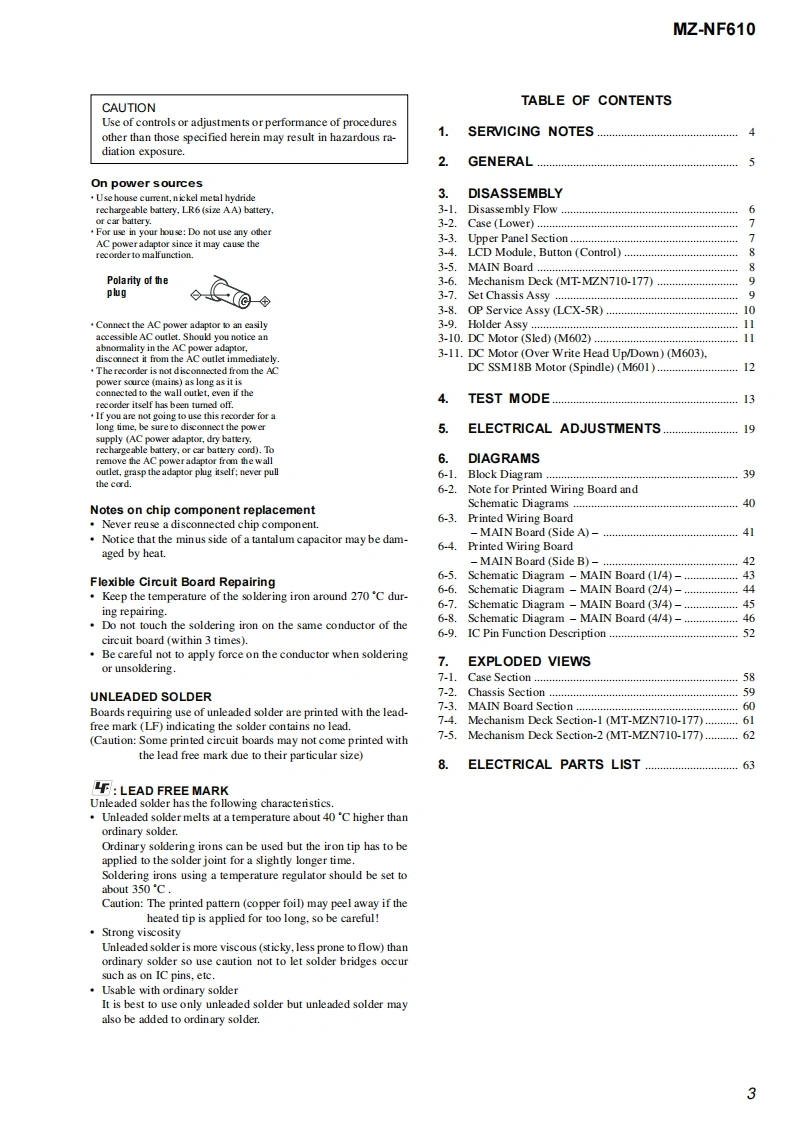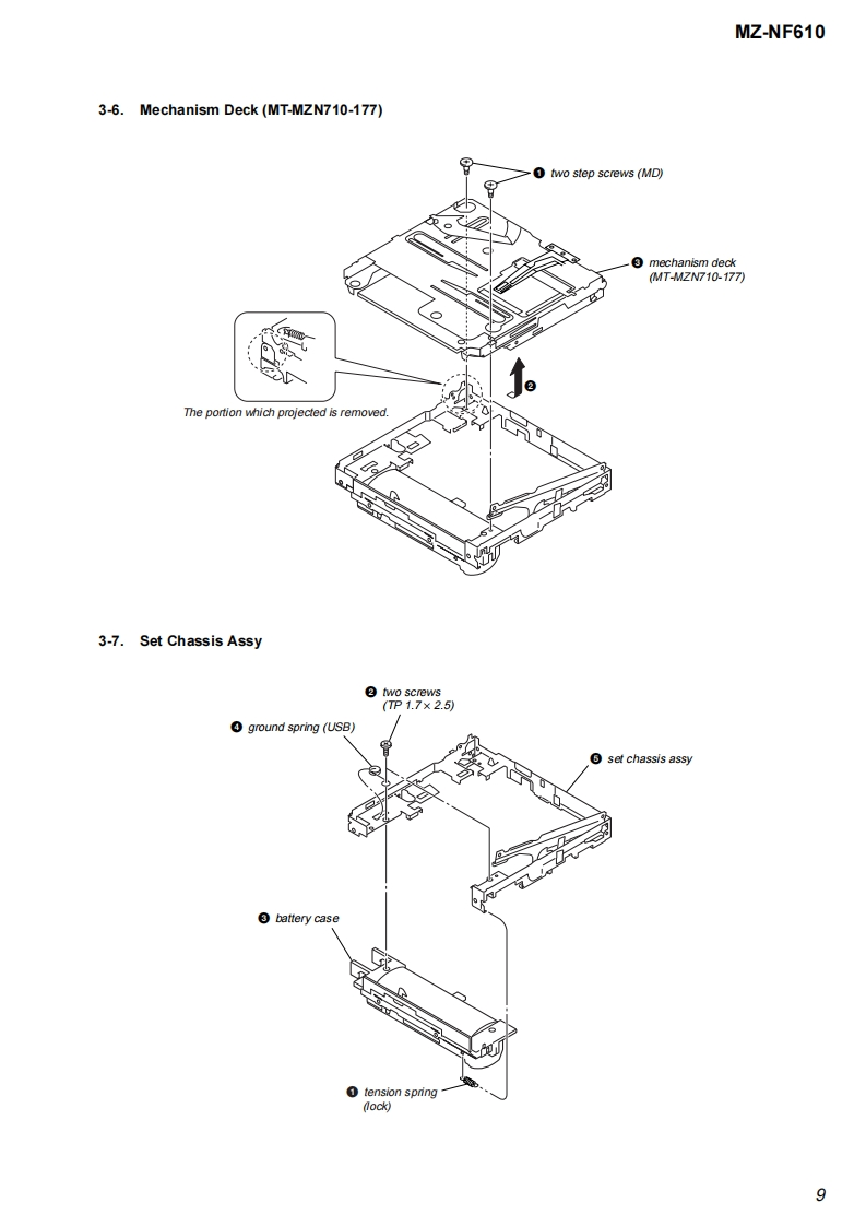 微电子时空基准带好音乐的休闲时光fzmcu.taobao.comMZ-NF610SERVICE MANUALUS ModelCanadian ModelVer1.02003.03SONYUS and foreign patents licensed from DolbyModel Name Using Similar MechanismMZ-R410Laboratories.Mechanism TypeMT-MZN710-177Optical Pick-up NameLCX-5RSonicStage,OpenMG and the OpenMGlogo.MagicGate.Net MD and the NetMD logo are trademarks of SonyCorporation.Microsoft.Windows.Windows NT andSPECIFICATIONSWindows Media are trademarks orMD recorderregistered trademarks of MicrosoftCorporation in the United States and /orAudio playing systemother countries.MiniDise digital audio systemLaser diode propertiesIBM and PC/AT are registeredMaterial:GaAlAstrademarks of International BusinessWavelength:=790 nmMachines Corporation.Emission duration'continuousMacintosh is a trademark of AppleLaser output:less than 44.6uWComputer,Inc.in the United States and/(This output is the value measured at a distanceof 200 mm from the lens surface on the opticalor other countries.pick-up block with7mmeture)MMX and Pentium are trademarks orRecording and playback time (whenregistered trademarks of Intelusing MDW-80)Corporation.Maximum 160 min in monauralAll other trademarks and registeredMaximum 320 min.in LP4 stereotrademarks are trademarks or registeredRevolutionstrademarks of their respective holders.380 rpm to 2.700 rpm (CLV)Error correctionTM and marks are omitted in thisACIRC (Advanced Cross Inerleave Reedmanual.Solomon CodelSampling frequency44.1 kHzSampling rate converterInput:32 kHz/44.1 kHz/48 k HzCodingATRAC (Adaptive TRansform AcousticCoding)ATRAC3-LP2/LP4Continued on next page-PORTABLE MINIDISC RECORDER9-877-144-01Sony Corporation2003C167800-1Personal Audio Company©2003.03Published by Sony Engineering CorporationSONY