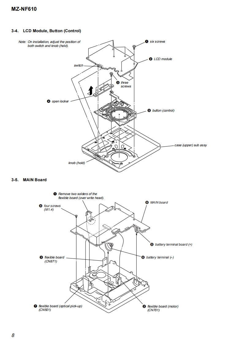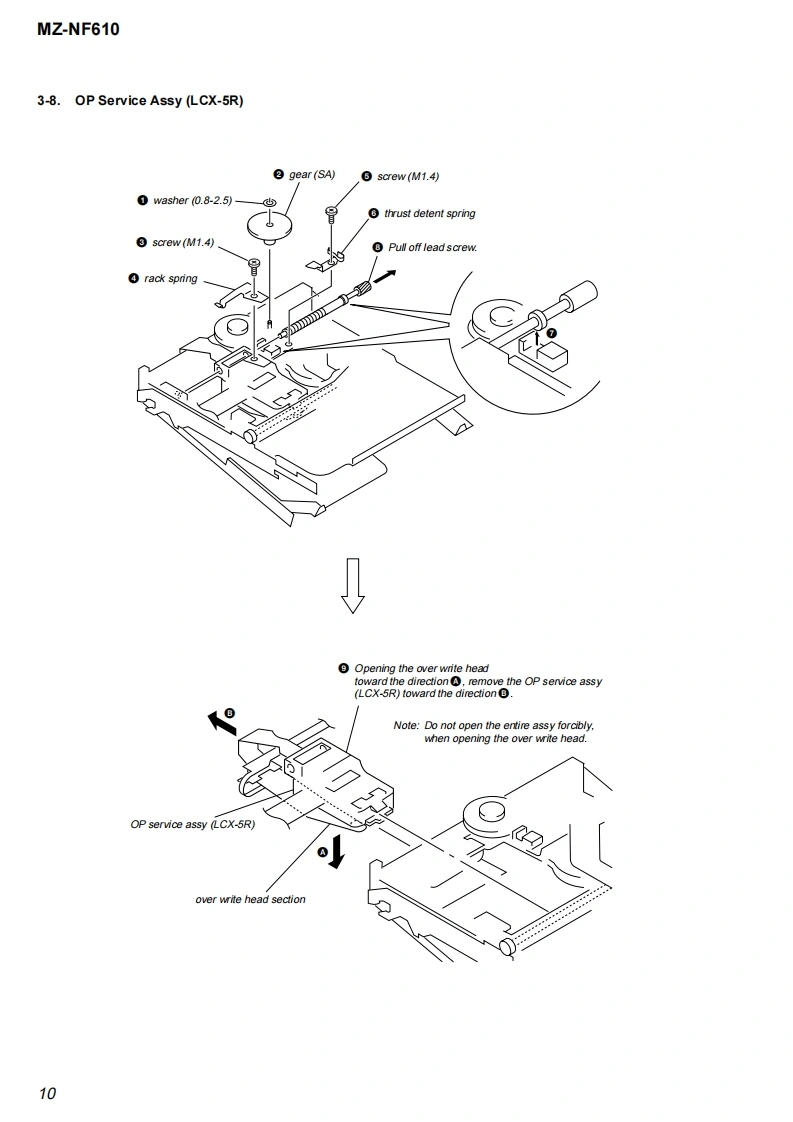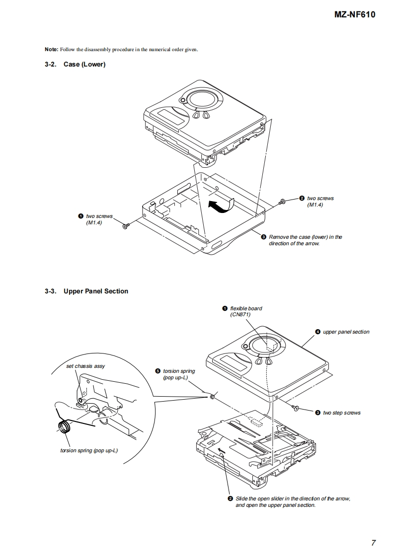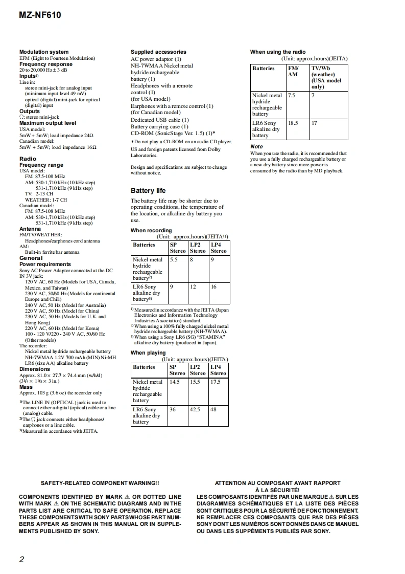 微电子时空基准带好音乐的休闲时光fzmcu.taobao.comMZ-NF610SERVICE MANUALUS ModelCanadian ModelVer1.02003.03SONYUS and foreign patents licensed from DolbyModel Name Using Similar MechanismMZ-R410Laboratories.Mechanism TypeMT-MZN710-177Optical Pick-up NameLCX-5RSonicStage,OpenMG and the OpenMGlogo.MagicGate.Net MD and the NetMD logo are trademarks of SonyCorporation.Microsoft.Windows.Windows NT andSPECIFICATIONSWindows Media are trademarks orMD recorderregistered trademarks of MicrosoftCorporation in the United States and /orAudio playing systemother countries.MiniDise digital audio systemLaser diode propertiesIBM and PC/AT are registeredMaterial:GaAlAstrademarks of International BusinessWavelength:=790 nmMachines Corporation.Emission duration'continuousMacintosh is a trademark of AppleLaser output:less than 44.6uWComputer,Inc.in the United States and/(This output is the value measured at a distanceof 200 mm from the lens surface on the opticalor other countries.pick-up block with7mmeture)MMX and Pentium are trademarks orRecording and playback time (whenregistered trademarks of Intelusing MDW-80)Corporation.Maximum 160 min in monauralAll other trademarks and registeredMaximum 320 min.in LP4 stereotrademarks are trademarks or registeredRevolutionstrademarks of their respective holders.380 rpm to 2.700 rpm (CLV)Error correctionTM and marks are omitted in thisACIRC (Advanced Cross Inerleave Reedmanual.Solomon CodelSampling frequency44.1 kHzSampling rate converterInput:32 kHz/44.1 kHz/48 k HzCodingATRAC (Adaptive TRansform AcousticCoding)ATRAC3-LP2/LP4Continued on next page-PORTABLE MINIDISC RECORDER9-877-144-01Sony Corporation2003C167800-1Personal Audio Company©2003.03Published by Sony Engineering CorporationSONY