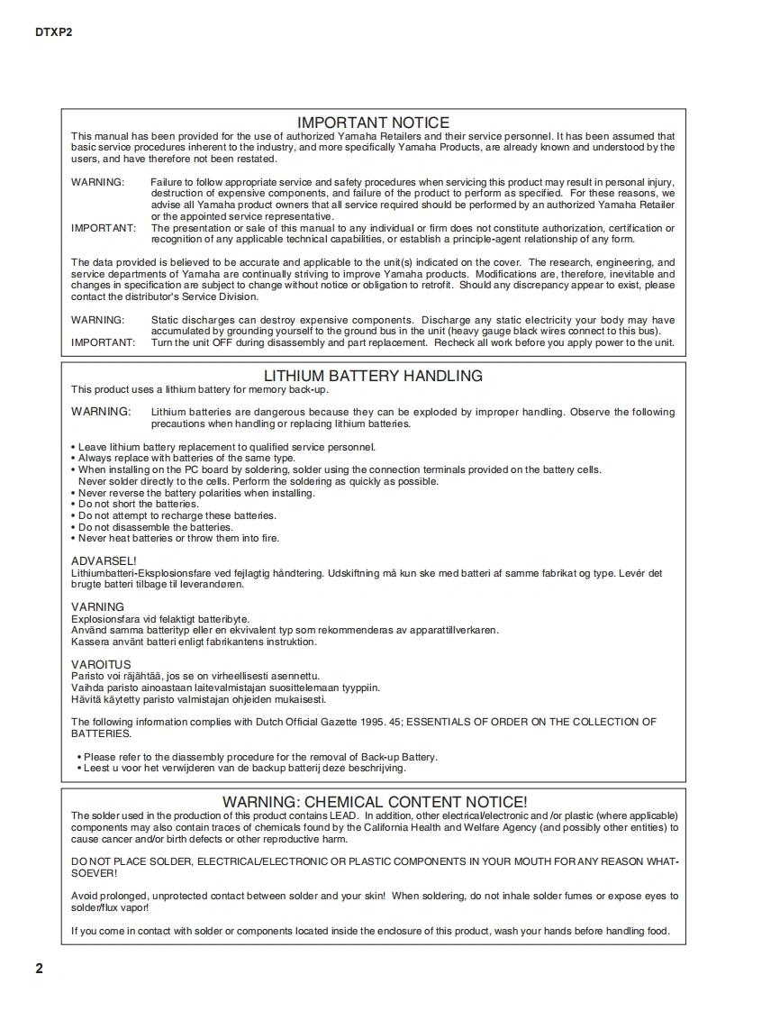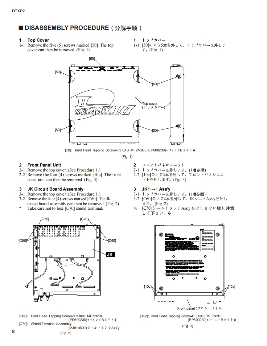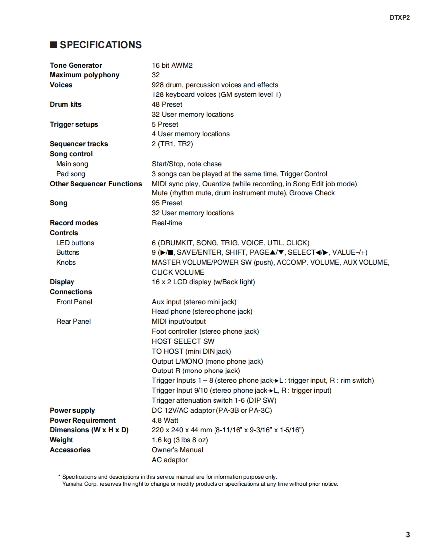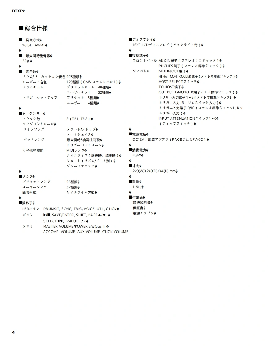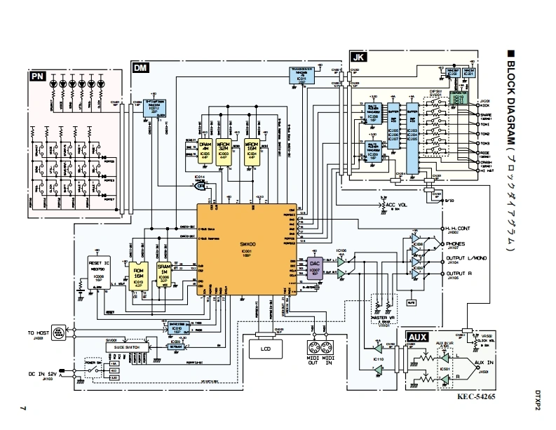DTXPRESS TDRUM TRIGGERMODULEDTXP2SERVICE MANUAL●MHDTXPRES■CONTENTS(目次)SPECIFICATION(纶合仕樣)34PANEL LAYOUT(R礻儿L亻77卜5UNIT LAYOUT(1三y卜亻7ヴ卜)BLOCK DIAGRAM(寸口y夕ダ亻7艺ラk).7DISASSEMBLY PROCEDURE(分解手顺).8LSI PIN DESCRIPTION(LSI端子機能表).….11IC BLOCK DIAGRAM(IC寸口y夕☒).12CIRCUIT BOARDS(之一卜基板囡).14TEST PROGRAM(テㄡ卜ブ口ヴラk).21/30ERROR MESSAGES(工7-Xy七-岁)..39/40MIDI IMPLEMENTATION CHART(MID川亻之ブXy于-之ョ之于中-卜).41PARTS LISTOVERALL CIRCUIT DIAGRAM(▣路)主3【ECF:地素系得白心私寸》老使用LT主亨+·This document is using chlorine free (ECF)paper.YAMAHAED011647HAMAMATSU.JAPAN20020720-480001.373K-456M Printed in Japan'02.07