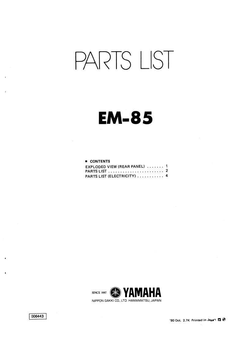 日园SERVICEMANUALFront Panel④YAMAHA⑧写0000000O0000ORear Panel车YAMAHAO③易LS Model暖CONTENTSSPECIFICATIONSBLOCK DIAGRAM5INPUT/OUTPUT SPECIFICATIONS。,。。。1SCHEMATIC DIAGRAM...,,·,·:-·.,6GENERAL ADJUSTMENT ANDPRINTED CIRCUIT BOARDS.,,··,,···CHECK SPECIFICATIONSWIRINGPARTS LISTSINCE 1887006443YAMAHANIPPON GAKKI CO.,LTD.HAMAMATSU.JAPAN'80 Oct.2.7K Printed inJeapan