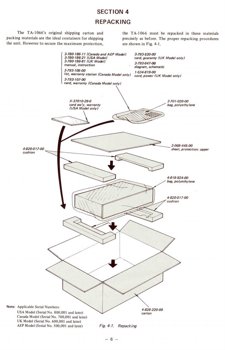 TA-1066USA,Canada.AEPand UK ModelINTEGRATED STEREOAMPLIFIERSPECIFICATIONSPOWER AMPLIFIER SECTIONInput sensitivityand impedance:PHONO2.5 mV,50 k ohmsContinuous RMSTUNERpower output:At 1 kHzAUX(rated output)20 watts (8 ohms).TAPE-1,TAPE-2250 mV,50 k ohms(less than 0.8 THD)26 watts (4 ohms)REC/PB (input)one channel drivenseparately18 watts (8 ohms)per channel.Signal output and22 watts(4 ohms)per channeloutput impedance:REC OUT250 mV,10 k ohmsboth channels driven simultaneouslyREC/PB (output)30 mV,82 k ohmsDynamic power output:50 watts (8 ohms)GENERAL(IHF constant power75 watts(4ohms】supply method)Power requirements:120 volts ac (USA and Canada Model)110,127,220.240 volts acPower bandwidth:10 Hz to 40 kHz (8 ohms,IHF)(AEP and UK Model)Harmonic distortion:Less than 0.8 at rated outputPower consumption:55 watts (USA Model)80 watts (Canada Model)IM distortion:Less than 0.8 at rated output140 watts (AEP and UK Model)(60Hz:7kHz=4:1)Dimensions:410(w)×120h)×280(d)mmPREAMPLIFIER SECTION16/8wl×46(h)×11h6(d)inchesFrequency response:PHONORIAA equalizationNet weight:6.0 kg (13 Ib 4 oz)curve±1dBTUNERAUX20 Hz to 60 kHzTAPE-1,TAPE-2±3dBREC/PB(input)SONYSERVICE MANUAL