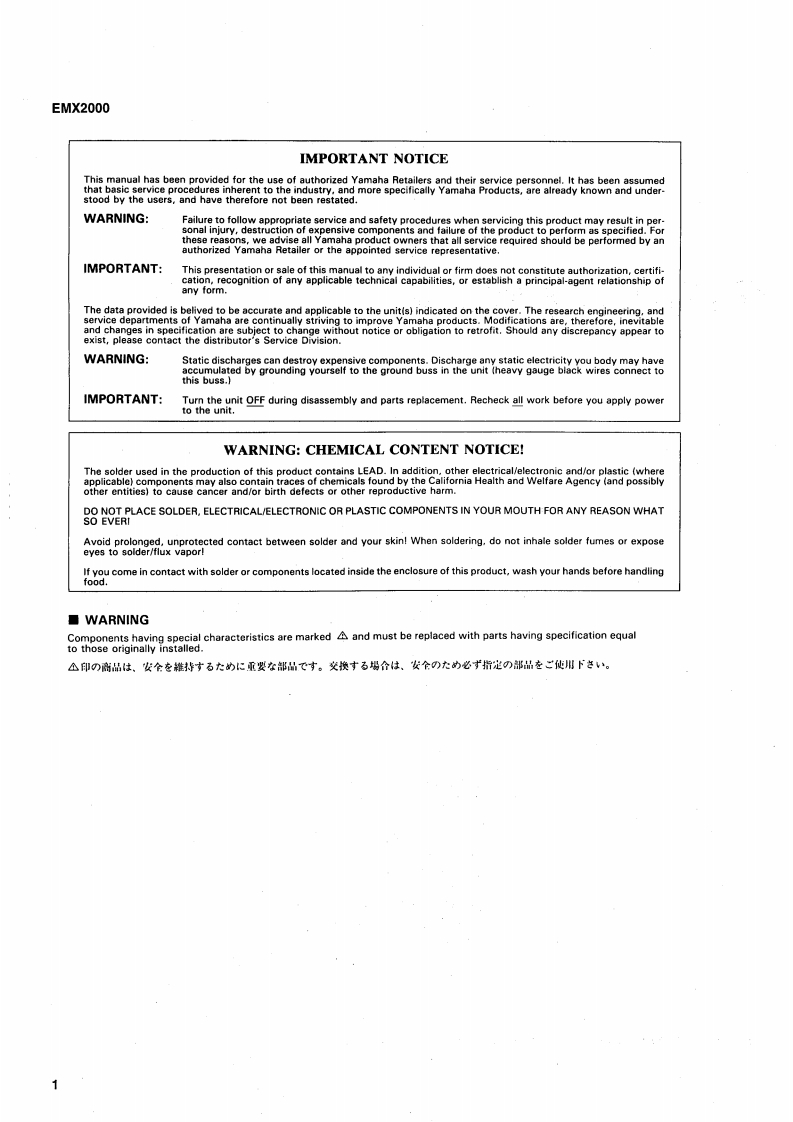 POWERED MIXERE火套套美SERVICE MANUAL0000:月0g行00Fǒ008888r[[88888a8■CONTENTS(目次)SPECIFICATIONS(然合仕樣)2PANEL LAYOUT(パ礻儿了ヴ卜)…CIRCUIT BOARD LAYOUT(1=y卜V才了ヴ卜)..9DIMENSIONS(寸法☒)……9BLOCK DIAGRAM LEVEL DIAGRAM(ブ口y夕&少心儿岁大了少ラ么)10DISASSEMBLY PROCEDURE(分解手順)11IC BLOCK DIAGRAM(ICブ口y夕☒)13CIRCUIT BOARDS(一卜基板☒)14INSPECTIONS(検查)…20PARTS LISTYAMAHA CORP.PA0t1386HAMAMATSU.JAPAN19971220-1280001.95K-998(DPrinted in Japan '97.12