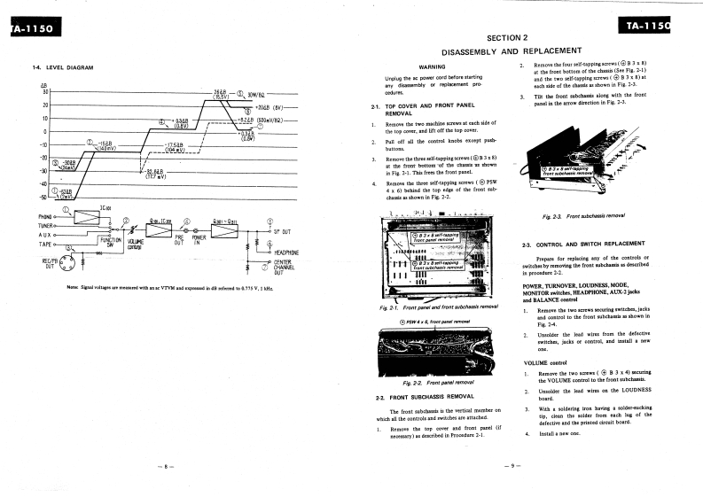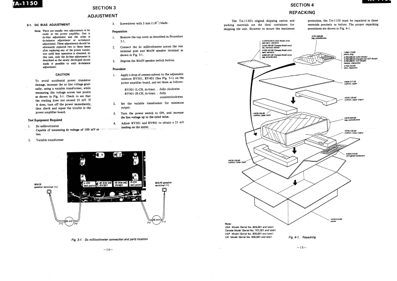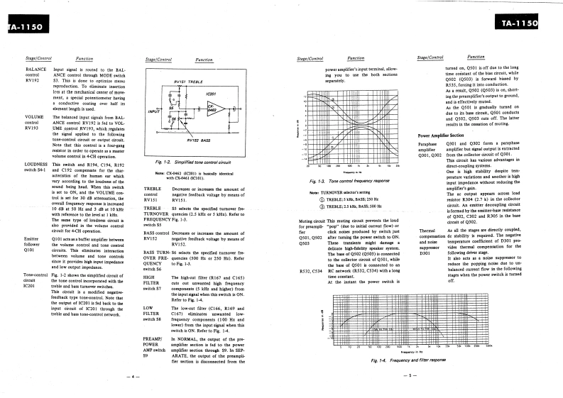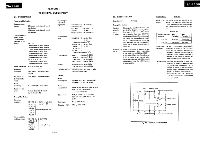 TA-1150USA Model(Serial No.804,001 and laterCanada Model(Serial No.701,001 and later)AEP ModelSONYUK ModelINTEGRATED STEREO AMPLIFIERSPECIFICATIONSPOWER AMPLIFIER SECTIONInput sensitivityand impedance:PH0N0-1,-22mV47 kDynamic power output:100 watts,both channels operating:8 ohmsTAPE -1,TAPE -2150 watts,both channels operating;4 ohmsTUNERAUX-1.-2140mV50kContinuous RMS powerREC/PB (input)output (less than 0.2 THD):At 1 kHz[Rated Output]40 watts per channel,8 ohmsSignal output and55 watts per channel,4 ohmsoutput impedance:REC OUT-1,-2140mV10k(One channel driven separately)PRE OUT800mV2.7k35 watts per channel,both channelsREC/PB24 mV 82 k46Peatge28。ahmialL.bothchanetsCENTER OUT800mV6802operating,4 ohmsGENERALAt 20 Hz ~20 kHz30 watts per channel,both channelsPower consumption:operating,8 ohms180 watts (USA and Canada Model)250 watts (AEP and UK Model)Power bandwidth:8 Hz to 35 kHz,IHFPower requirement:858sao0d8apsgvolts ac (AEP andHarmonic distortion:Less than 0.2%at 1 kHz rated outputUK Model)IM distortion:Less than 0.2%at rated output(60Hz:7kHz=4:1)Dimensions:400【w)×149(h×316(dmm15%(w)x 51916 (h)x 12716 (d)inchesPREAMPLIFIER SECTIONNet weight:8.3 kg (18 lb 5 oz)Frequency response:PHON0-1,-2RIAA equalizationShipping weight:11.5 kg (25 lb 6 oz]curve±1dBTAPE-1,TAPE-2TUNERAUX-1.-215Hzto80kHz±2dBREC/PB (input)SONYSERVICE MANUAL