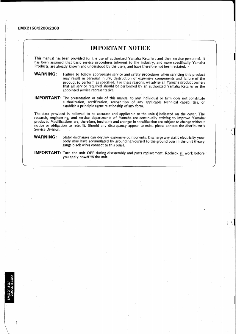 POWERED MIXER多SERVICE MANUALEMX2200■CONTENTS(目次)SPECIFICATIONS(然合仕模)…2/3BLOCK&LEVEL DIAGRAM(ブ口y夕&ベ儿ダ1了ダラㄙ)4PANEL LAYOUT(心礻儿LT7卜)…6CIRCUIT BOARD LAYOUT(ユ二y卜T7)……9W川RNG(配線☒)…10DISASSEMBLY PROCEDURE(分解手顺).12DIMENSIONS(寸法☒)…17LS|DATA TABLE(LSI端子機能表)…18IC BLOCK DIAGRAM(ICブ口y夕☒)…21CIRCUIT BOARDS(之一卜基板☒)…22PARTS LISTYAMAHA CORP.LMO06909HAMAMATSU.JAPAN2.9K-335 Printed in Japan '88.12