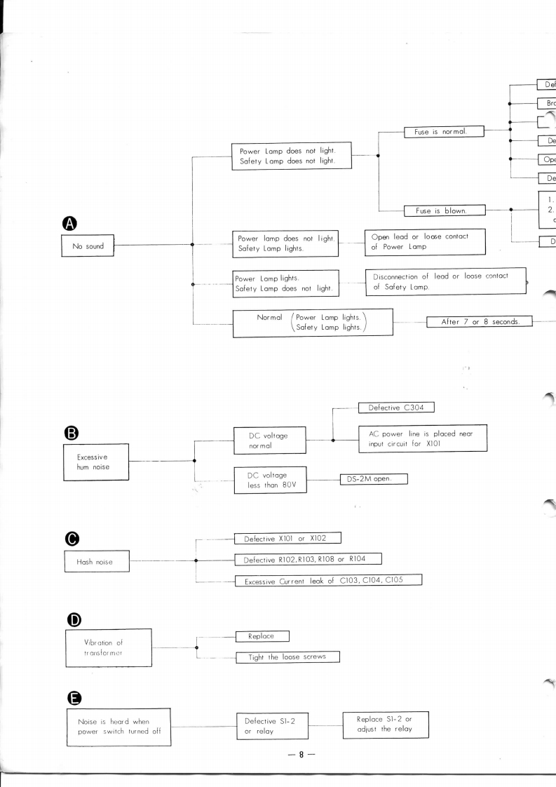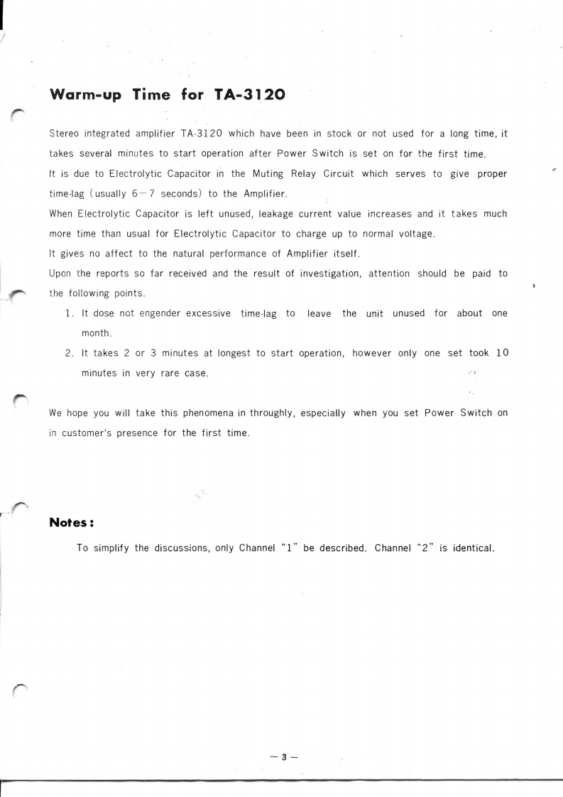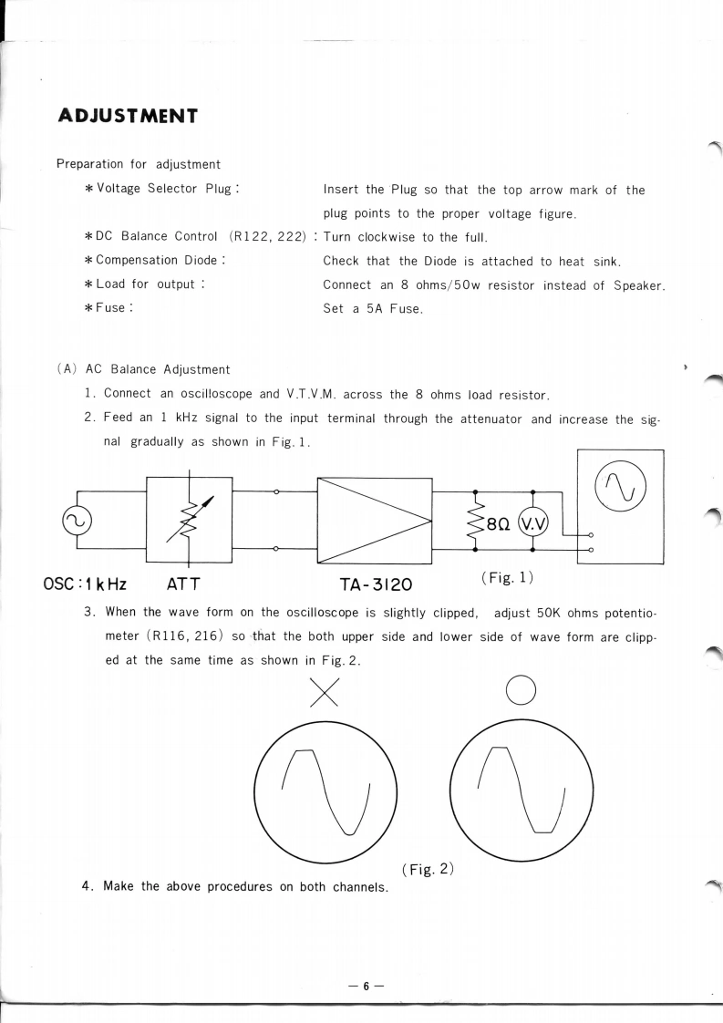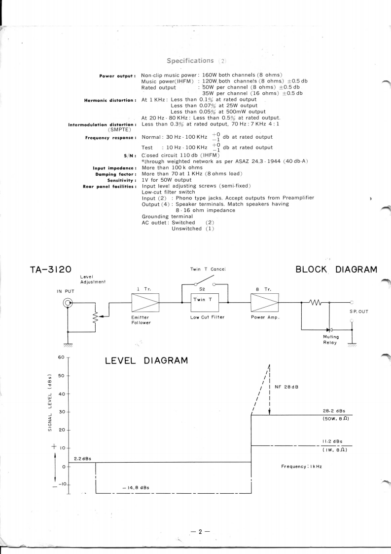 TA3120SONY9SAFETYSTEREO AMPLIFIER3120Specifications(l】System:All Silicon Transistor stereo amplifiercircuit:Quasi-complementary symmetry circuitTransistor2SC401(4),.2SC293(2).2SC299(5),2SD45(8).2sA527(2)D1ode:DS2M(4),S2C(2),1T206(10).SV6(4),2sF-103(sCR)(1)Power requirement:AC 100,117,220,240V,50/60 HzPower consumption:Approx.30W at zero signalApprox.250W at rated outputDimension:180(W)×145(H)×445mm(D)(7%×54×172")Weight:Approx.8 kgs.(17 Ibs,10 ozs.)SONYSERVICING GUIDE